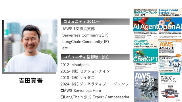 吉田真吾 JAWS-UG横浜支部 Serverless Community(JP) LangChain Community(JP) etc… コミュニティ 2011〜 2012-