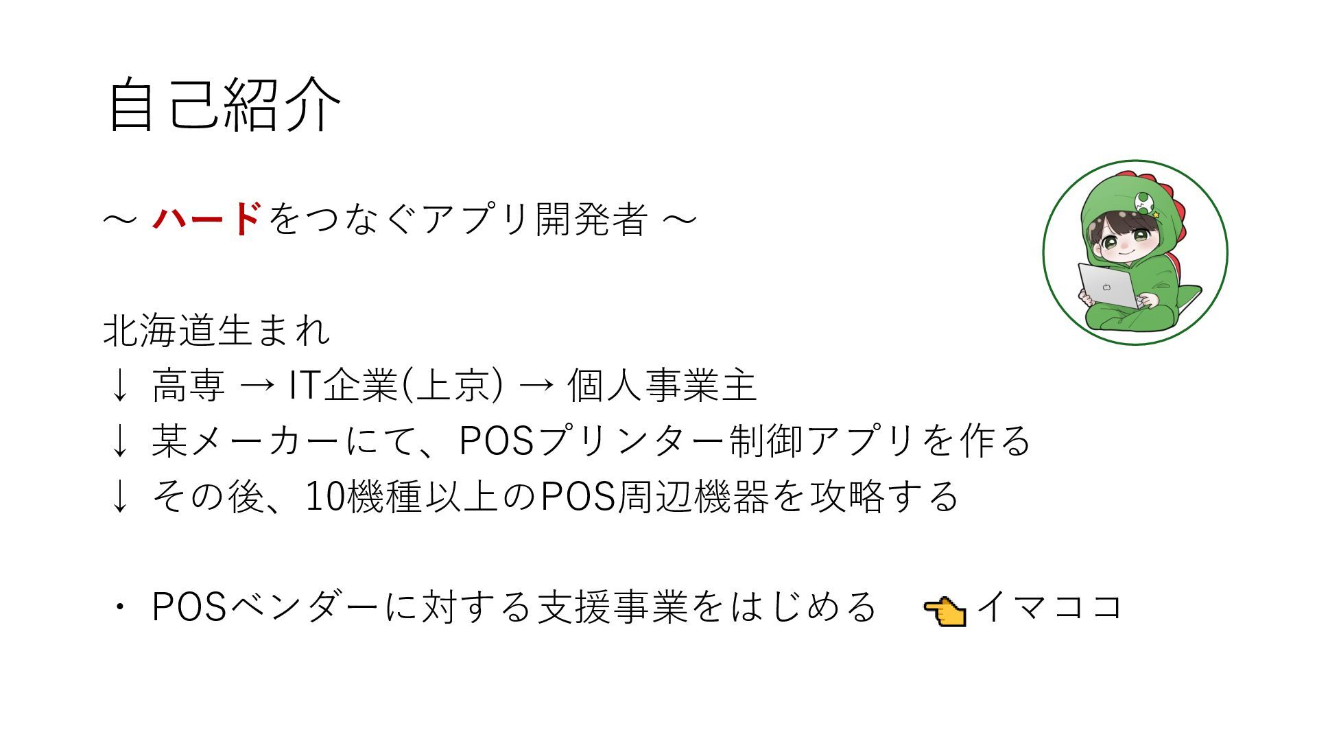 個人事業主 ↓ 某メーカーにて、POSプリンター制御アプリを作る ↓ その後、10機種以上のPOS周辺機器を攻略する ・ POSベンダーに対する支援事業をはじめる イマココ