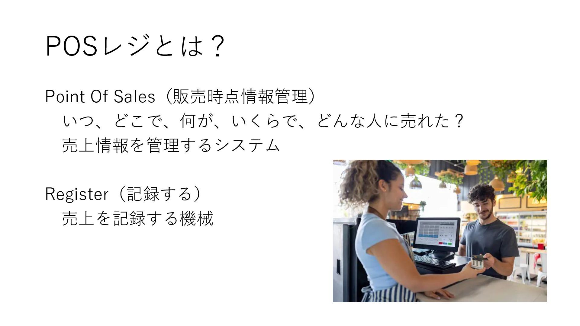 POSレジとは? Point Of Sales(販売時点情報管理) いつ、どこで、何が、いくらで、どんな人に売れた? 売上情報を管理するシステム Register(記録する) 売上を記録する機械