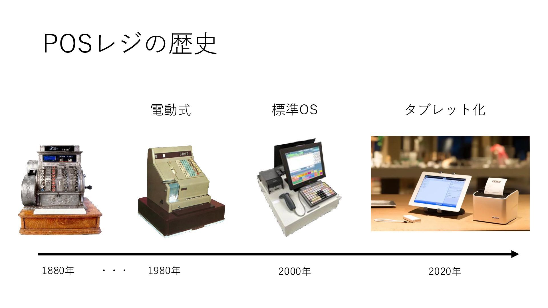 POSレジの歴史 1880年 1980年 2000年 2020年 ・・・ 電動式 標準OS タブレット化