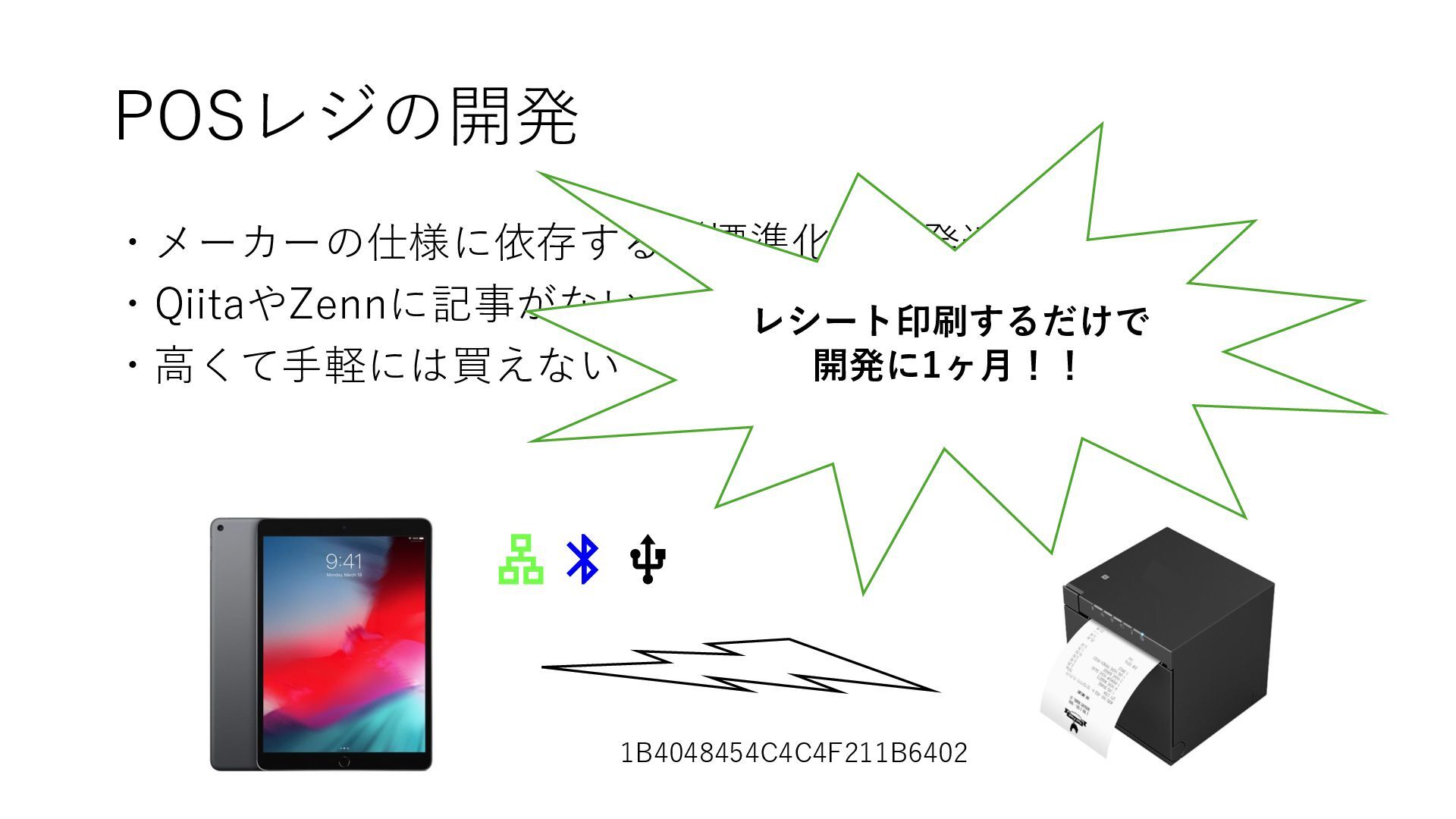 POSレジの開発 ・メーカーの仕様に依存する(標準化が未発達) ・QiitaやZennに記事がない ・高くて手軽には買えない 1B4048454C4C4F211B6402 レシート印刷するだけで 開発に1ヶ月!!