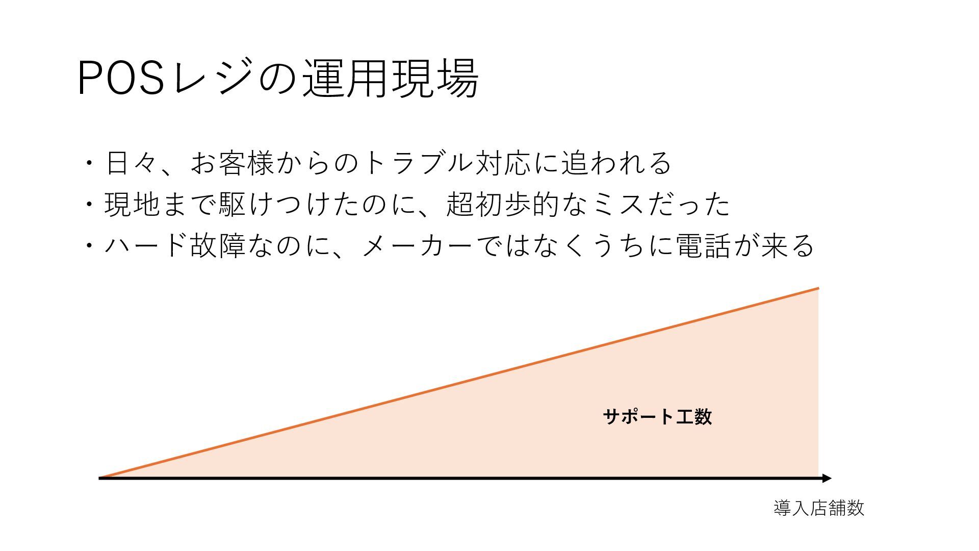 POSレジの運用現場 ・日々、お客様からのトラブル対応に追われる ・現地まで駆けつけたのに、超初歩的なミスだった ・ハード故障なのに、メーカーではなくうちに電話が来る 導入店舗数 サポート工数