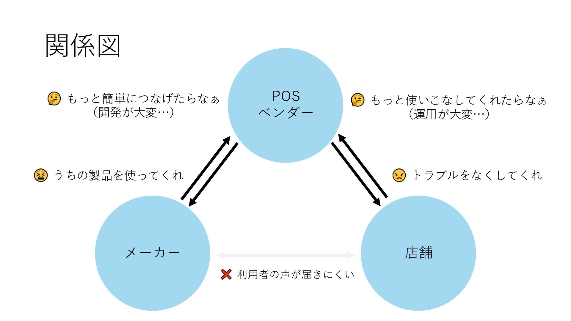 関係図 メーカー POS ベンダー 店舗 利用者の声が届きにくい もっと簡単につなげたらなぁ (開発が大変…) トラブルをなくしてくれ うちの製品を使ってくれ
