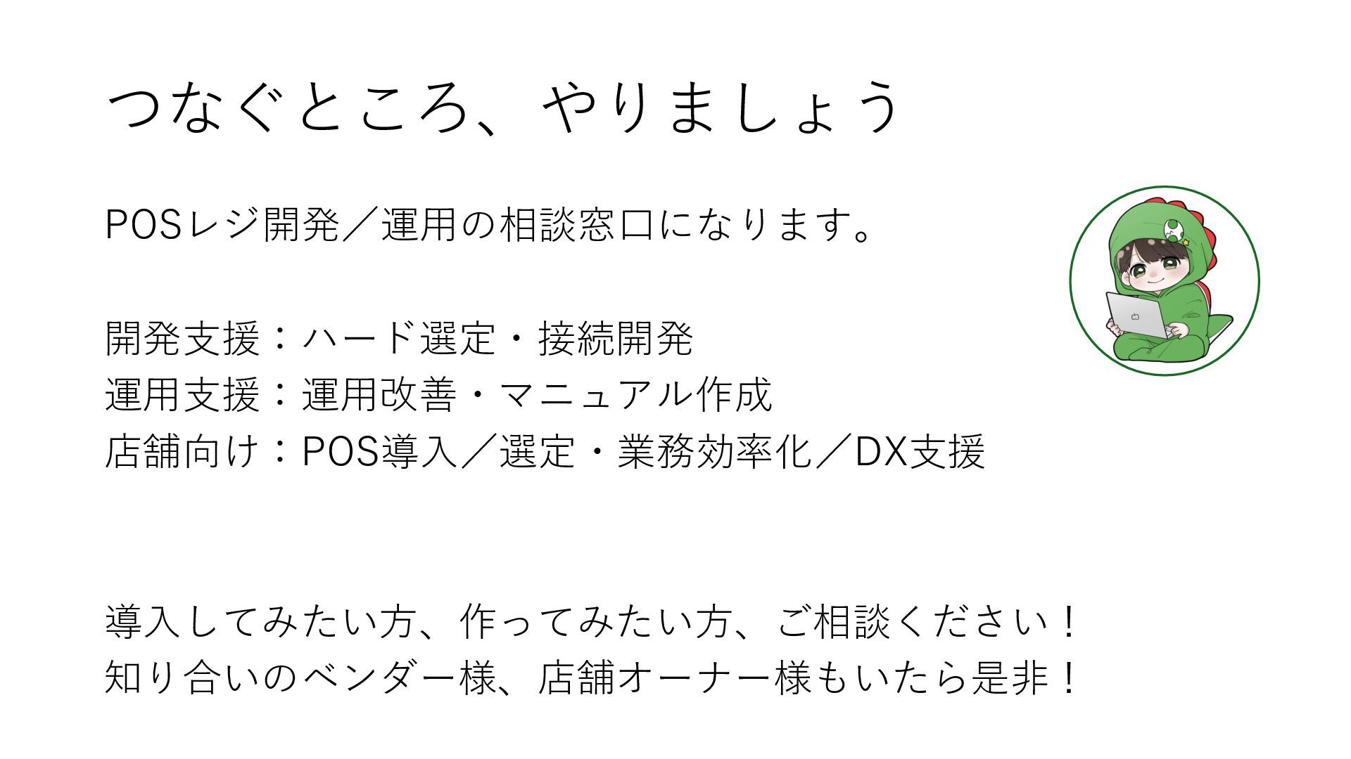 つなぐところ、やりましょう POSレジ開発/運用の相談窓口になります。 開発支援:ハード選定・接続開発 運用支援:運用改善・マニュアル作成 店舗向け:POS導入/選定・業務効率化/DX支援 導入してみたい方、作ってみたい方、ご相談ください! 知り合いのベンダー様、店舗オーナー様もいたら是非!