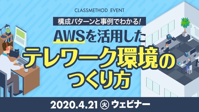 2020年4月21日に開催されたクラスメソッド株式会社主催ウェビナー「構成パターンと事例でわかる!AWSを活用したテレワーク環境のつくり方」で発表した資料です。 AWS を活用したテレワークパターンを紹介しています。