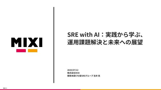 ©MIXI SRE with AI:実践から学ぶ、 運⽤課題解決と未来への展望 2025/07/12 株式会社MIXI 開発本部CTO室SREグループ 吉井 亮