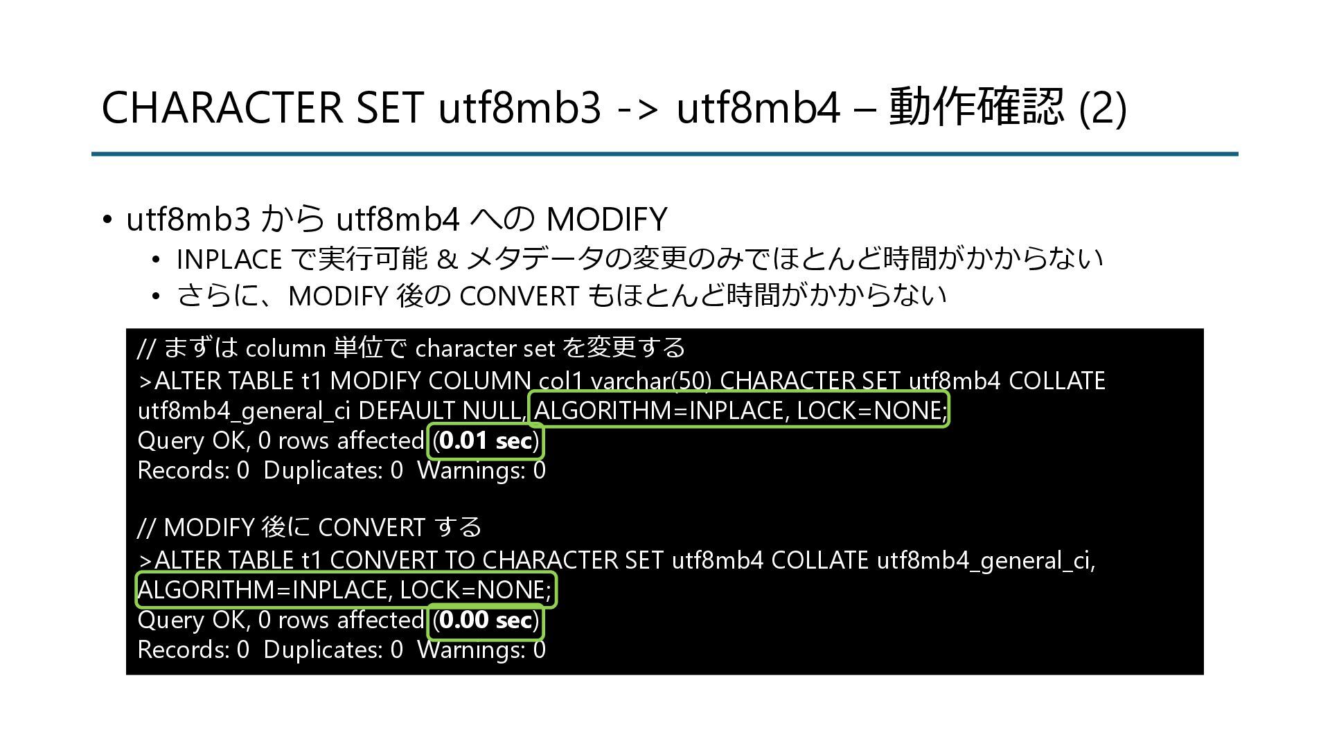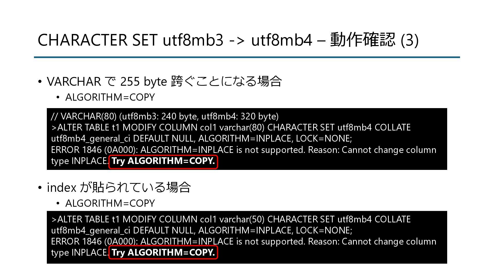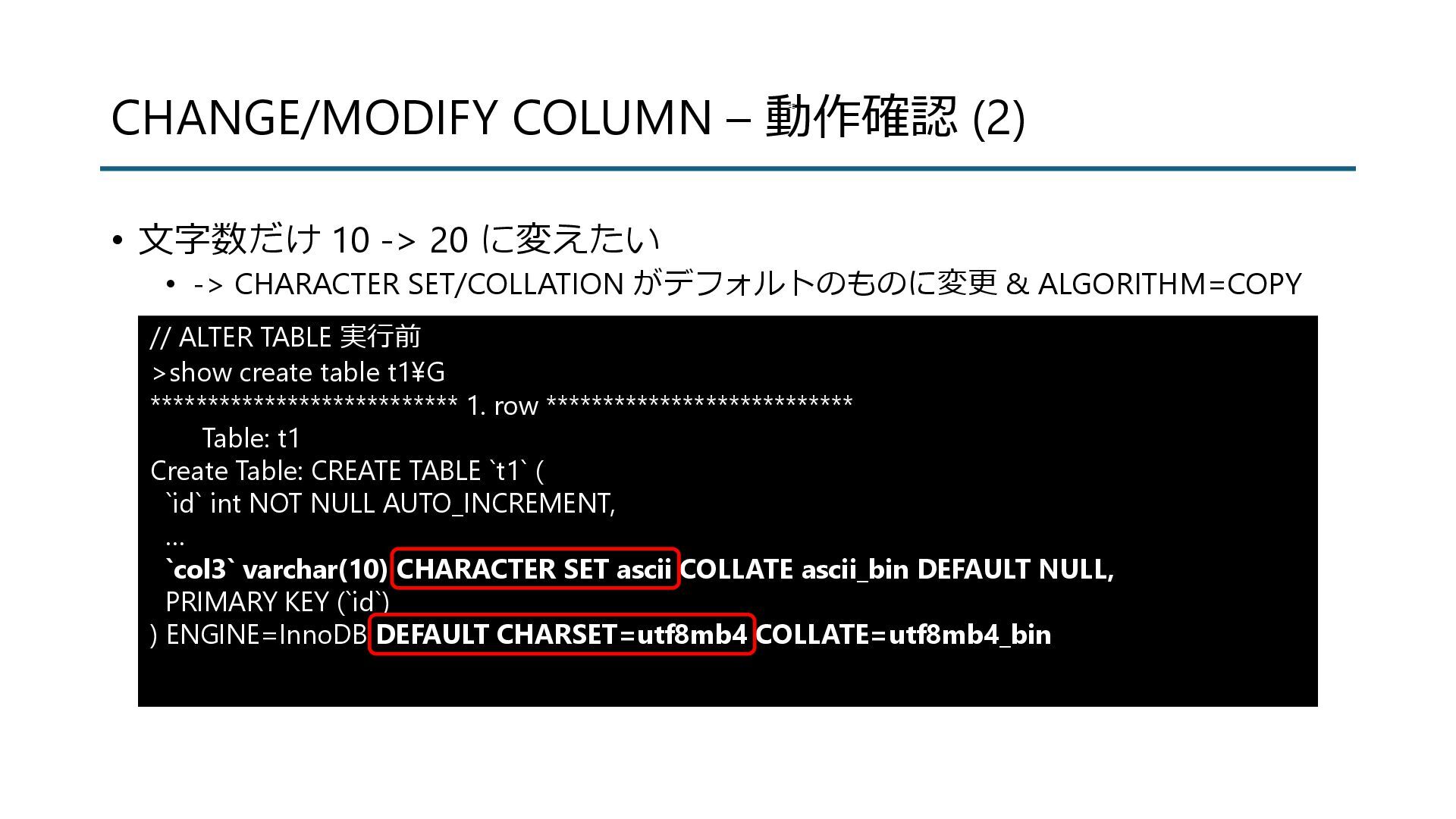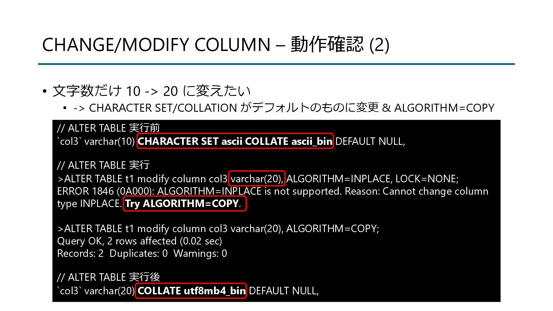 に変えたい • -> CHARACTER SET/COLLATION がデフォルトのものに変更 & ALGORITHM=COPY // ALTER TABLE 実行前 `col3` varchar(10) CHARACTER SET ascii COLLATE ascii_bin DEFAULT NULL, // ALTER TABLE 実行 >ALTER TABLE t1 modify column col3 varchar(20), ALGORITHM=INPLACE, LOCK=NONE; ERROR 1846 (0A000): ALGORITHM=INPLACE is not supported. Reason: Cannot change column type INPLACE. Try ALGORITHM=COPY. >ALTER TABLE t1 modify column col3 varchar(20), ALGORITHM=COPY; Query OK, 2 rows affected (0.02 sec) Records: 2 Duplicates: 0 Warnings: 0 // ALTER TABLE 実行後 `col3` varchar(20) COLLATE utf8mb4_bin DEFAULT NULL,