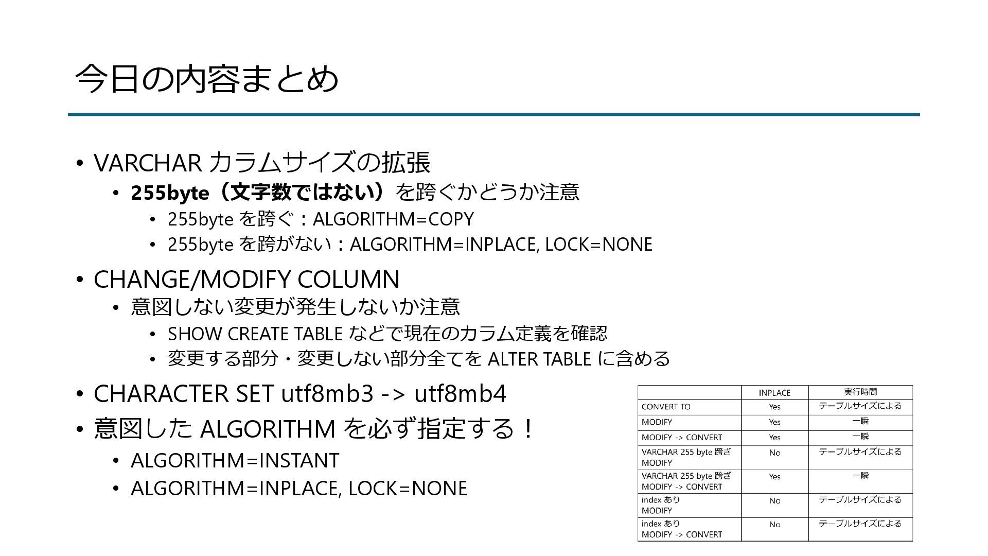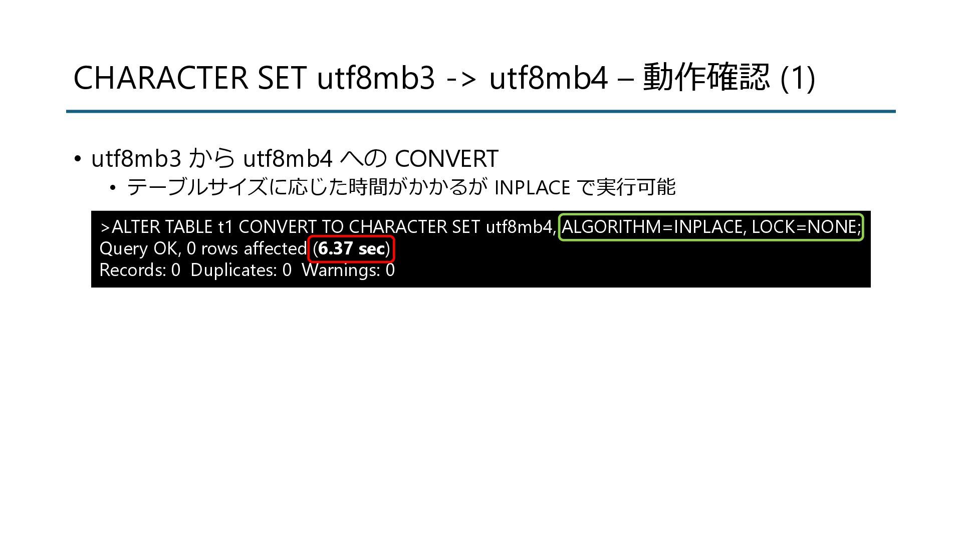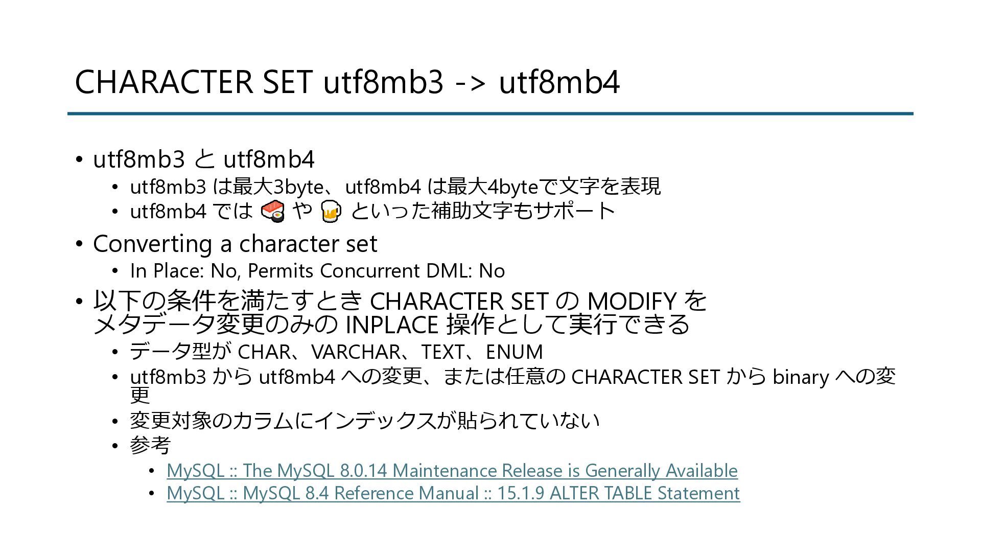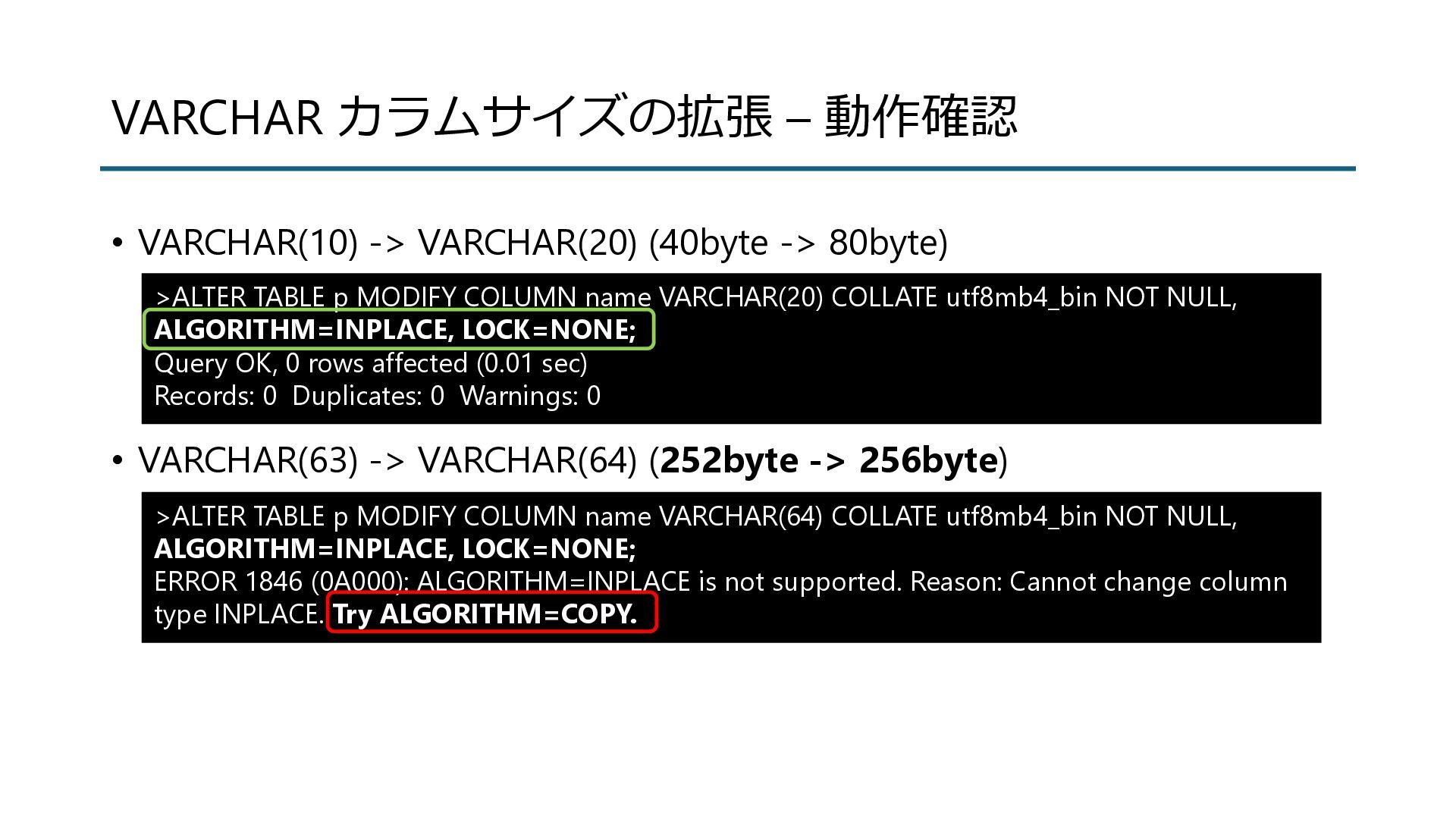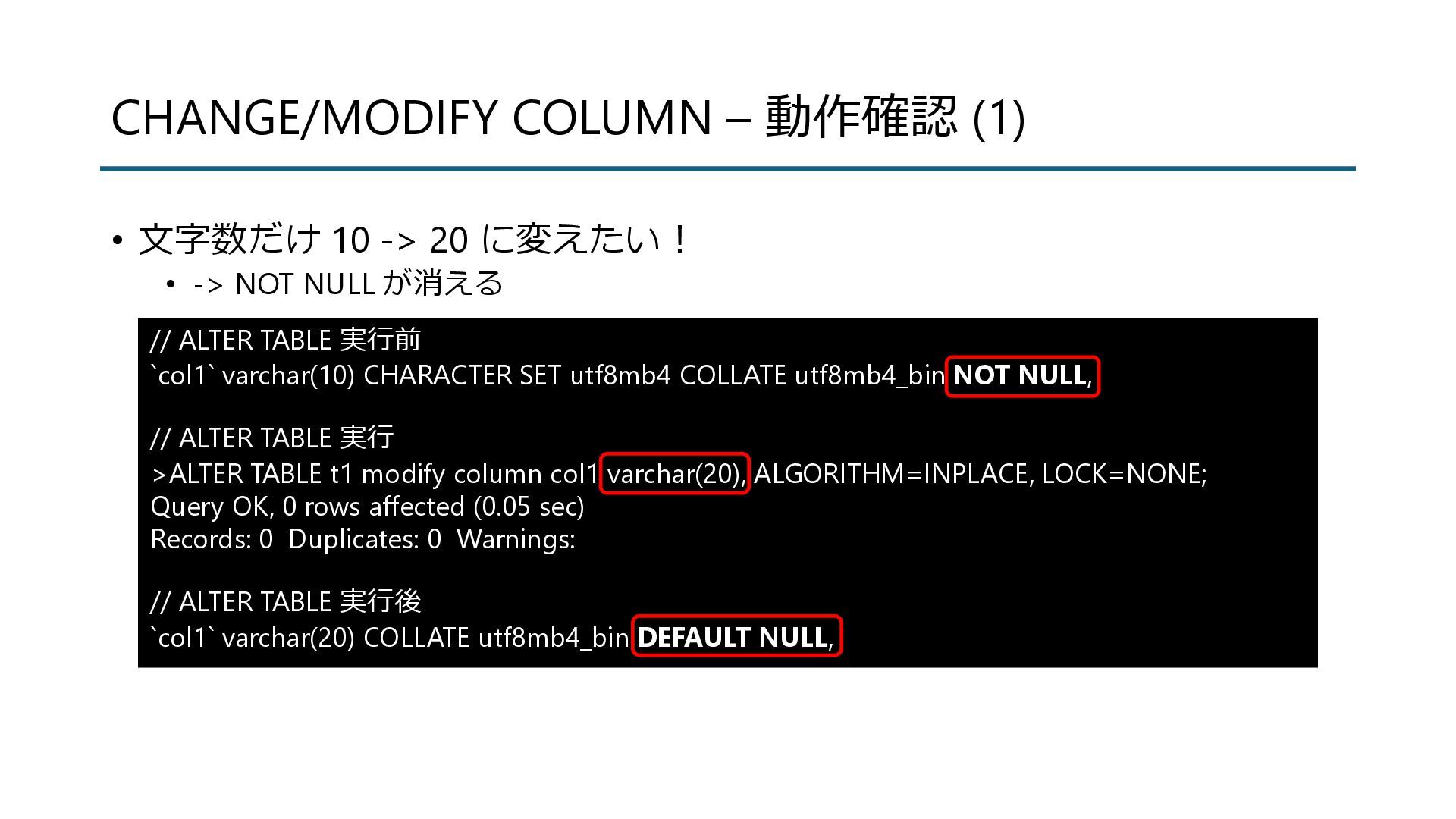 に変えたい • -> CHARACTER SET/COLLATION がデフォルトのものに変更 & ALGORITHM=COPY // ALTER TABLE 実行前 `col3` varchar(10) CHARACTER SET ascii COLLATE ascii_bin DEFAULT NULL, // ALTER TABLE 実行 >ALTER TABLE t1 modify column col3 varchar(20), ALGORITHM=INPLACE, LOCK=NONE; ERROR 1846 (0A000): ALGORITHM=INPLACE is not supported. Reason: Cannot change column type INPLACE. Try ALGORITHM=COPY. >ALTER TABLE t1 modify column col3 varchar(20), ALGORITHM=COPY; Query OK, 2 rows affected (0.02 sec) Records: 2 Duplicates: 0 Warnings: 0 // ALTER TABLE 実行後 `col3` varchar(20) COLLATE utf8mb4_bin DEFAULT NULL,