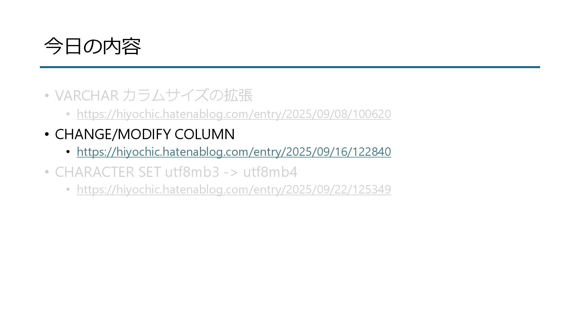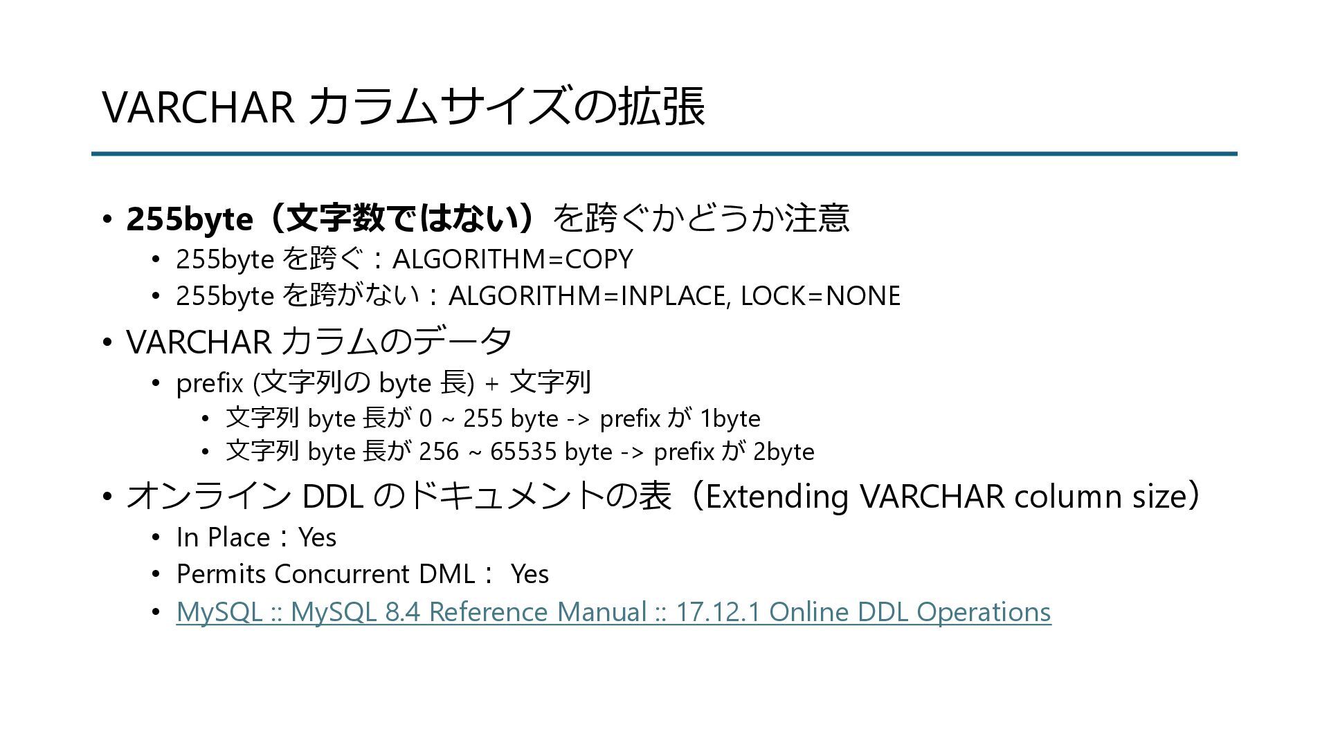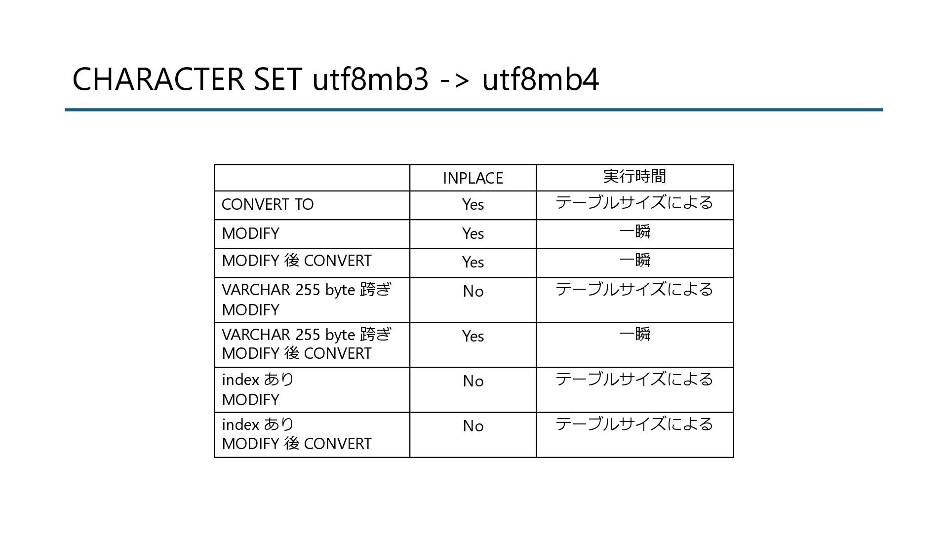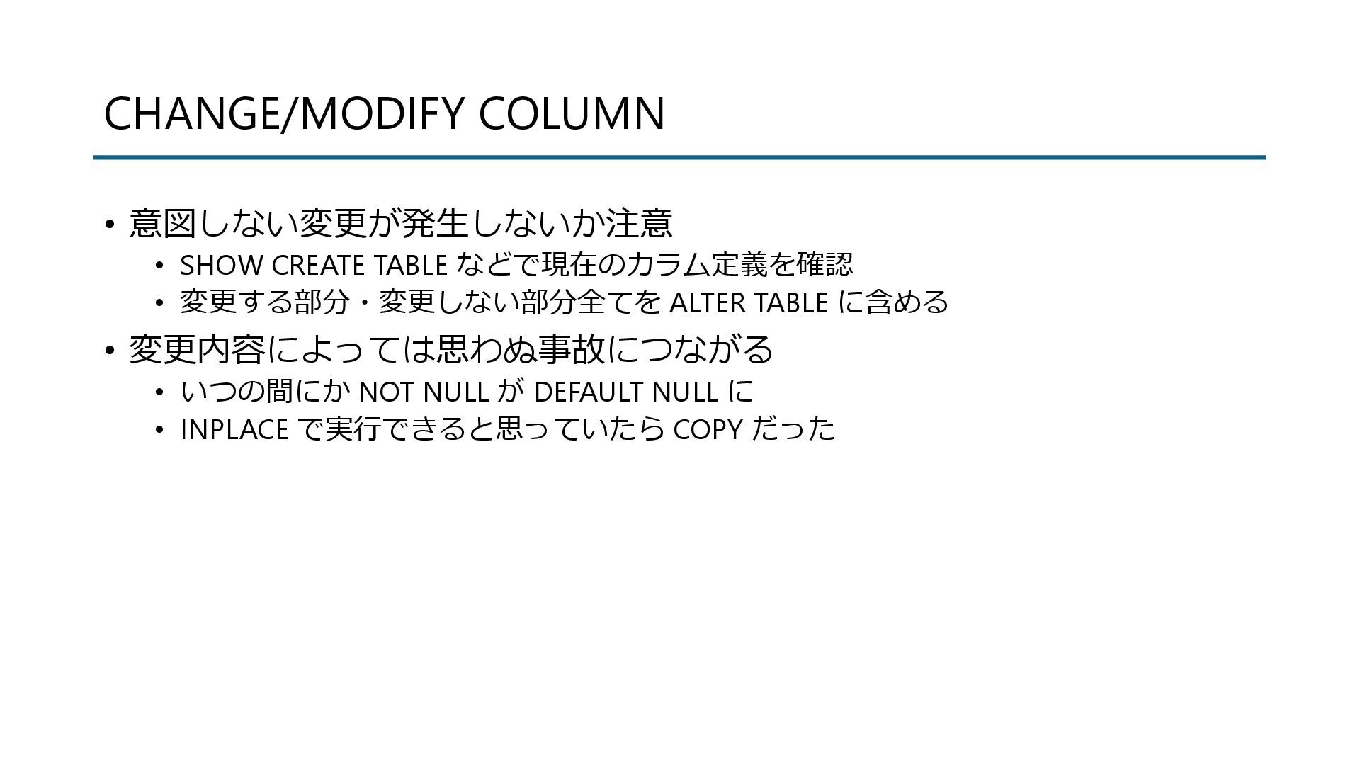 に変えたい • -> CHARACTER SET/COLLATION がデフォルトのものに変更 & ALGORITHM=COPY // ALTER TABLE 実行前 `col3` varchar(10) CHARACTER SET ascii COLLATE ascii_bin DEFAULT NULL, // ALTER TABLE 実行 >ALTER TABLE t1 modify column col3 varchar(20), ALGORITHM=INPLACE, LOCK=NONE; ERROR 1846 (0A000): ALGORITHM=INPLACE is not supported. Reason: Cannot change column type INPLACE. Try ALGORITHM=COPY. >ALTER TABLE t1 modify column col3 varchar(20), ALGORITHM=COPY; Query OK, 2 rows affected (0.02 sec) Records: 2 Duplicates: 0 Warnings: 0 // ALTER TABLE 実行後 `col3` varchar(20) COLLATE utf8mb4_bin DEFAULT NULL,
