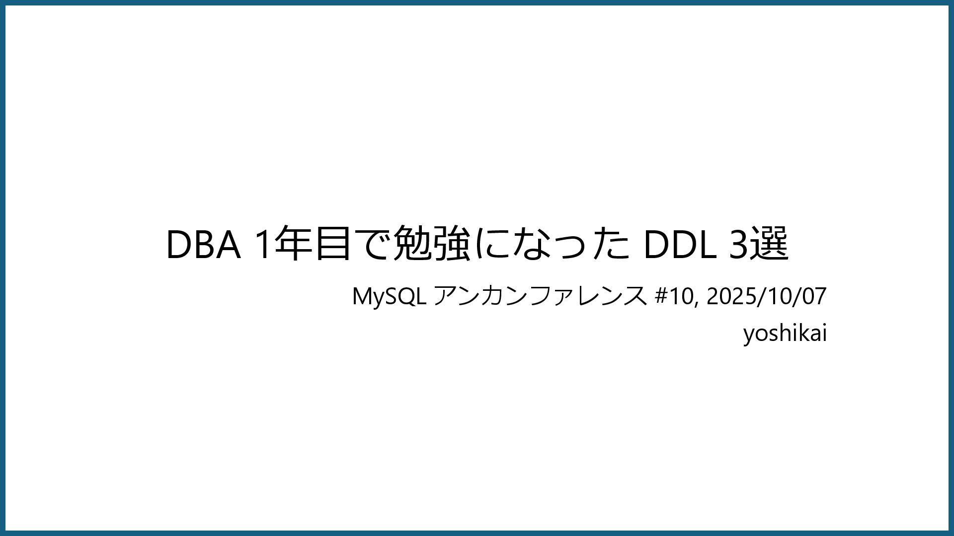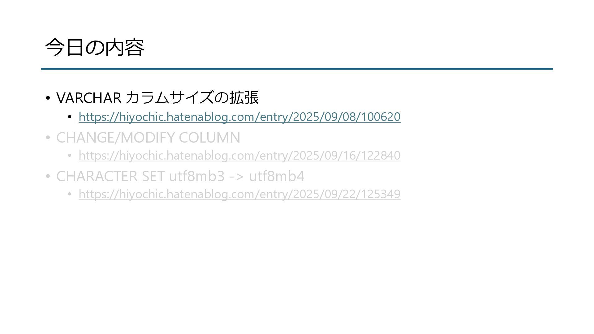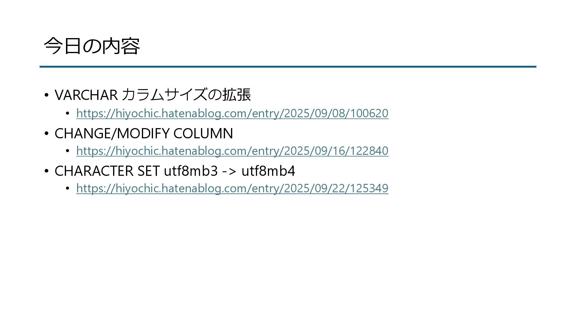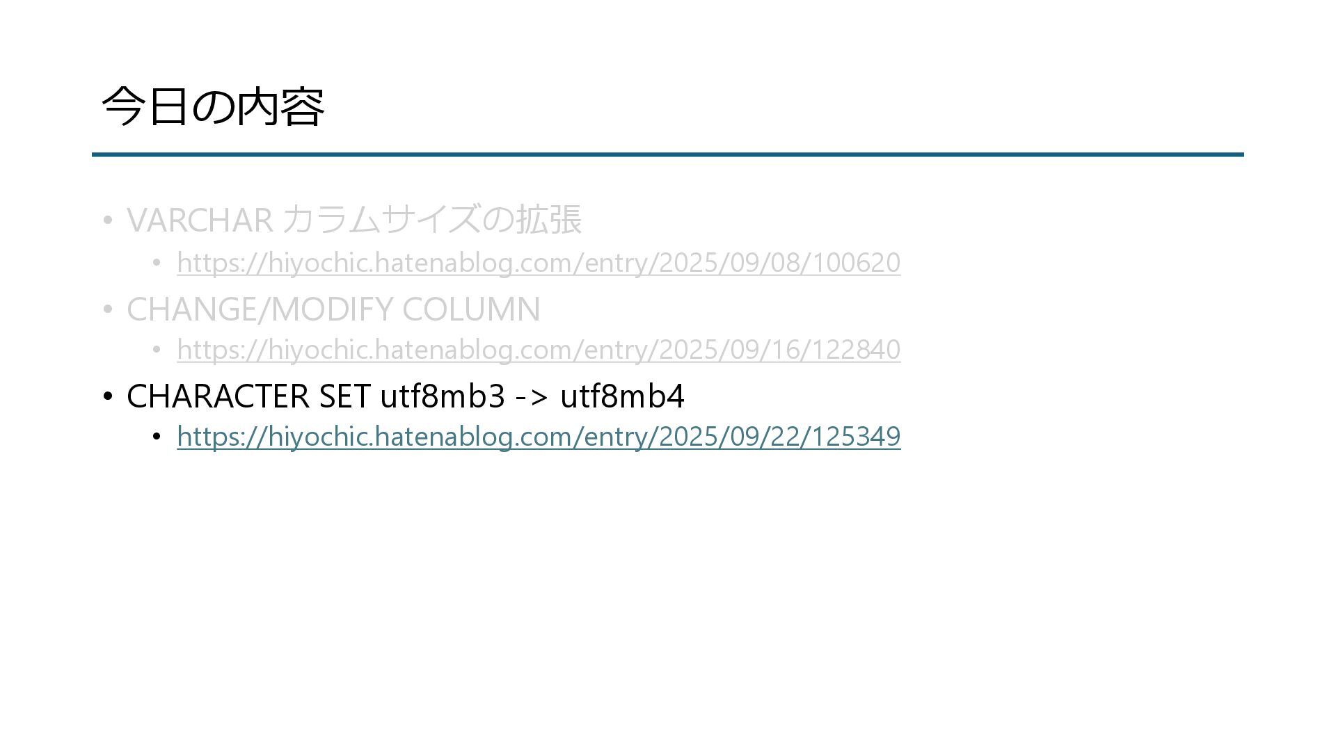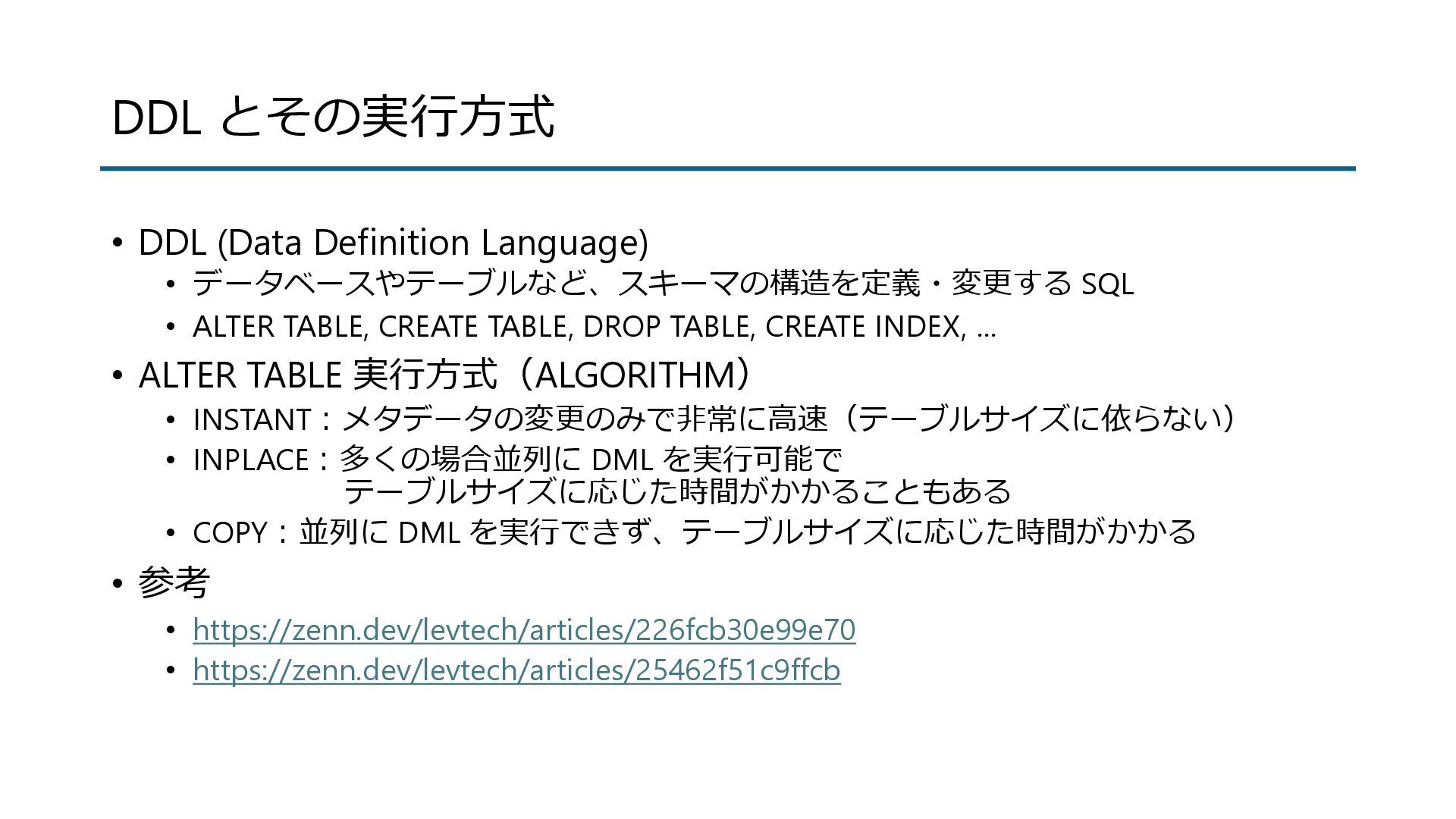 に変えたい • -> CHARACTER SET/COLLATION がデフォルトのものに変更 & ALGORITHM=COPY // ALTER TABLE 実行前 `col3` varchar(10) CHARACTER SET ascii COLLATE ascii_bin DEFAULT NULL, // ALTER TABLE 実行 >ALTER TABLE t1 modify column col3 varchar(20), ALGORITHM=INPLACE, LOCK=NONE; ERROR 1846 (0A000): ALGORITHM=INPLACE is not supported. Reason: Cannot change column type INPLACE. Try ALGORITHM=COPY. >ALTER TABLE t1 modify column col3 varchar(20), ALGORITHM=COPY; Query OK, 2 rows affected (0.02 sec) Records: 2 Duplicates: 0 Warnings: 0 // ALTER TABLE 実行後 `col3` varchar(20) COLLATE utf8mb4_bin DEFAULT NULL,