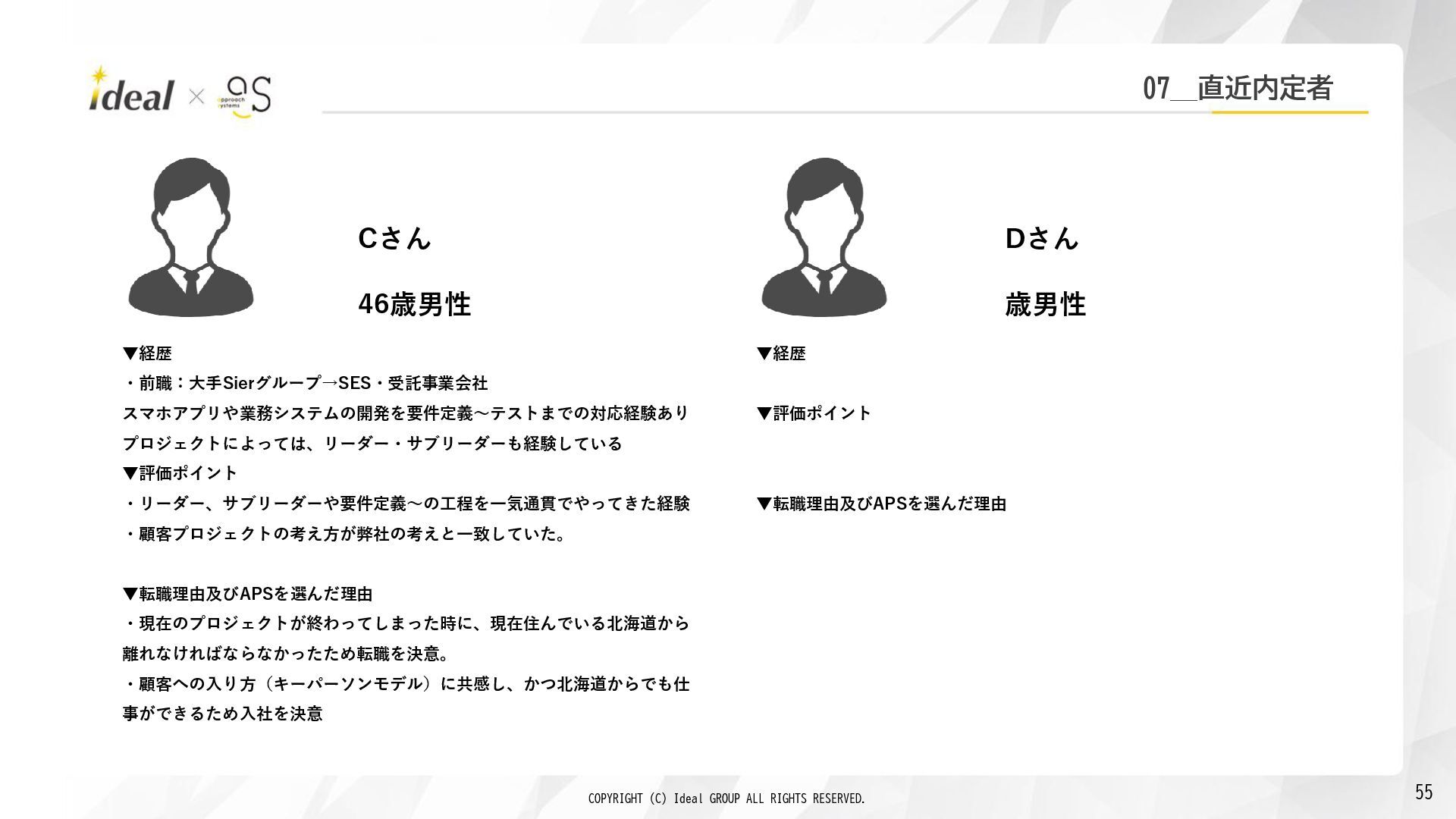 ・前職:保険会社のシステム中核会社 損保系のシステムにて顧客へのヒアリングから要件定義、設計、開発、テ ストおよび開発工程管理の経験 約 35-45 名規模のプロジェクトのサブリーダーとして、全体の進捗管理や マネジメン トを経験。 ▼評価ポイント ・上流工程を担当しており、開発力を向上させていきたい。強い開発力を 持って上流に戻ることでより良いシステム開発ができるという志向性 ・将来的にITコンサルにチャレンジしたいという意欲とそれに伴う素養が あった点 ▼転職理由及びAPSを選んだ理由 ・将来的にITコンサルにチャレンジするための土壌が整っている(研修と 優秀な人材) Bさん 25歳女性 Aさん 26歳女性 ▼経歴 ・前職:大手Sierのグループ会社 Java等を用いた金融系のシステム開発を要件定義から一貫して経験 サブリーダーとしてメンバーのマネジメント業務(進捗管理/品質管理) ▼評価ポイント ・直近しばらく上流工程を担当しており、的確な開発指示を出すことが出来ず、 改めて開発について力をつけてからPML、PMにチャレンジしたいという方向 性が弊社と合っていた。 ・顧客と調整するために充分なコミュニケーション能力がある ・責任感が強く炎上案件にも臆さず対応をしている。 ▼APSを選んだ理由 ・開発力を身につけてからPLやPMに挑戦していける環境がある。 ・金融の経験のみだったが、それ以外の業界を経験出来る。