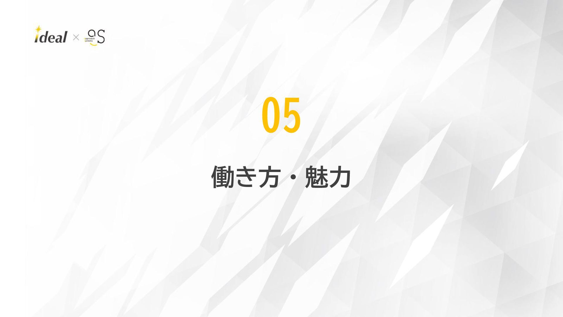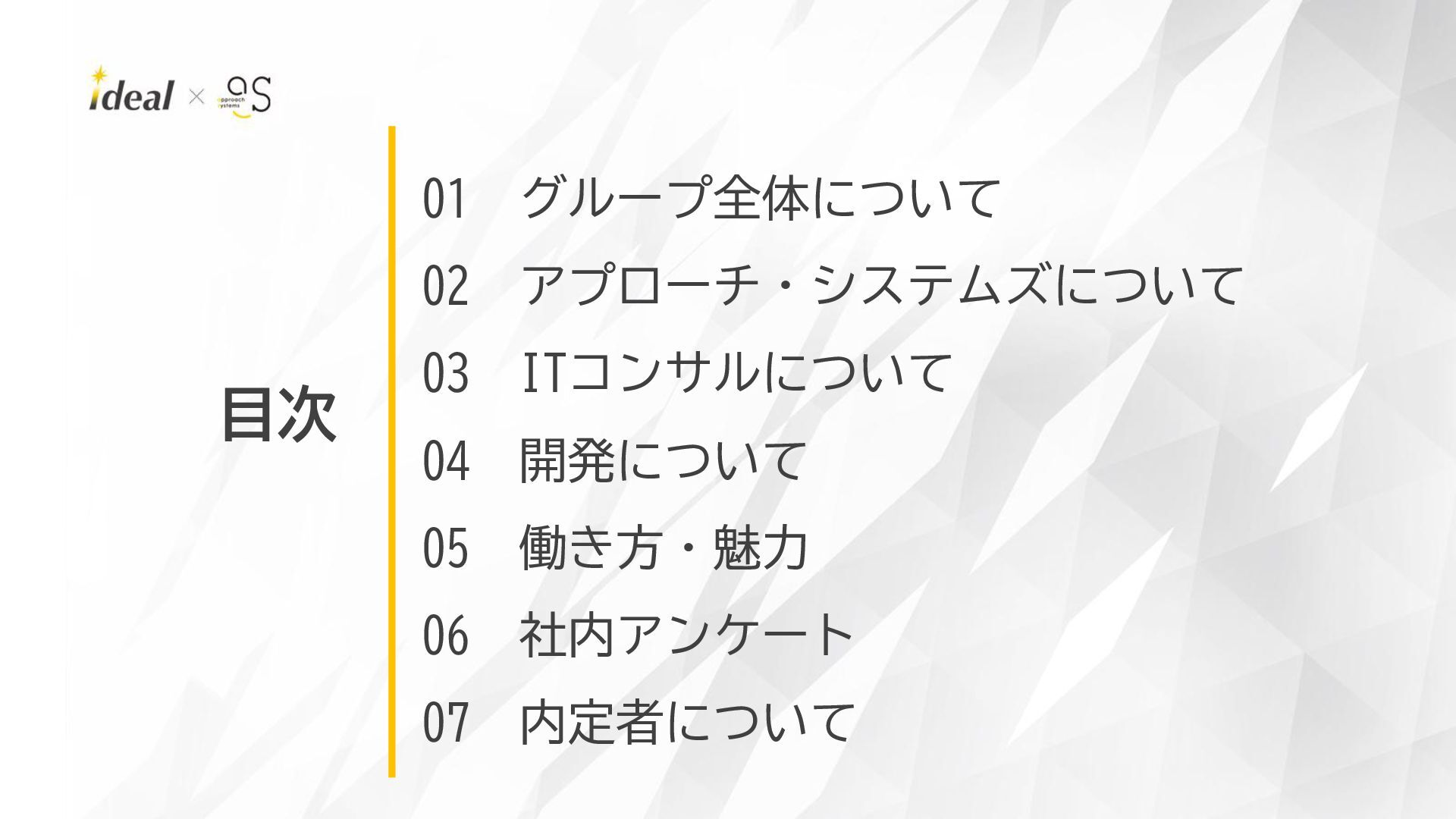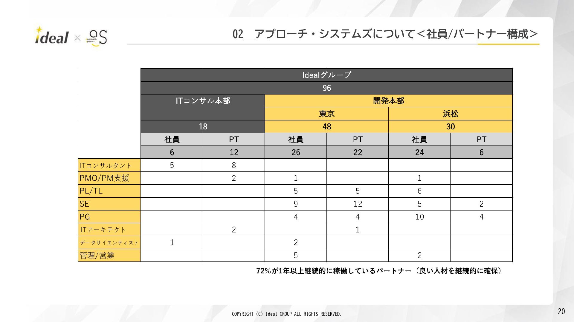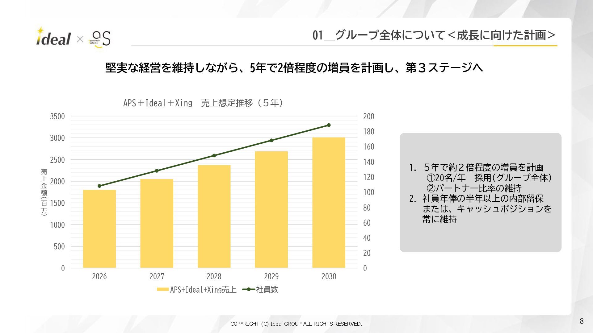 40 60 80 100 120 140 160 180 200 0 500 1000 1500 2000 2500 3000 3500 2026 2027 2028 2029 2030 売 上 金 額 ( 百 万 ) APS+Ideal+Xing 売上想定推移(5年) APS+Ideal+Xing売上 社員数 01_グループ全体について<成長に向けた計画> 1.5年で約2倍程度の増員を計画 ①20名/年 採用(グループ全体) ②パートナー比率の維持 2.社員年俸の半年以上の内部留保 または、キャッシュポジションを 常に維持 堅実な経営を維持しながら、5年で2倍程度の増員を計画し、第3ステージへ