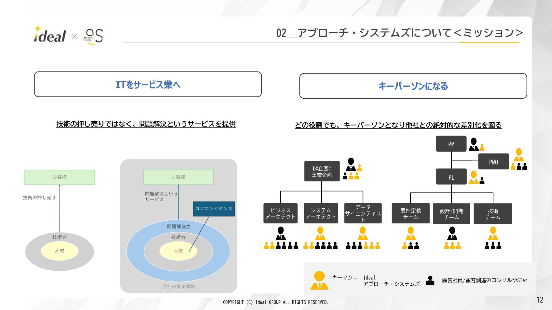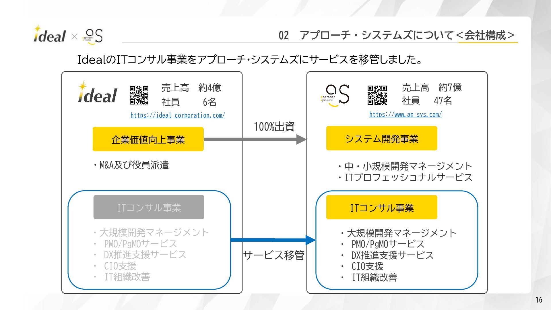 IT組織改善 ・M&A及び役員派遣 売上高 約4億 売上高 約7億 100%出資 https://www.ap-sys.com/ https://www.ap-sys.com/ 社員 6名 社員 47名 https://ideal-corporation.com/ https://ideal-corporation.com/ ・中・小規模開発マネージメント ・ITプロフェッショナルサービス システム開発事業 ITコンサル事業 ITコンサル事業 企業価値向上事業 サービス移管 IdealのITコンサル事業をアプローチ・システムズにサービスを移管しました。 ・大規模開発マネージメント ・ PMO/PgMOサービス ・ DX推進支援サービス ・ CIO支援 ・ IT組織改善