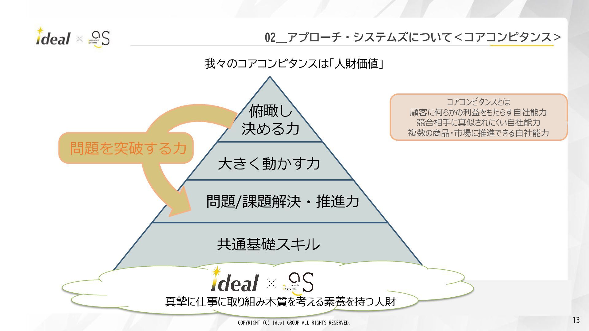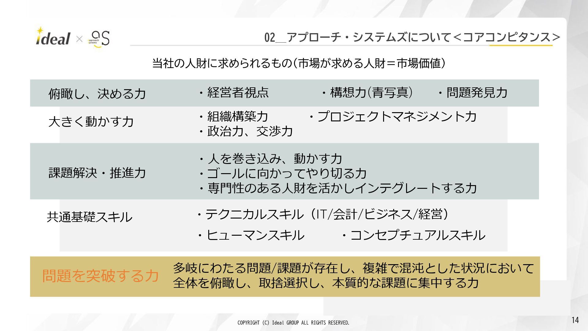 ・テクニカルスキル(IT/会計/ビジネス/経営) ・組織構築力 ・プロジェクトマネジメント力 ・政治力、交渉力 ・構想力(青写真) ・ヒューマンスキル 俯瞰し、決める力 共通基礎スキル 課題解決・推進力 大きく動かす力 ・コンセプチュアルスキル ・人を巻き込み、動かす力 ・ゴールに向かってやり切る力 ・専門性のある人財を活かしインテグレートする力 多岐にわたる問題/課題が存在し、複雑で混沌とした状況において 全体を俯瞰し、取捨選択し、本質的な課題に集中する力 問題を突破する力 ・問題発見力 02_アプローチ・システムズについて<コアコンピタンス>