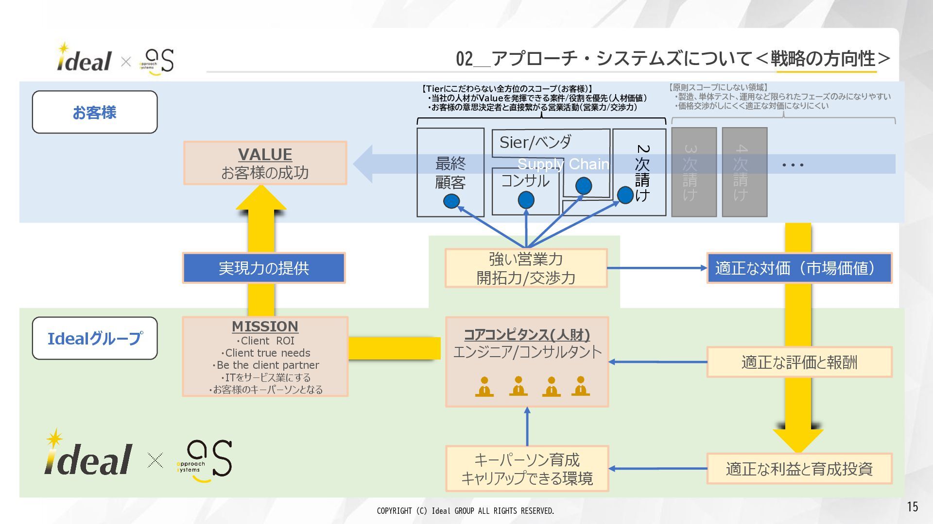 14. 02_アプローチ・システムズについて<サービス領域> • お客様の成功に向け、お客様社内の役割に踏み込んだ支援を実現 • ITコンサル×開発で、システム構築の全領域をカバーすることが可能 COPYRIGHT (C) Ideal GROUP ALL