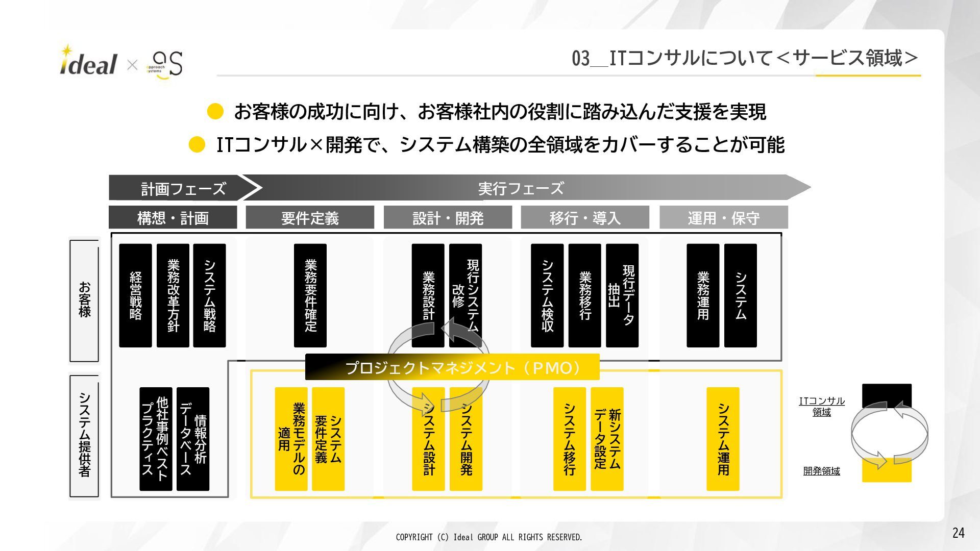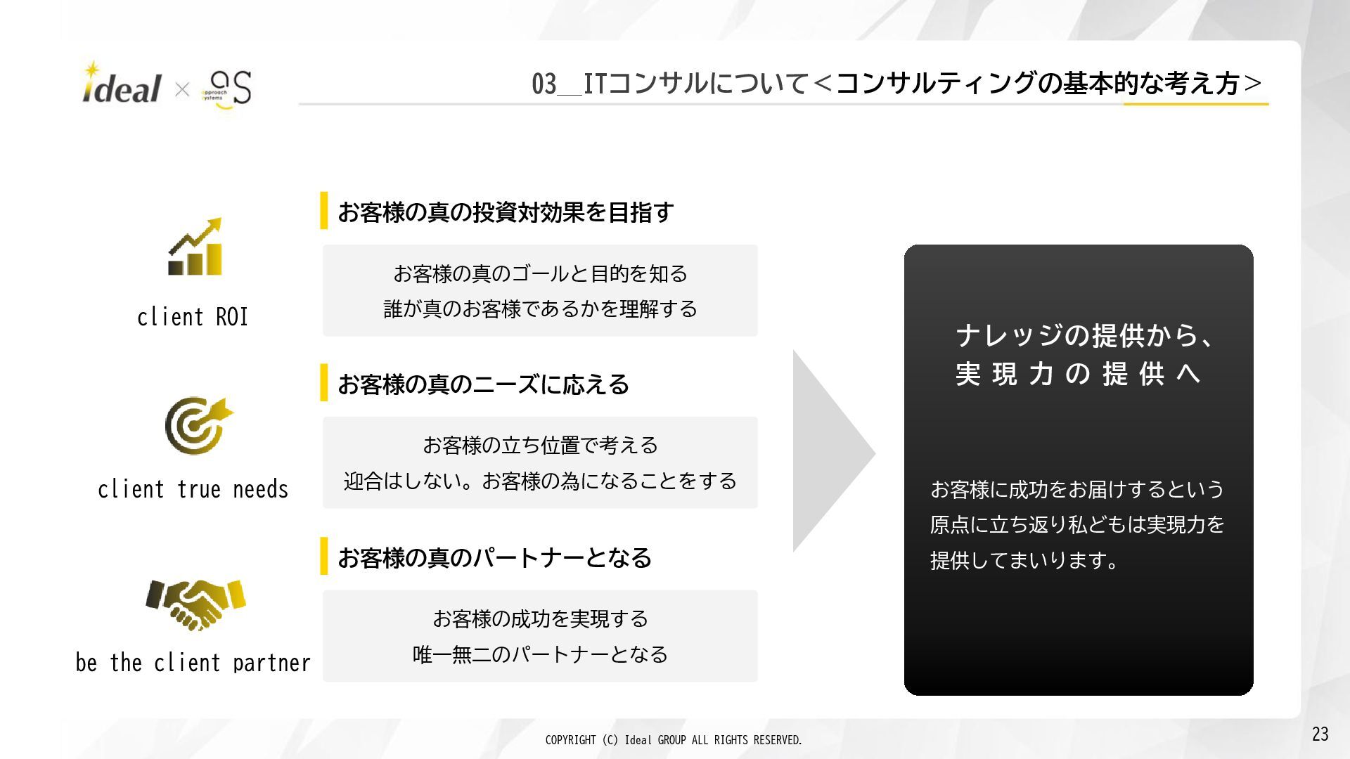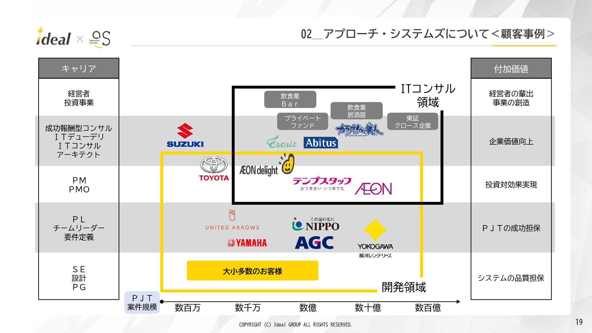 18. 03_ITコンサルについて<サービス領域> • お客様の成功に向け、お客様社内の役割に踏み込んだ支援を実現 • ITコンサル×開発で、システム構築の全領域をカバーすることが可能 COPYRIGHT (C) Ideal GROUP ALL