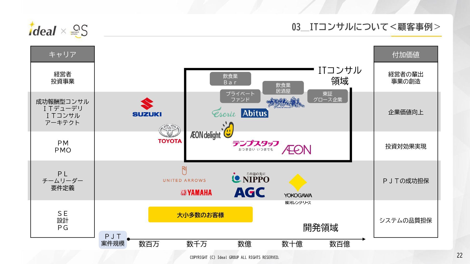 コンサル Sier/ベンダ 2 次 請 け 3 次 請 け 4 次 請 け ・・・ 【原則スコープにしない領域】 ・製造、単体テスト、運用など限られたフェーズのみになりやすい ・価格交渉がしにくく適正な対価になりにくい お客様 実現力の提供 VALUE お客様の成功 コアコンピタンス(人財) エンジニア/コンサルタント Idealグループ 適正な対価(市場価値) MISSION ・Client ROI ・Client true needs ・Be the client partner ・ITをサービス業にする ・お客様のキーパーソンとなる 適正な評価と報酬 適正な利益と育成投資 キーパーソン育成 キャリアップできる環境 強い営業力 開拓力/交渉力 【Tierにこだわらない全方位のスコープ(お客様)】 ・当社の人材がValueを発揮できる案件/役割を優先(人材価値) ・お客様の意思決定者と直接繋がる営業活動(営業力/交渉力) Supply Chain 02_アプローチ・システムズについて<戦略の方向性>