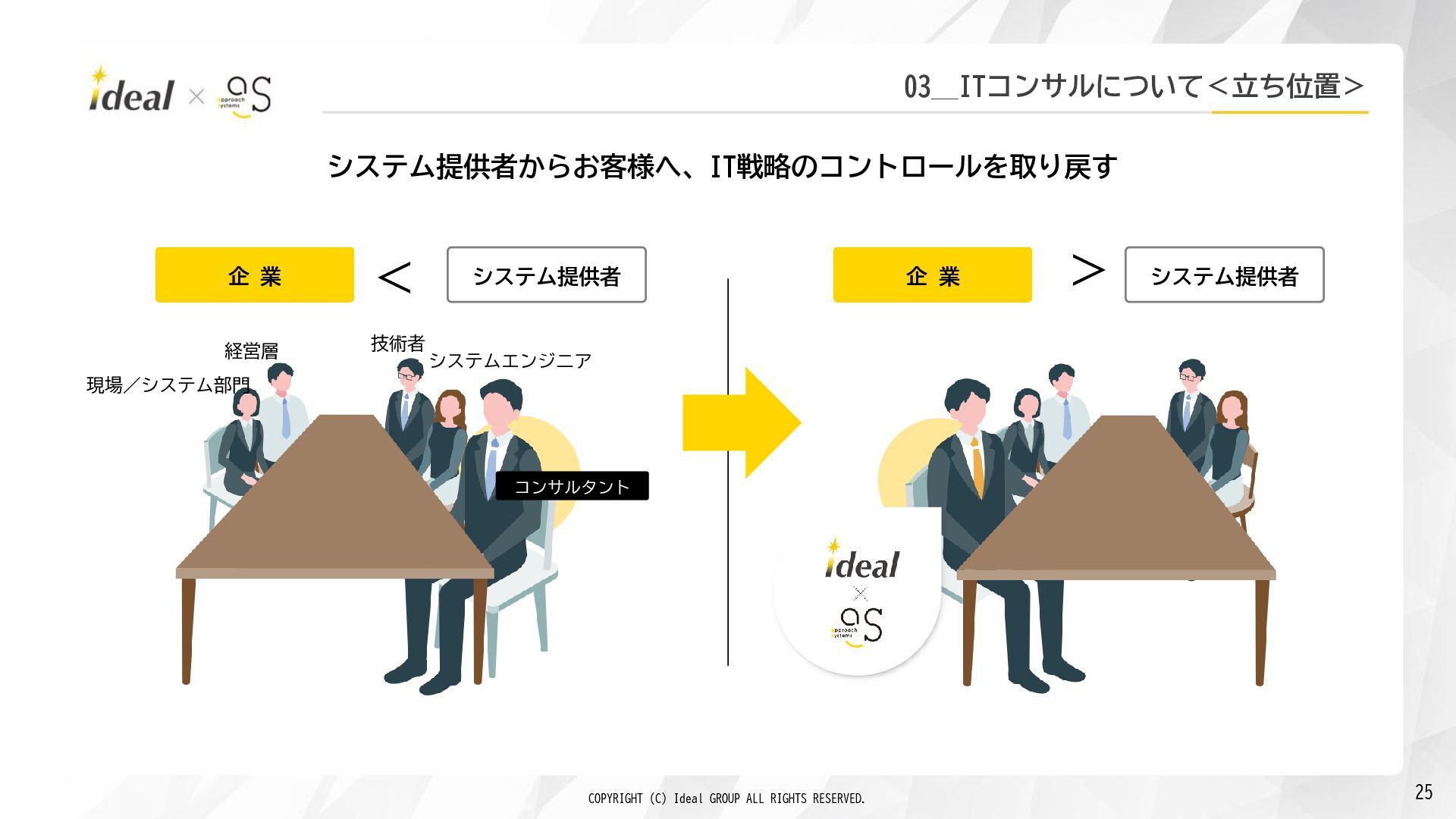 19. COPYRIGHT (C) Ideal GROUP ALL RIGHTS RESERVED. 03_ITコンサルについて<立ち位置> システム提供者からお客様へ、IT戦略のコントロールを取り戻す <