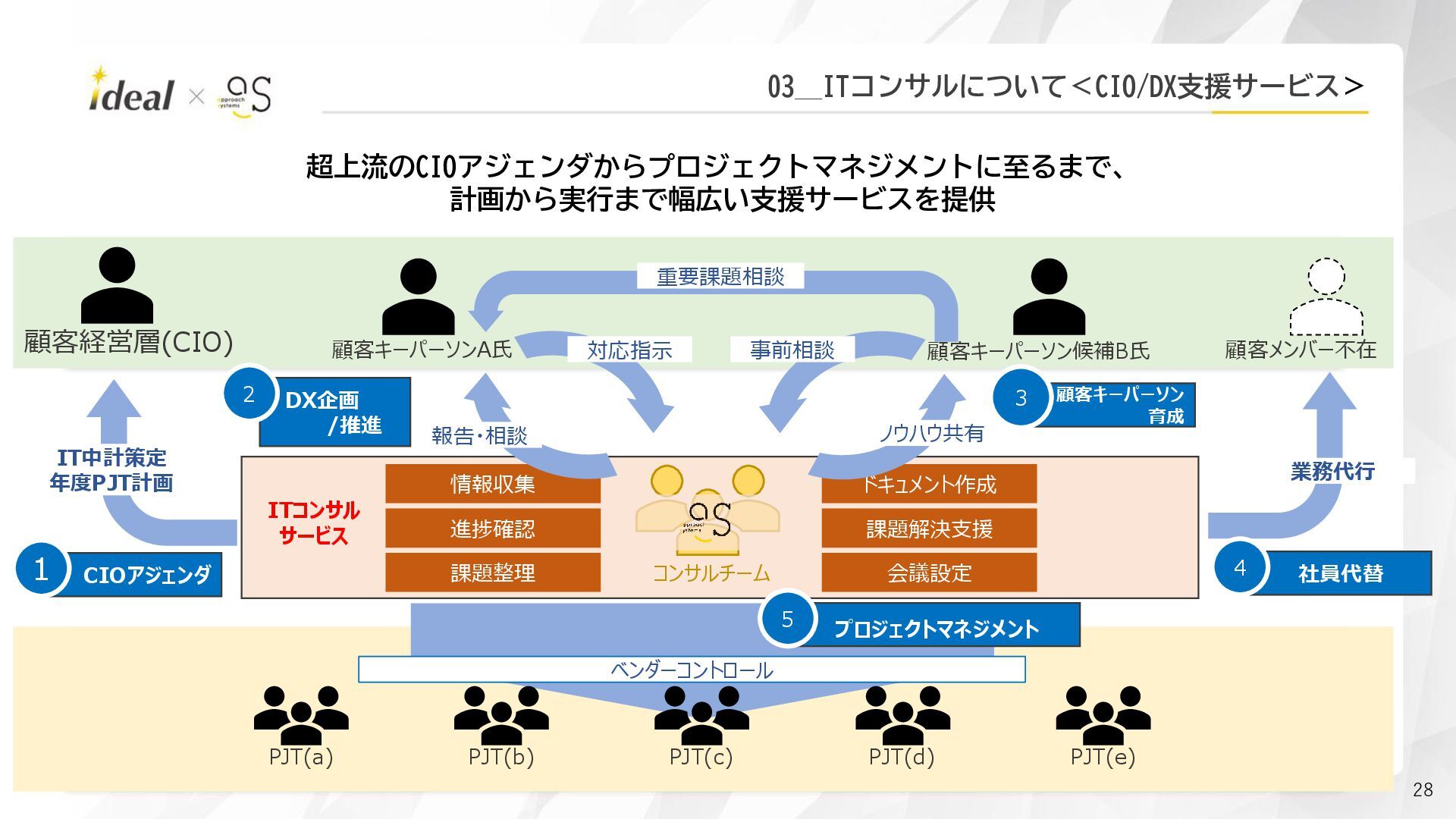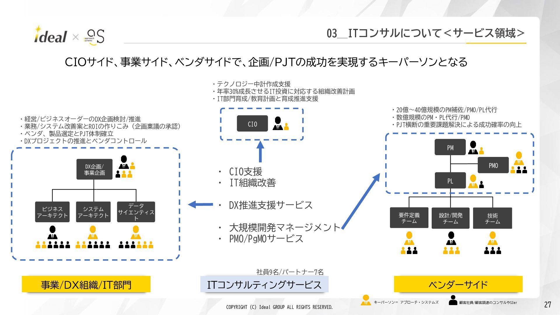 20. 03_ITコンサルについて<サービス領域> 27 COPYRIGHT (C) Ideal GROUP ALL RIGHTS RESERVED. CIOサイド、事業サイド、ベンダサイドで、企画/PJTの成功を実現するキーパーソンとなる