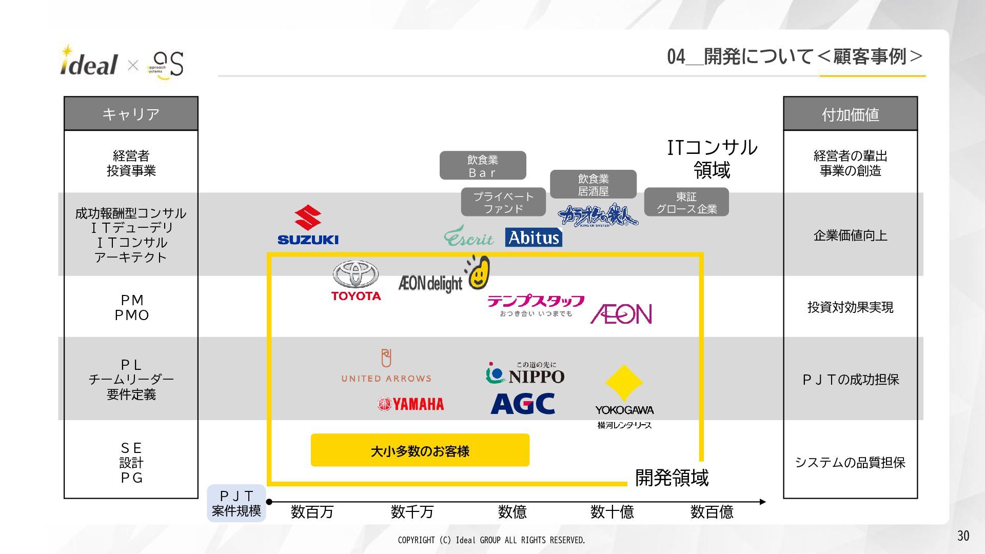 ITデューデリ ITコンサル アーキテクト 企業価値向上 経営者 投資事業 経営者の輩出 事業の創造 SE 設計 PG システムの品質担保 キャリア 付加価値 PJT 案件規模 数百万 数千万 数億 数十億 数百億 飲食業 Bar プライベート ファンド 飲食業 居酒屋 東証 グロース企業 大小多数のお客様 ITコンサル 領域 開発領域 COPYRIGHT (C) Ideal GROUP ALL RIGHTS RESERVED.