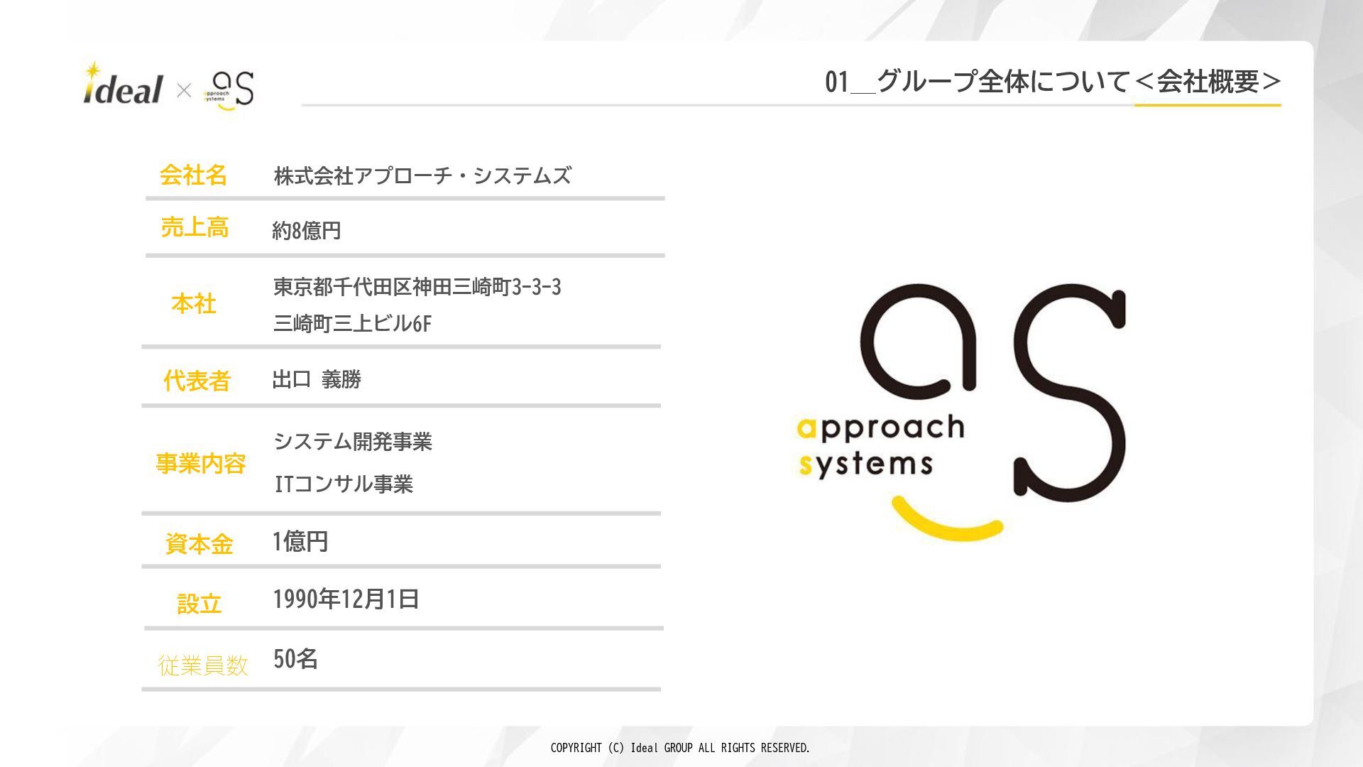 3. 6 COPYRIGHT (C) Ideal GROUP ALL RIGHTS RESERVED. Ideal(2011年創業) とアプローチ・システムズ(1990年創業)