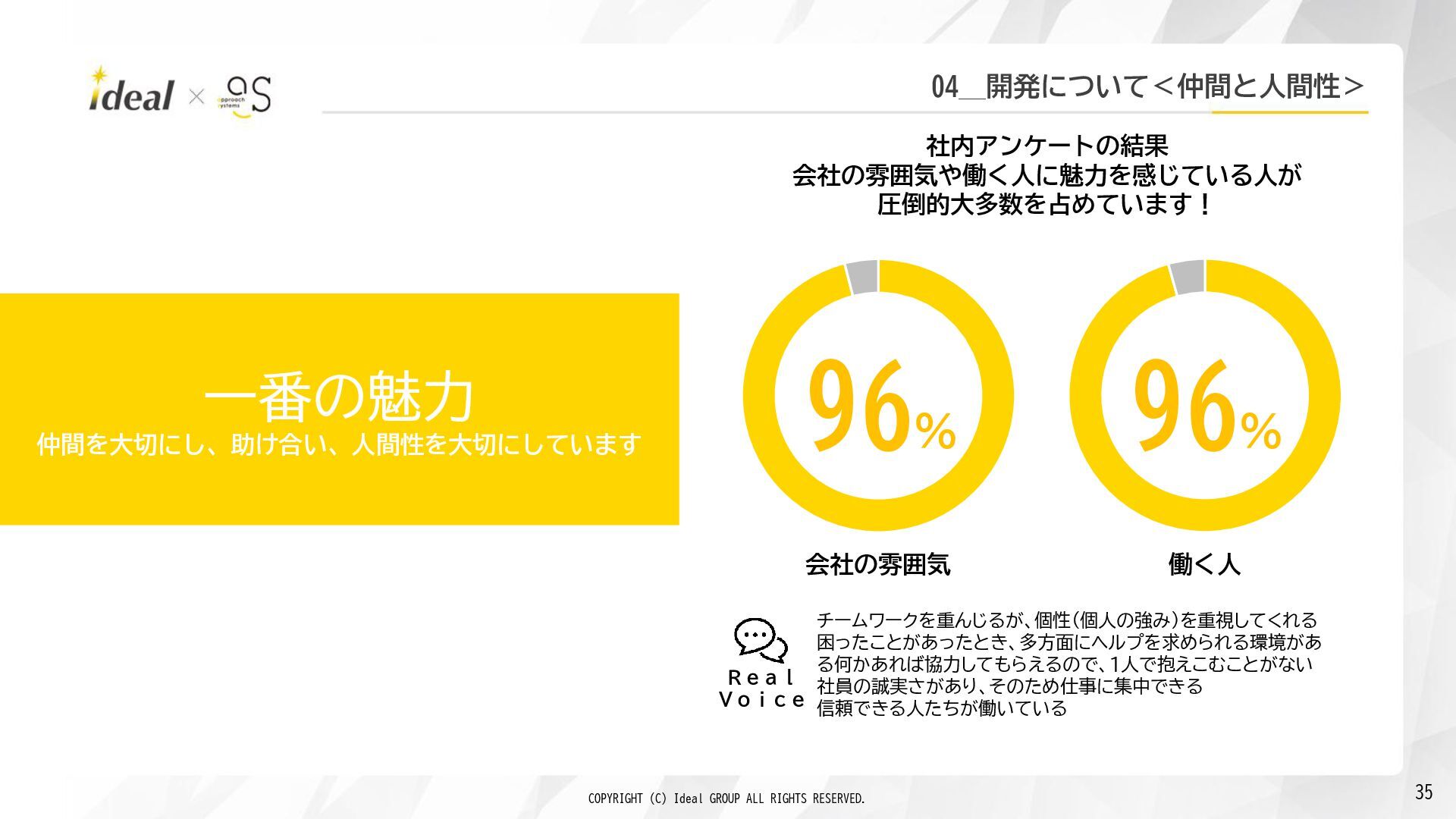 27. COPYRIGHT (C) Ideal GROUP ALL RIGHTS RESERVED. 04_開発について<仲間と人間性> 35 一番の魅力