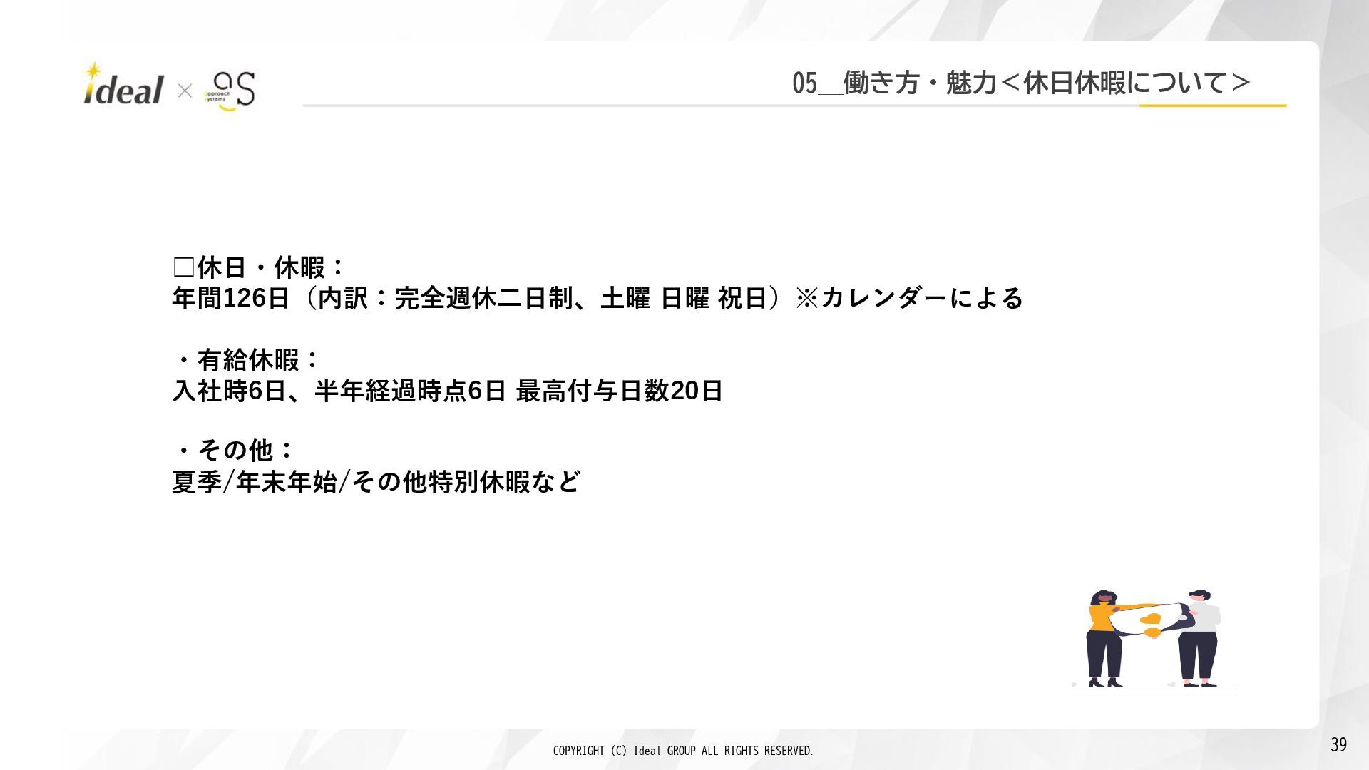 30. COPYRIGHT (C) Ideal GROUP ALL RIGHTS RESERVED. 39 05_働き方・魅力<休日休暇について> □休日・休暇: