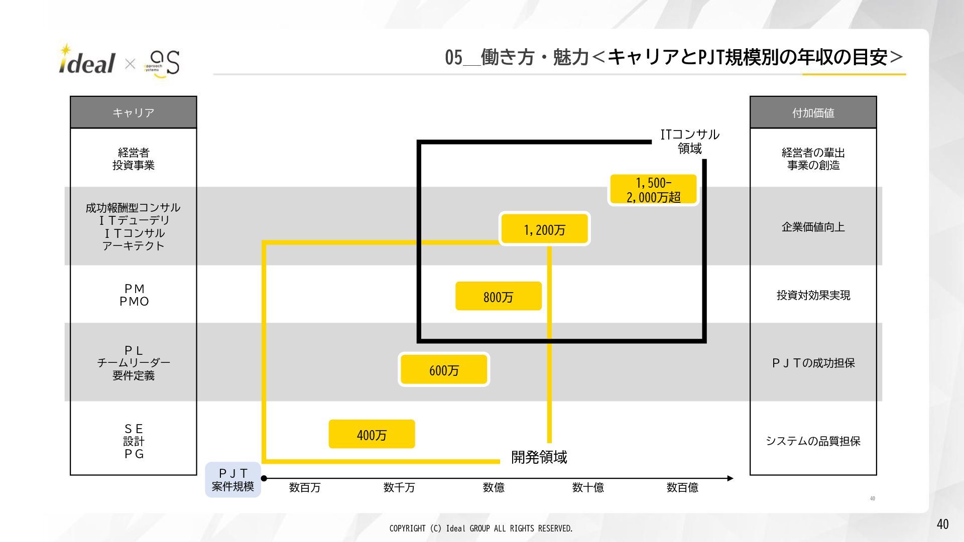 31. COPYRIGHT (C) Ideal GROUP ALL RIGHTS RESERVED. 40 05_働き方・魅力<キャリアとPJT規模別の年収の目安> PL