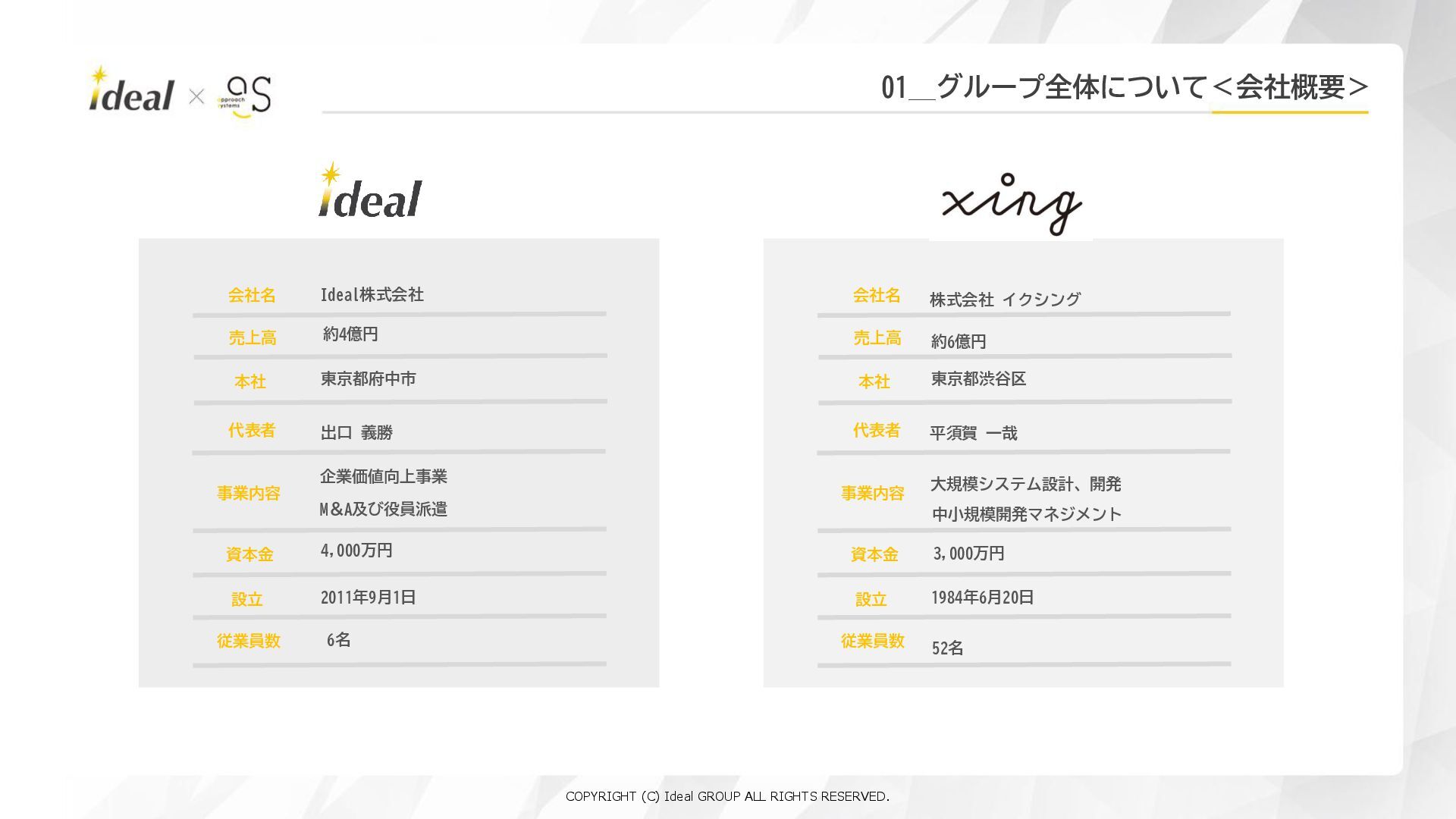 Ideal株式会社 東京都府中市 企業価値向上事業 4,000万円 2011年9月1日 6名 売上高 約4億円 代表者 出口 義勝 M&A及び役員派遣 資本金 従業員数 会社名 本社 事業内容 設立 株式会社 イクシング 東京都渋谷区 大規模システム設計、開発 3,000万円 1984年6月20日 52名 売上高 約6億円 代表者 平須賀 一哉 中小規模開発マネジメント 資本金 従業員数 会社名 01_グループ全体について<会社概要>