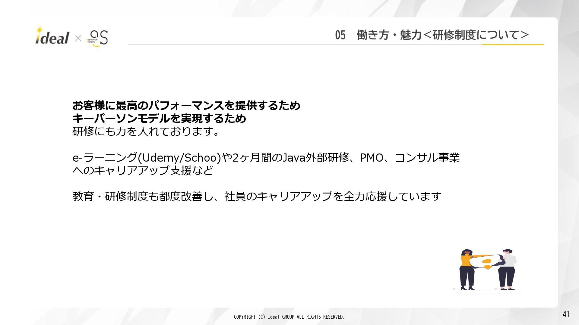 32. COPYRIGHT (C) Ideal GROUP ALL RIGHTS RESERVED. 41 05_働き方・魅力<研修制度について> お客様に最高のパフォーマンスを提供するため