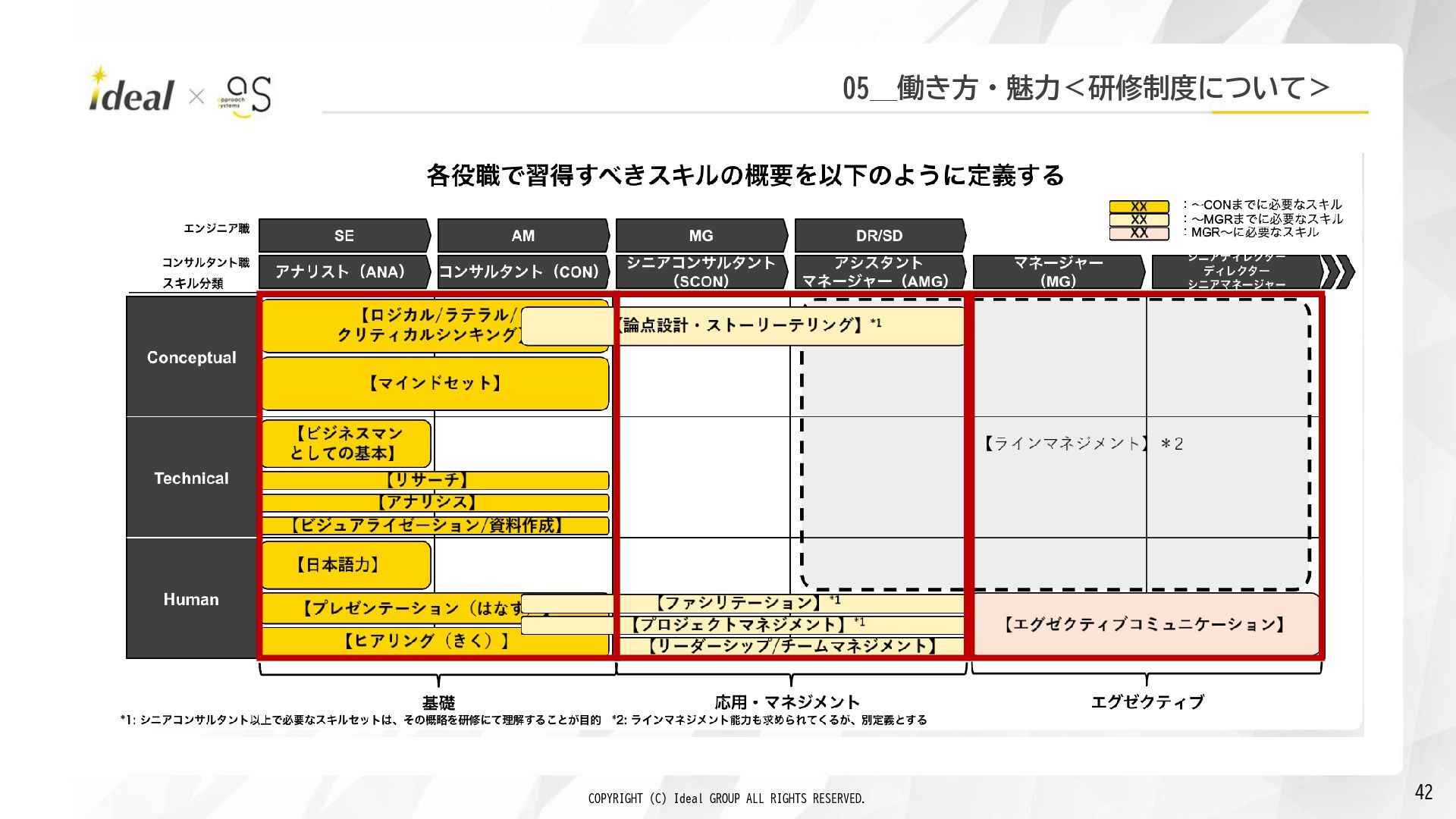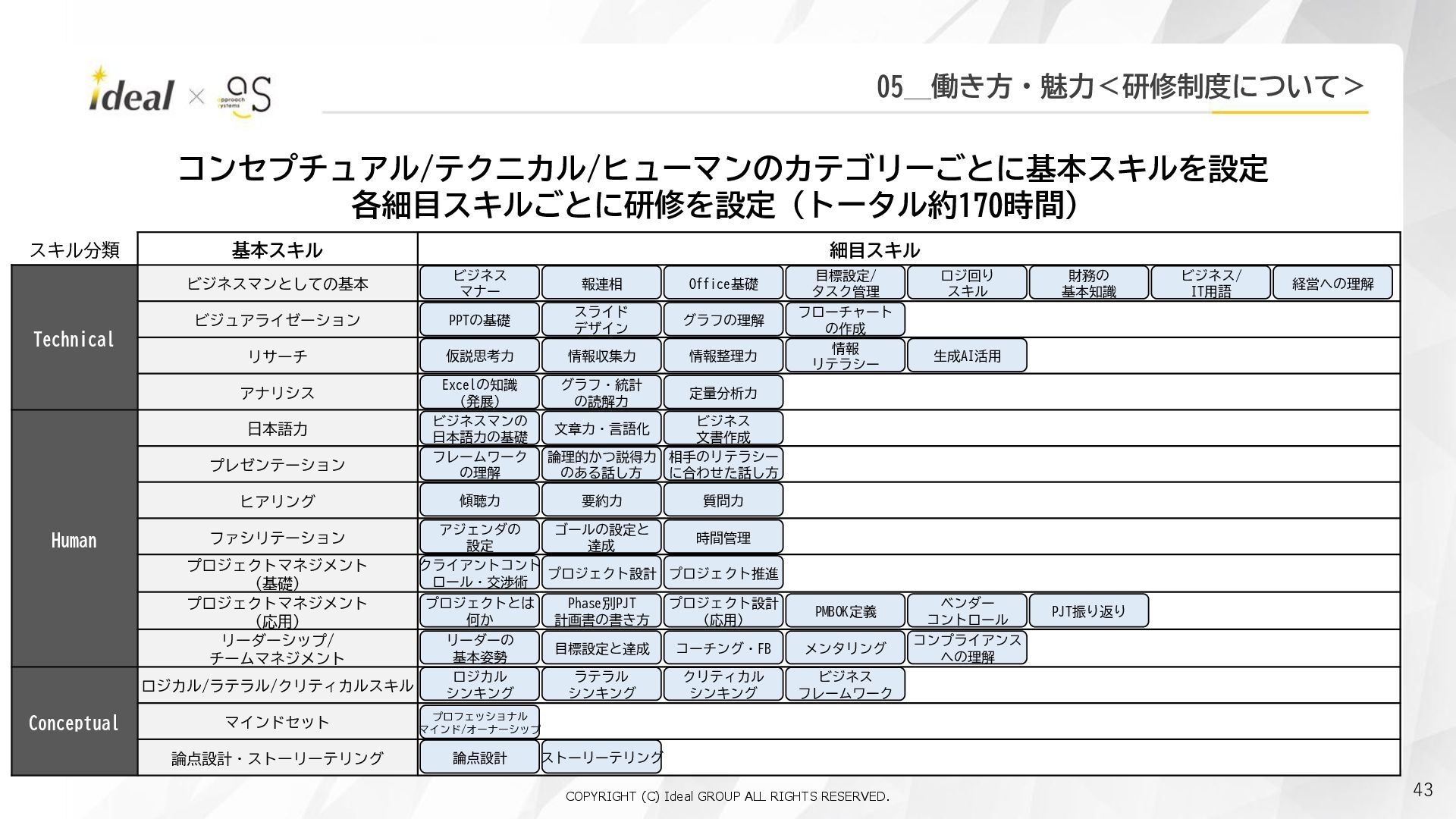 33. COPYRIGHT (C) Ideal GROUP ALL RIGHTS RESERVED. 05_働き方・魅力<研修制度について> 43 コンセプチュアル/テクニカル/ヒューマンのカテゴリーごとに基本スキルを設定