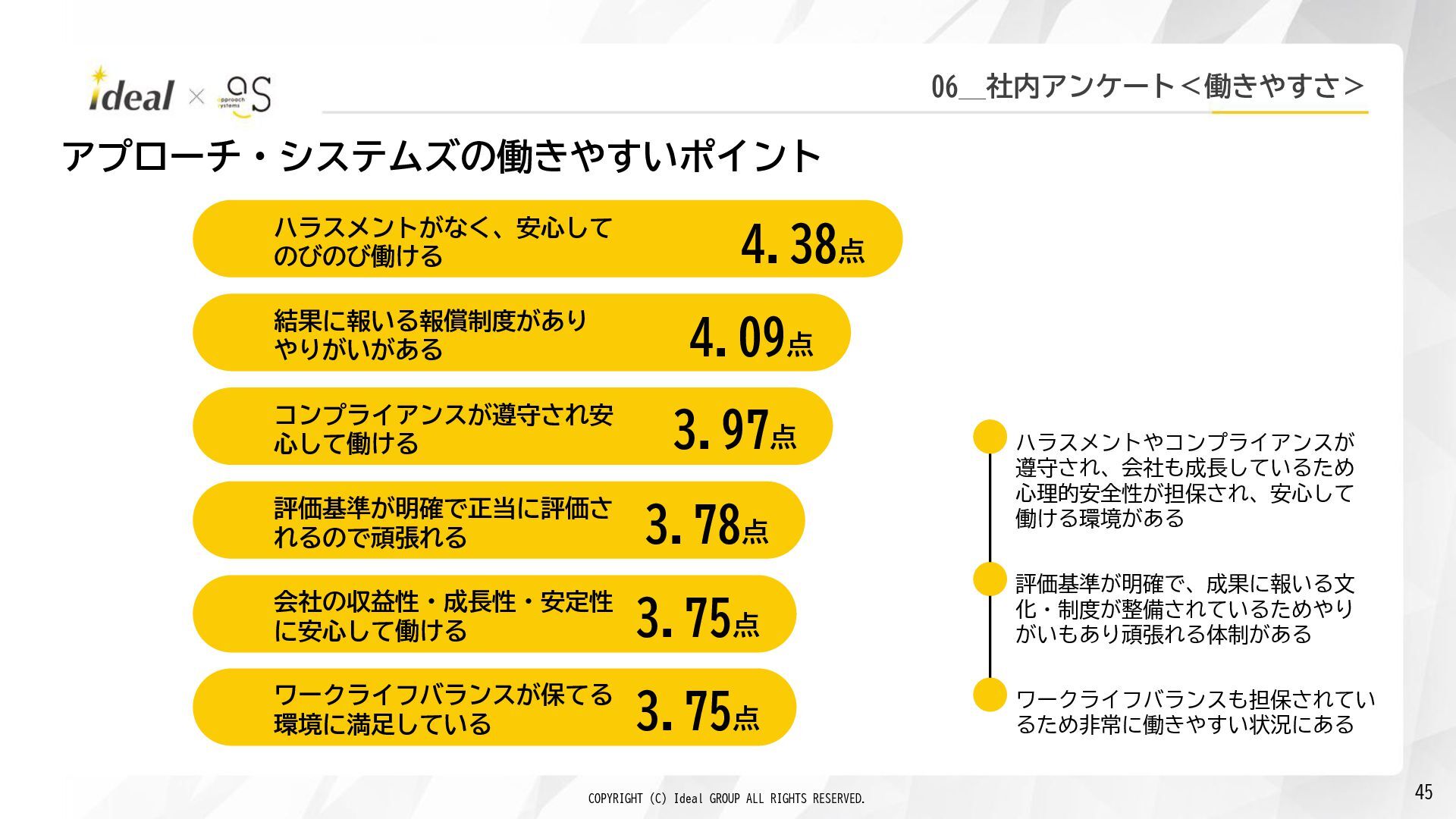 34. COPYRIGHT (C) Ideal GROUP ALL RIGHTS RESERVED. 45 06_社内アンケート<働きやすさ> アプローチ・システムズの働きやすいポイント