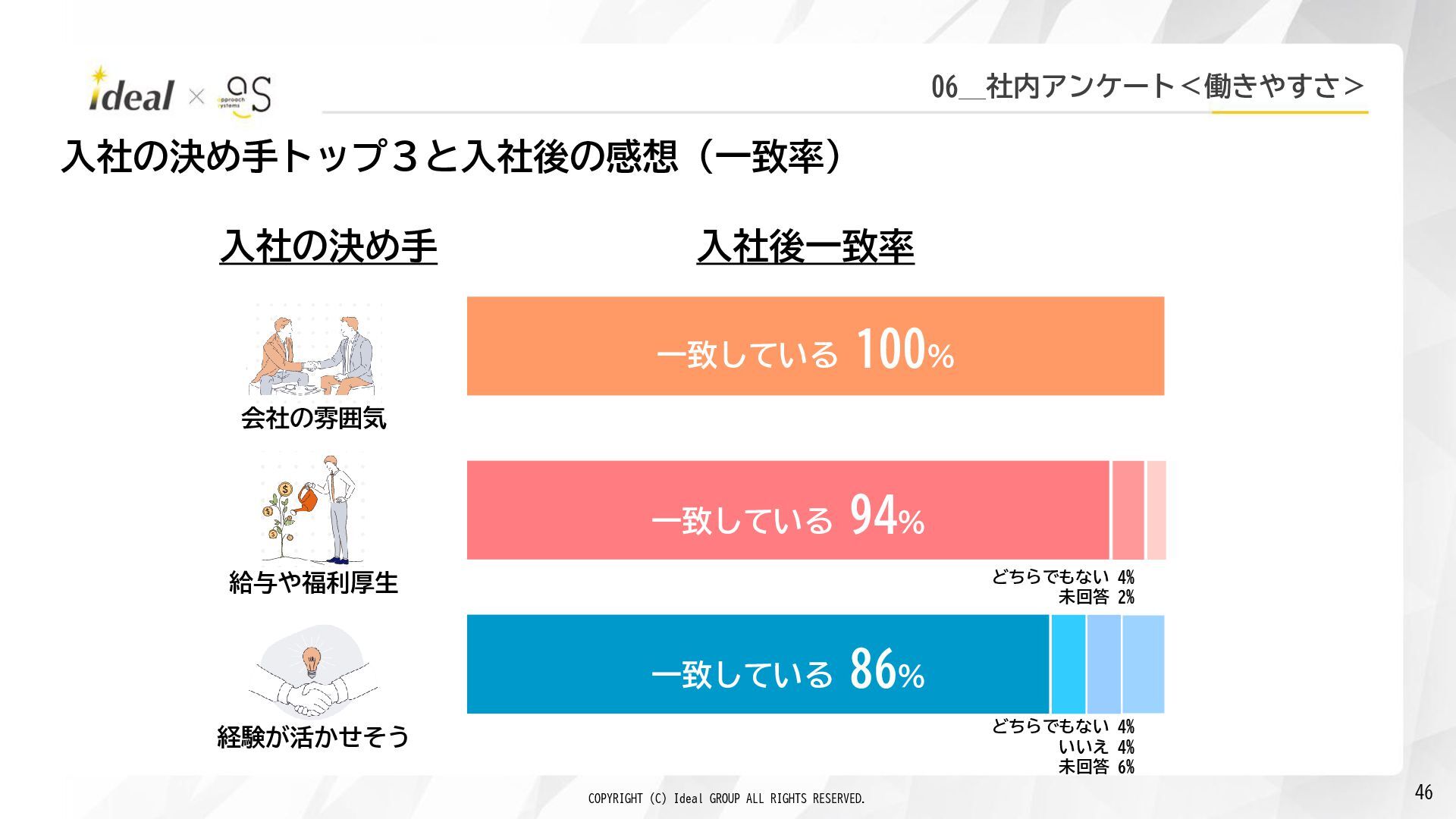 35. COPYRIGHT (C) Ideal GROUP ALL RIGHTS RESERVED. 46 06_社内アンケート<働きやすさ> 入社の決め手トップ3と入社後の感想(一致率)