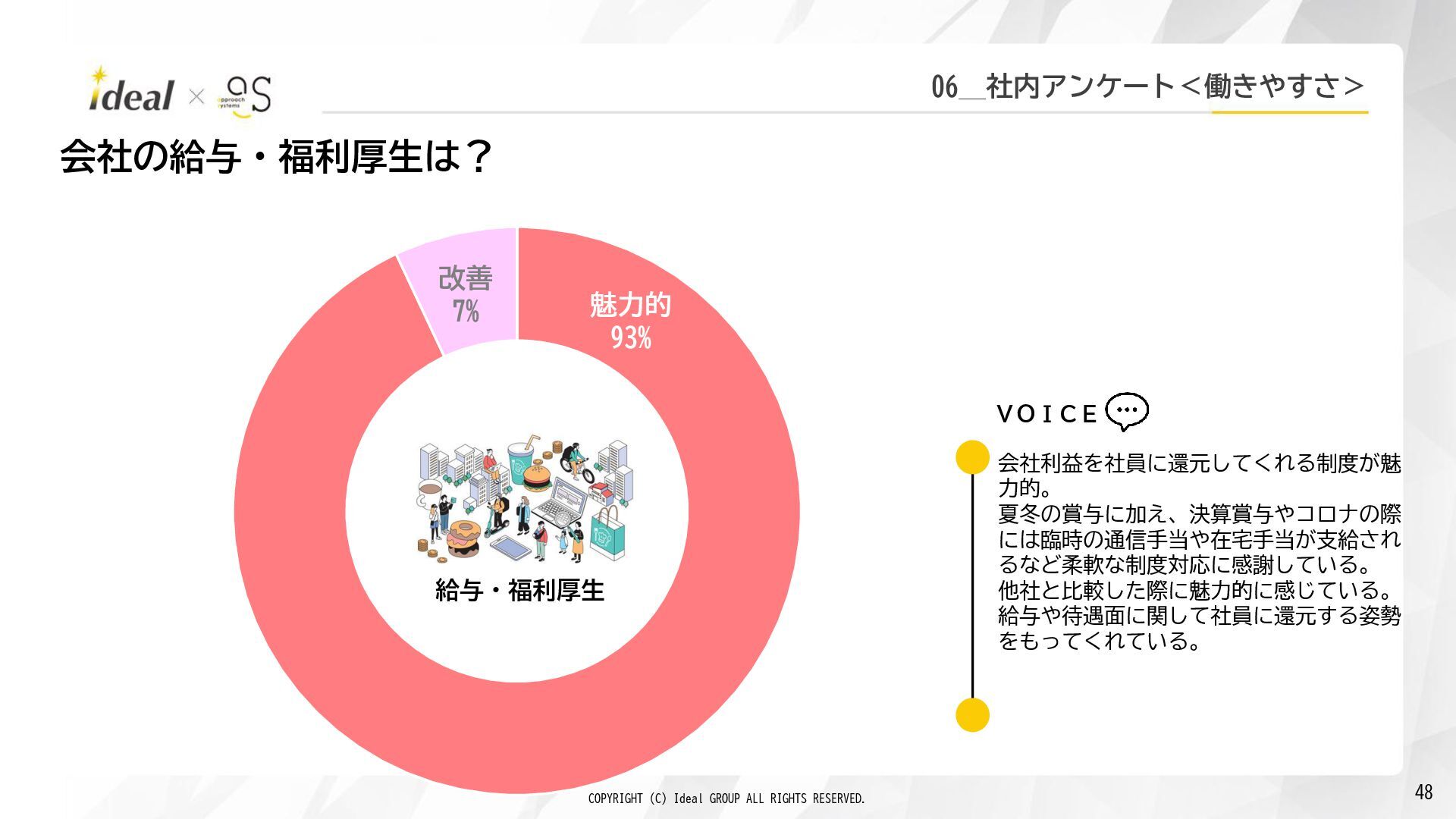 魅力的 93% 改善 7% 会社利益を社員に還元してくれる制度が魅 力的。 夏冬の賞与に加え、決算賞与やコロナの際 には臨時の通信手当や在宅手当が支給され るなど柔軟な制度対応に感謝している。 他社と比較した際に魅力的に感じている。 給与や待遇面に関して社員に還元する姿勢 をもってくれている。 VOICE 06_社内アンケート<働きやすさ>