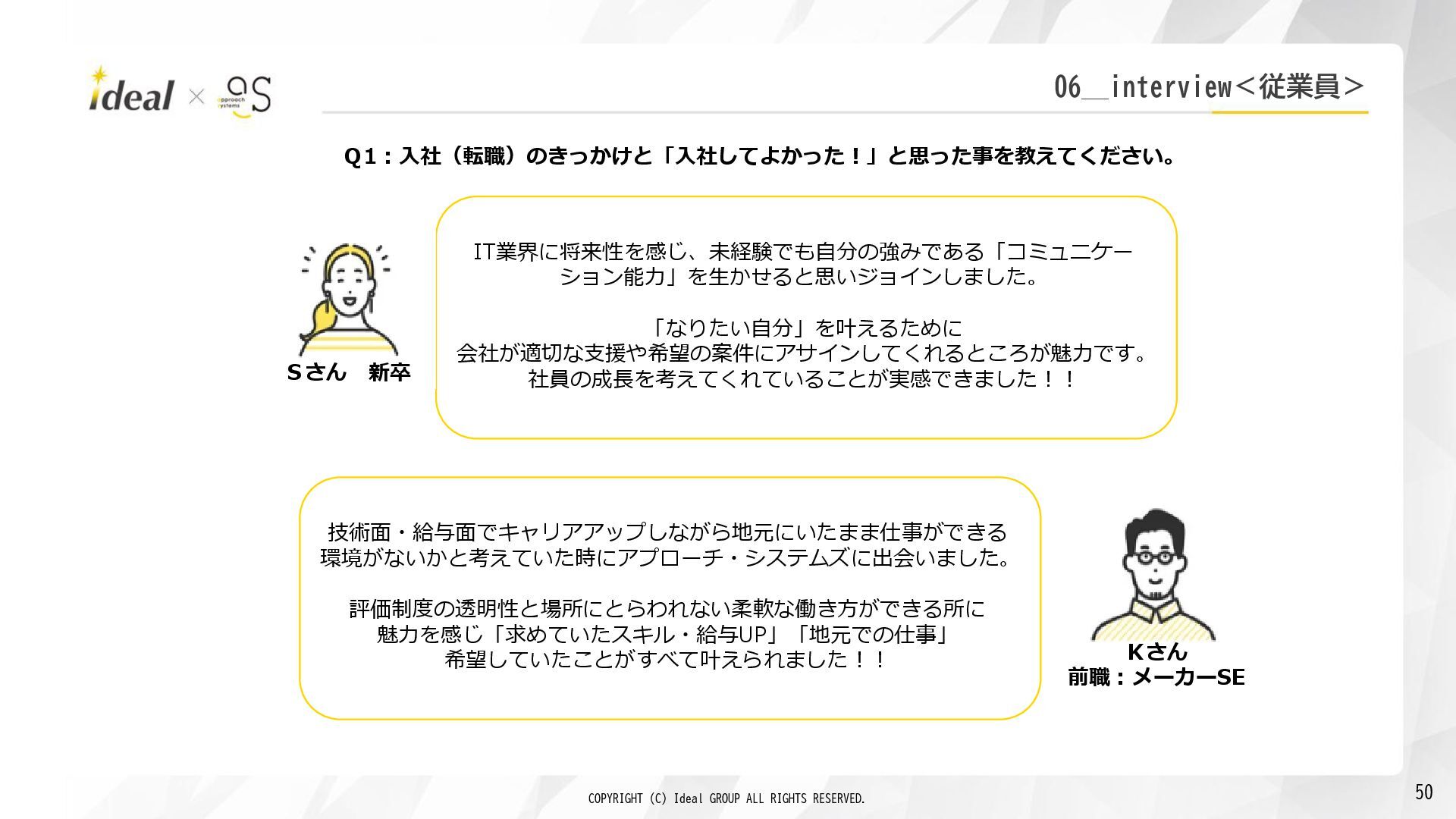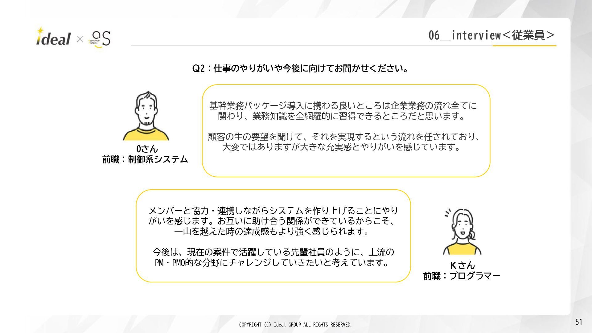 40. COPYRIGHT (C) Ideal GROUP ALL RIGHTS RESERVED. 51 06_interview<従業員> 基幹業務パッケージ導入に携わる良いところは企業業務の流れ全てに