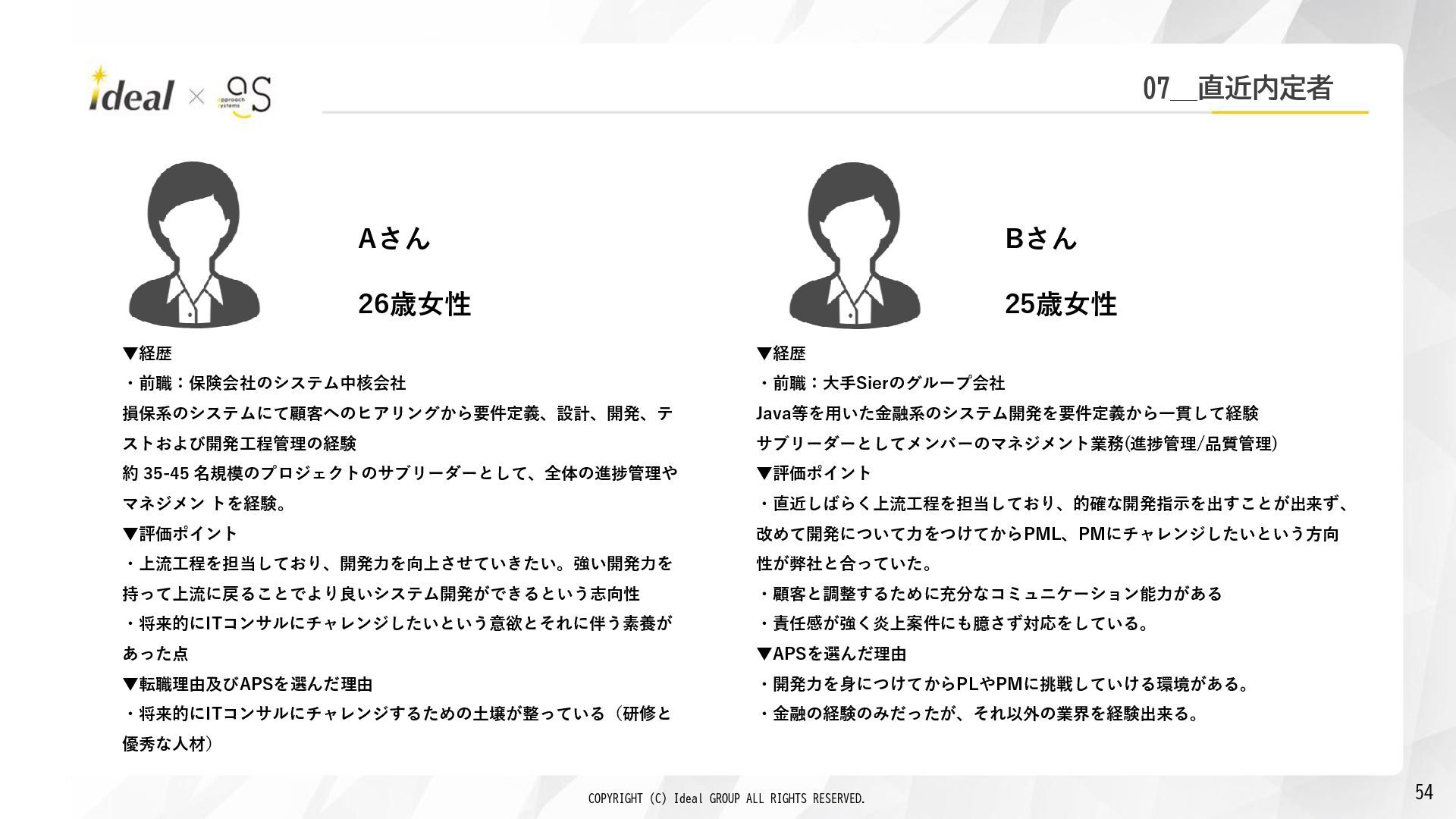 ・前職:保険会社のシステム中核会社 損保系のシステムにて顧客へのヒアリングから要件定義、設計、開発、テ ストおよび開発工程管理の経験 約 35-45 名規模のプロジェクトのサブリーダーとして、全体の進捗管理や マネジメン トを経験。 ▼評価ポイント ・上流工程を担当しており、開発力を向上させていきたい。強い開発力を 持って上流に戻ることでより良いシステム開発ができるという志向性 ・将来的にITコンサルにチャレンジしたいという意欲とそれに伴う素養が あった点 ▼転職理由及びAPSを選んだ理由 ・将来的にITコンサルにチャレンジするための土壌が整っている(研修と 優秀な人材) Bさん 25歳女性 Aさん 26歳女性 ▼経歴 ・前職:大手Sierのグループ会社 Java等を用いた金融系のシステム開発を要件定義から一貫して経験 サブリーダーとしてメンバーのマネジメント業務(進捗管理/品質管理) ▼評価ポイント ・直近しばらく上流工程を担当しており、的確な開発指示を出すことが出来ず、 改めて開発について力をつけてからPML、PMにチャレンジしたいという方向 性が弊社と合っていた。 ・顧客と調整するために充分なコミュニケーション能力がある ・責任感が強く炎上案件にも臆さず対応をしている。 ▼APSを選んだ理由 ・開発力を身につけてからPLやPMに挑戦していける環境がある。 ・金融の経験のみだったが、それ以外の業界を経験出来る。
