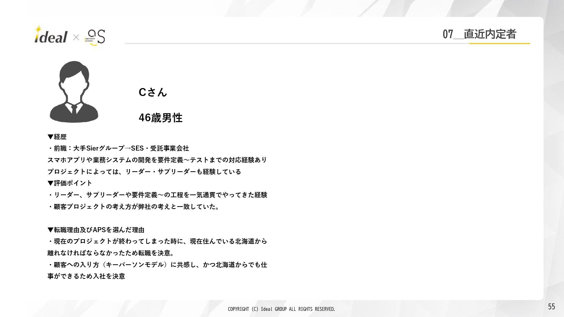 ・前職:大手Sierグループ→SES・受託事業会社 スマホアプリや業務システムの開発を要件定義〜テストまでの対応経験あり プロジェクトによっては、リーダー・サブリーダーも経験している ▼評価ポイント ・リーダー、サブリーダーや要件定義〜の工程を一気通貫でやってきた経験 ・顧客プロジェクトの考え方が弊社の考えと一致していた。 ▼転職理由及びAPSを選んだ理由 ・現在のプロジェクトが終わってしまった時に、現在住んでいる北海道から 離れなければならなかったため転職を決意。 ・顧客への入り方(キーパーソンモデル)に共感し、かつ北海道からでも仕 事ができるため入社を決意 Cさん 46歳男性