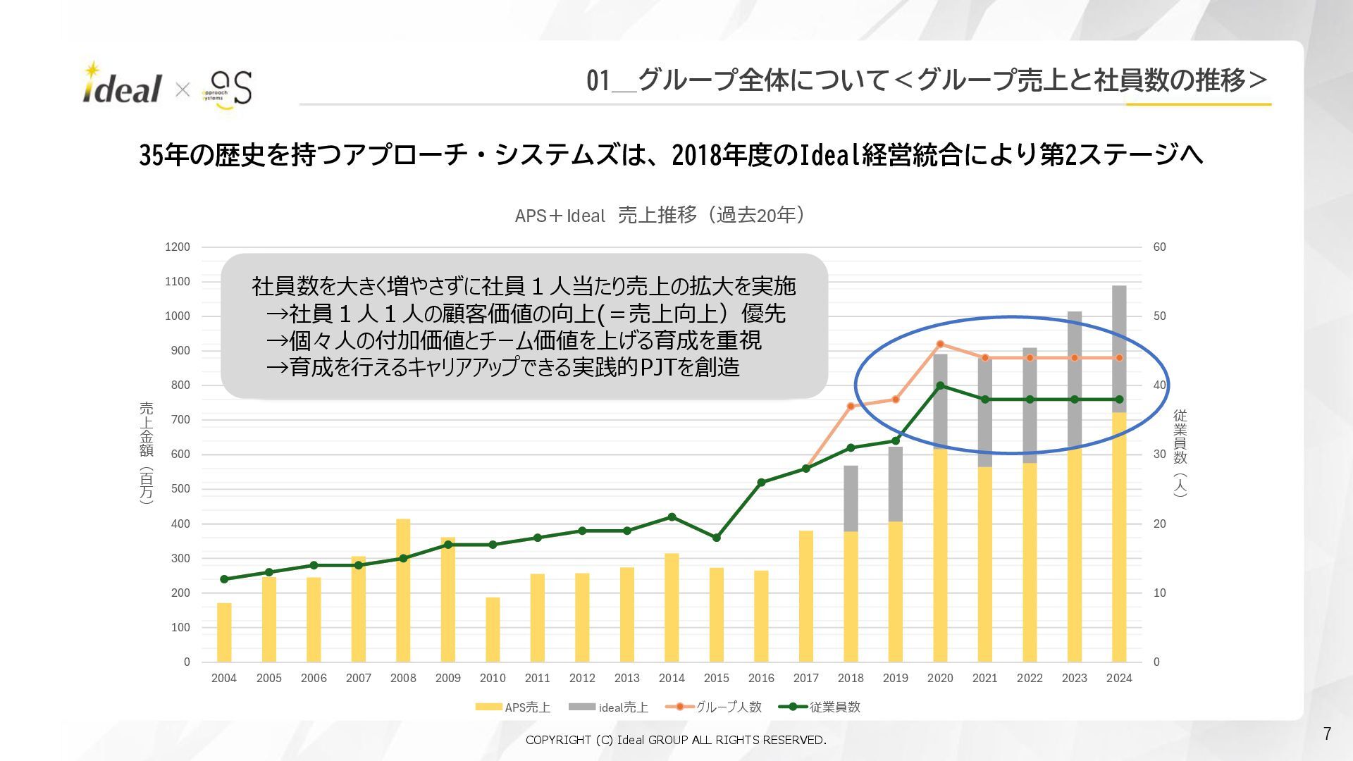 0 10 20 30 40 50 60 0 100 200 300 400 500 600 700 800 900 1000 1100 1200 2004 2005 2006 2007 2008 2009 2010 2011 2012 2013 2014 2015 2016 2017 2018 2019 2020 2021 2022 2023 2024 従 業 員 数 ( 人 ) 売 上 金 額 ( 百 万 ) APS+Ideal 売上推移(過去20年) APS売上 ideal売上 グループ人数 従業員数 社員数を大きく増やさずに社員1人当たり売上の拡大を実施 →社員1人1人の顧客価値の向上(=売上向上)優先 →個々人の付加価値とチーム価値を上げる育成を重視 →育成を行えるキャリアアップできる実践的PJTを創造