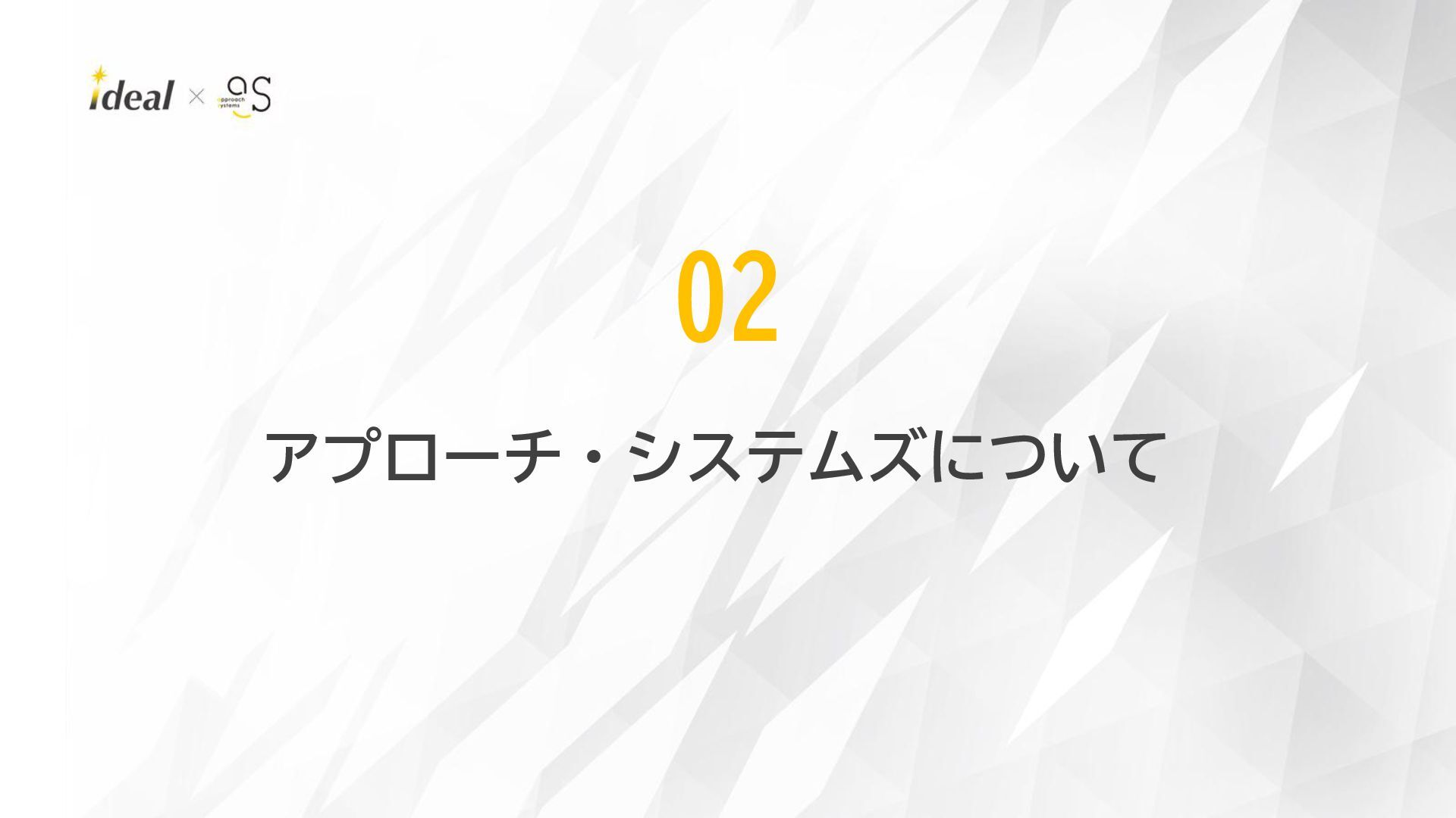 DX企画/ 事業企画 要件定義 チーム 設計/開発 チーム 技術 チーム ビジネス アーキテクト データ サイエンティス ト システム アーキテクト PL PM PMO 技術の押し売りではなく、問題解決というサービスを提供 キーマン= Ideal アプローチ・システムズ 顧客社員/顧客調達のコンサルやSIer キーパーソンになる 02_アプローチ・システムズについて<ミッション>