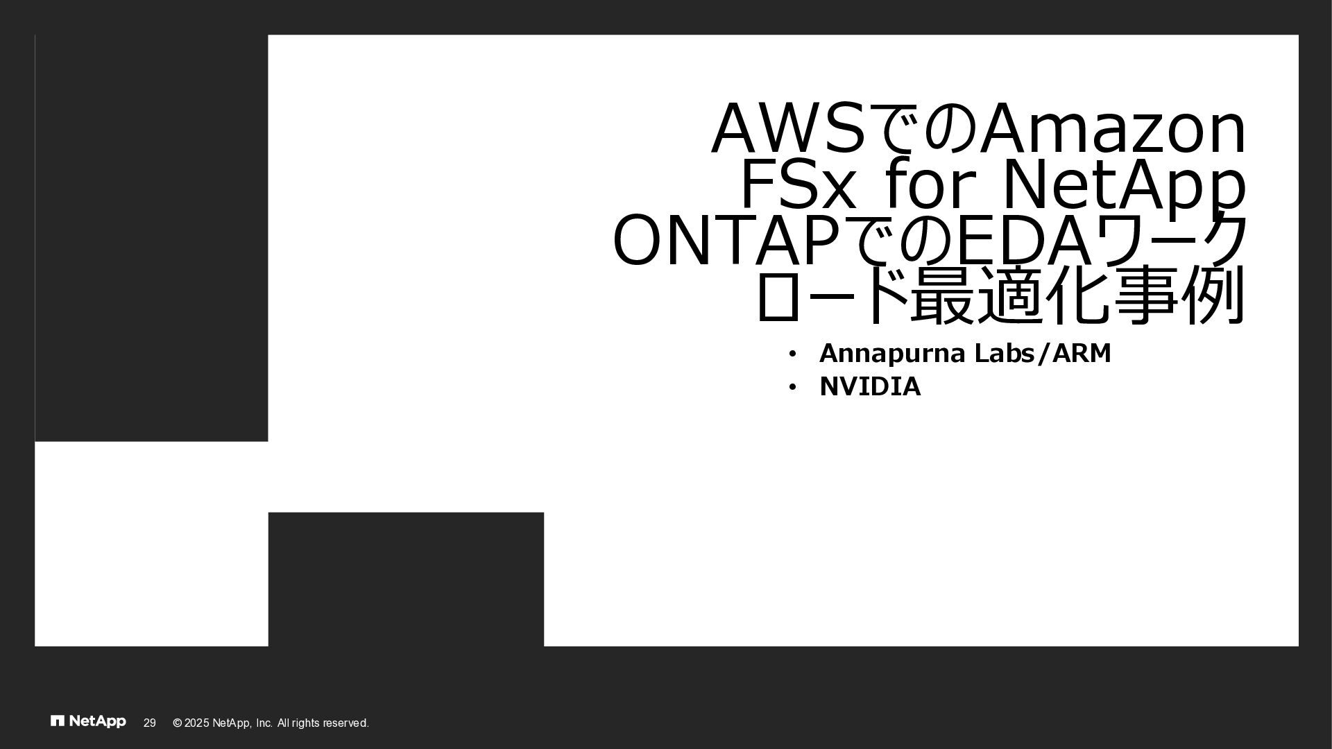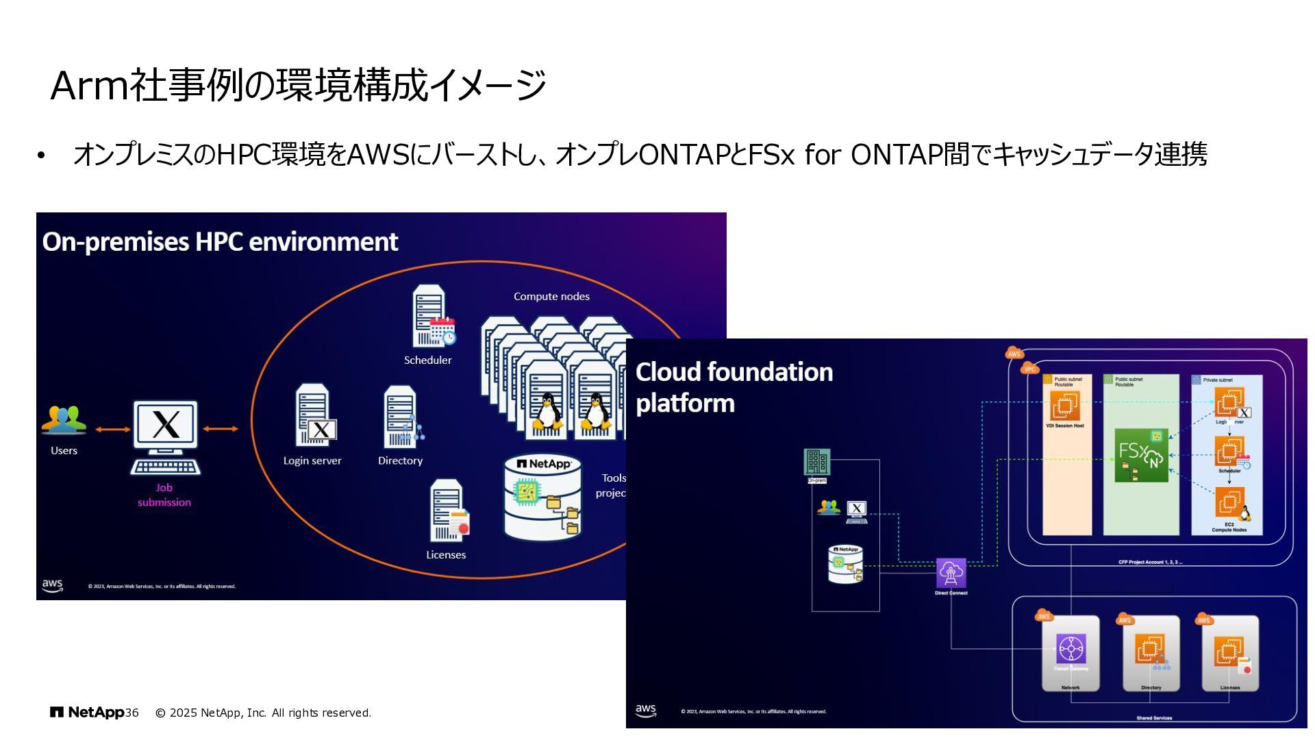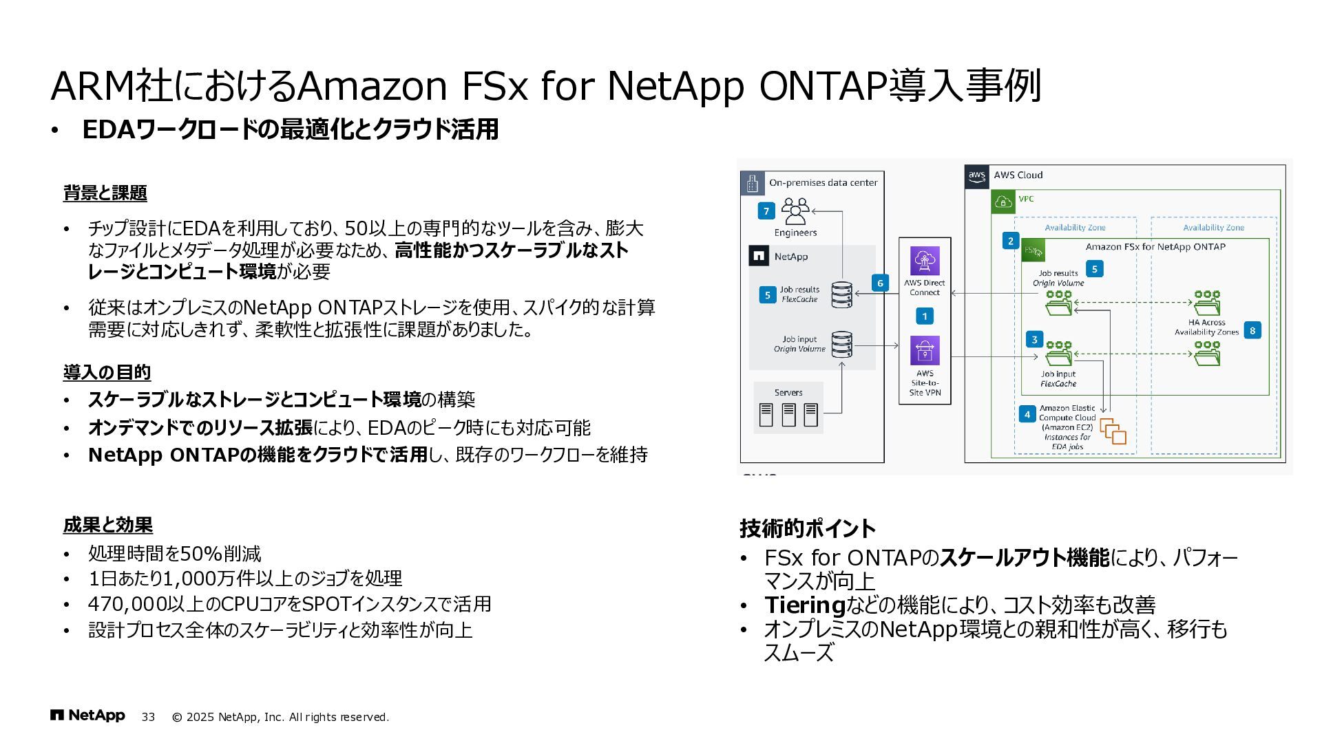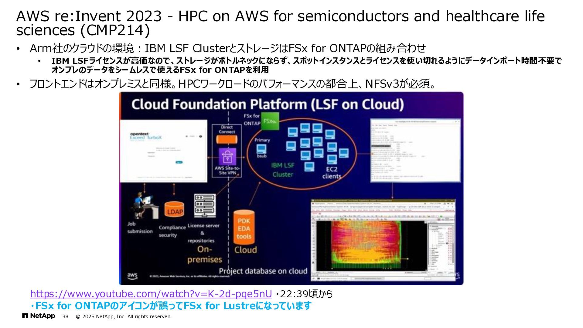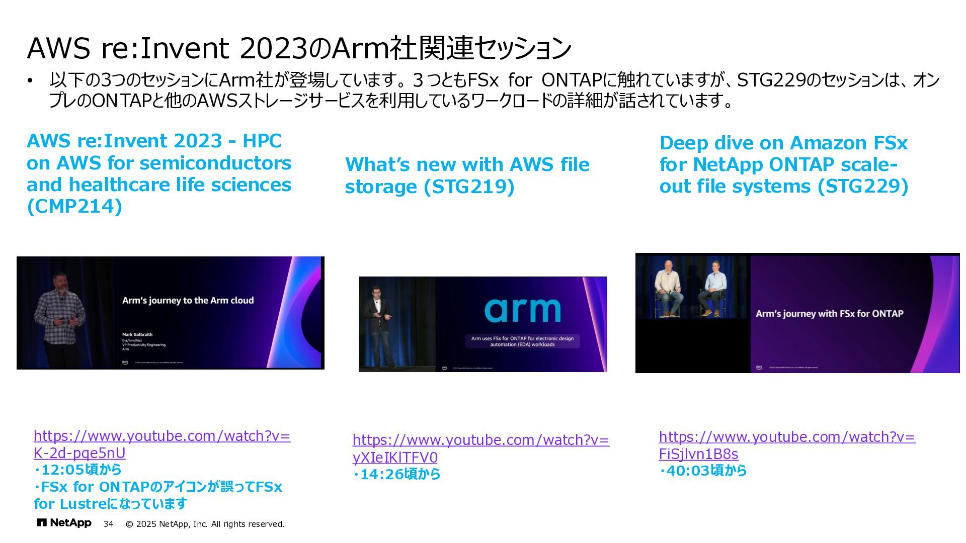 for ONTAPに触れていますが、STG229のセッションは、オン プレのONTAPと他のAWSストレージサービスを利用しているワークロードの詳細が話されています。 AWS re:Invent 2023のArm社関連セッション What’s new with AWS file storage (STG219) https://www.youtube.com/watch?v= yXIeIKlTFV0 ・14:26頃から AWS re:Invent 2023 - HPC on AWS for semiconductors and healthcare life sciences (CMP214) https://www.youtube.com/watch?v= K-2d-pqe5nU ・12:05頃から ・FSx for ONTAPのアイコンが誤ってFSx for Lustreになっています Deep dive on Amazon FSx for NetApp ONTAP scale- out file systems (STG229) https://www.youtube.com/watch?v= FiSjlvn1B8s ・40:03頃から