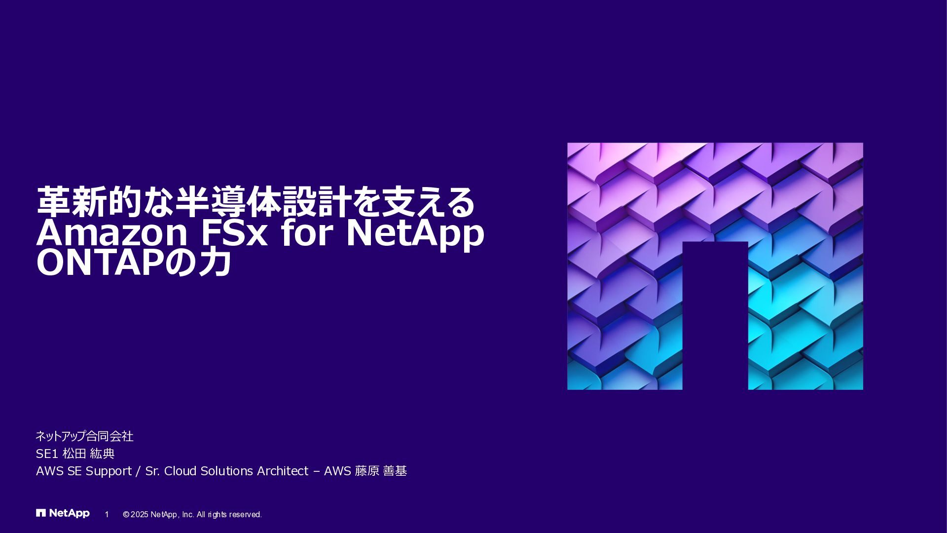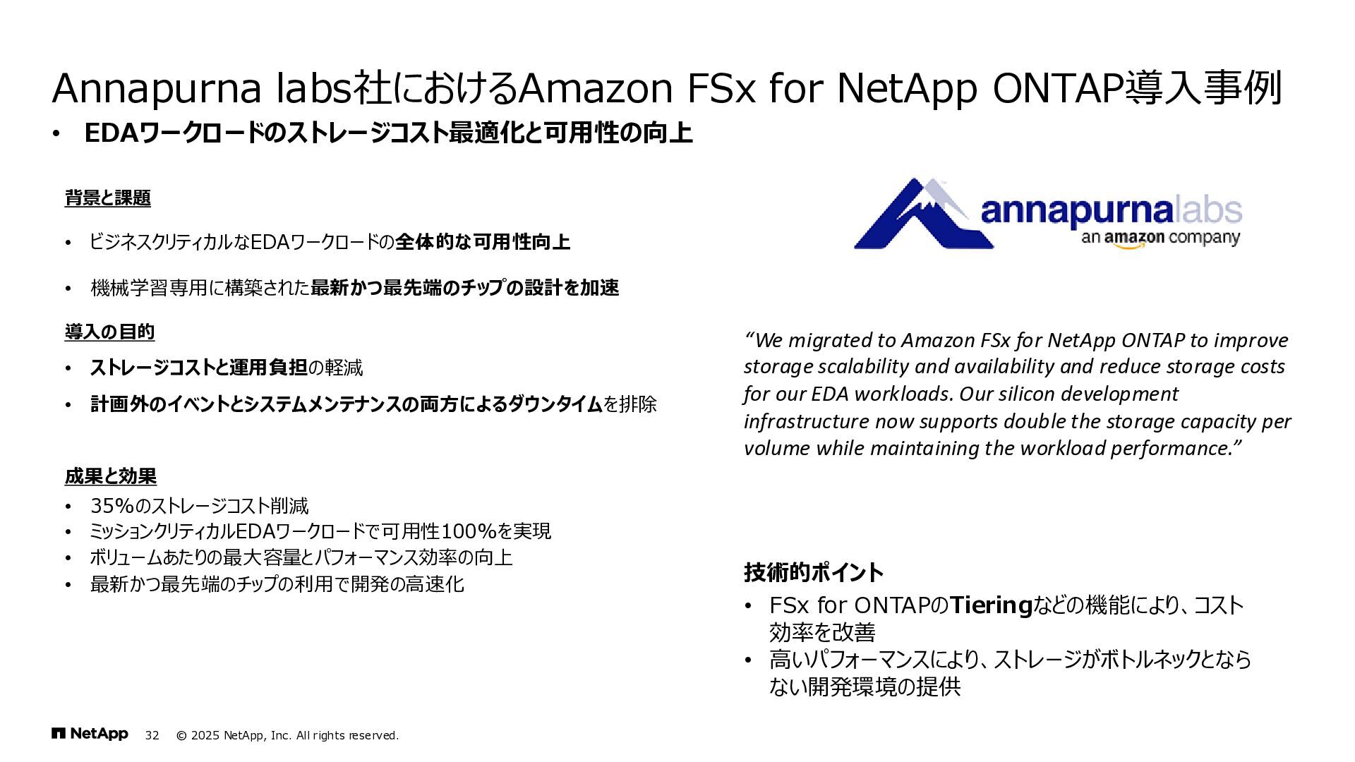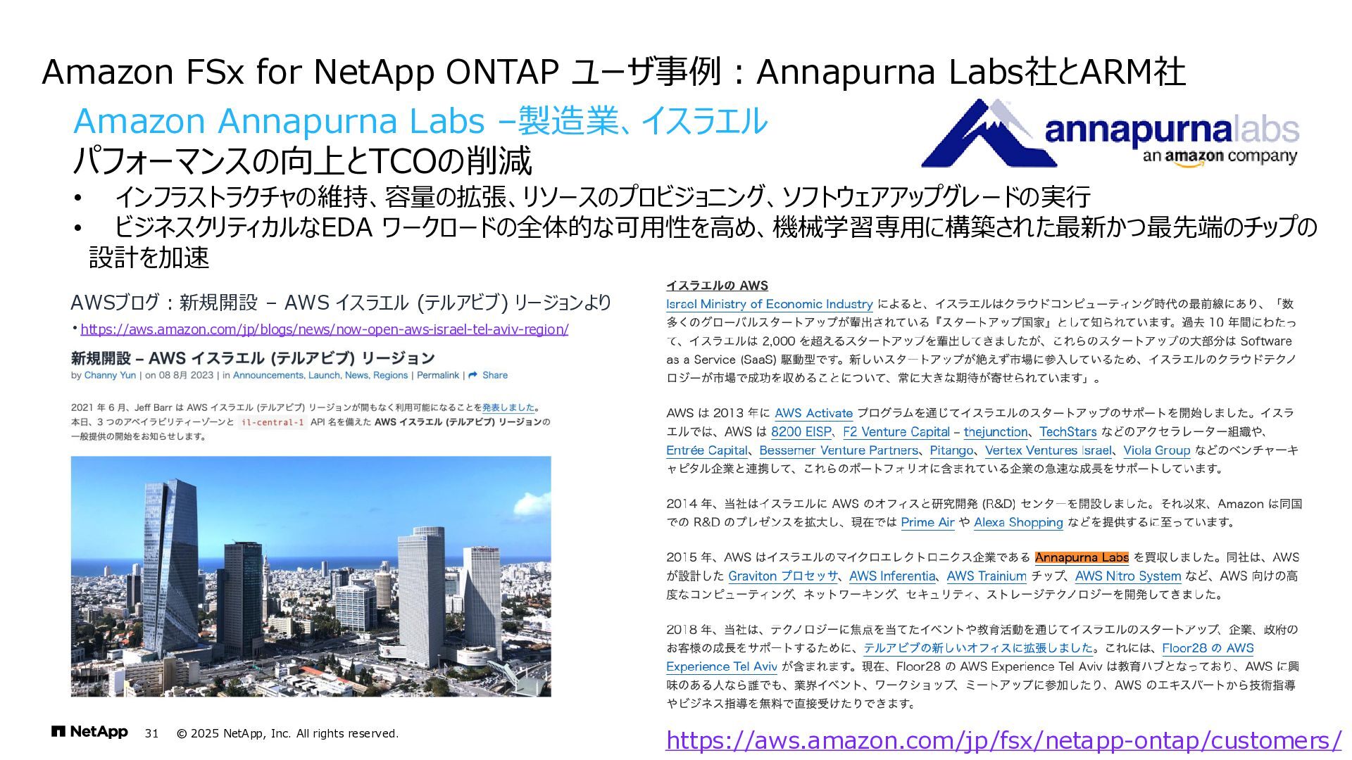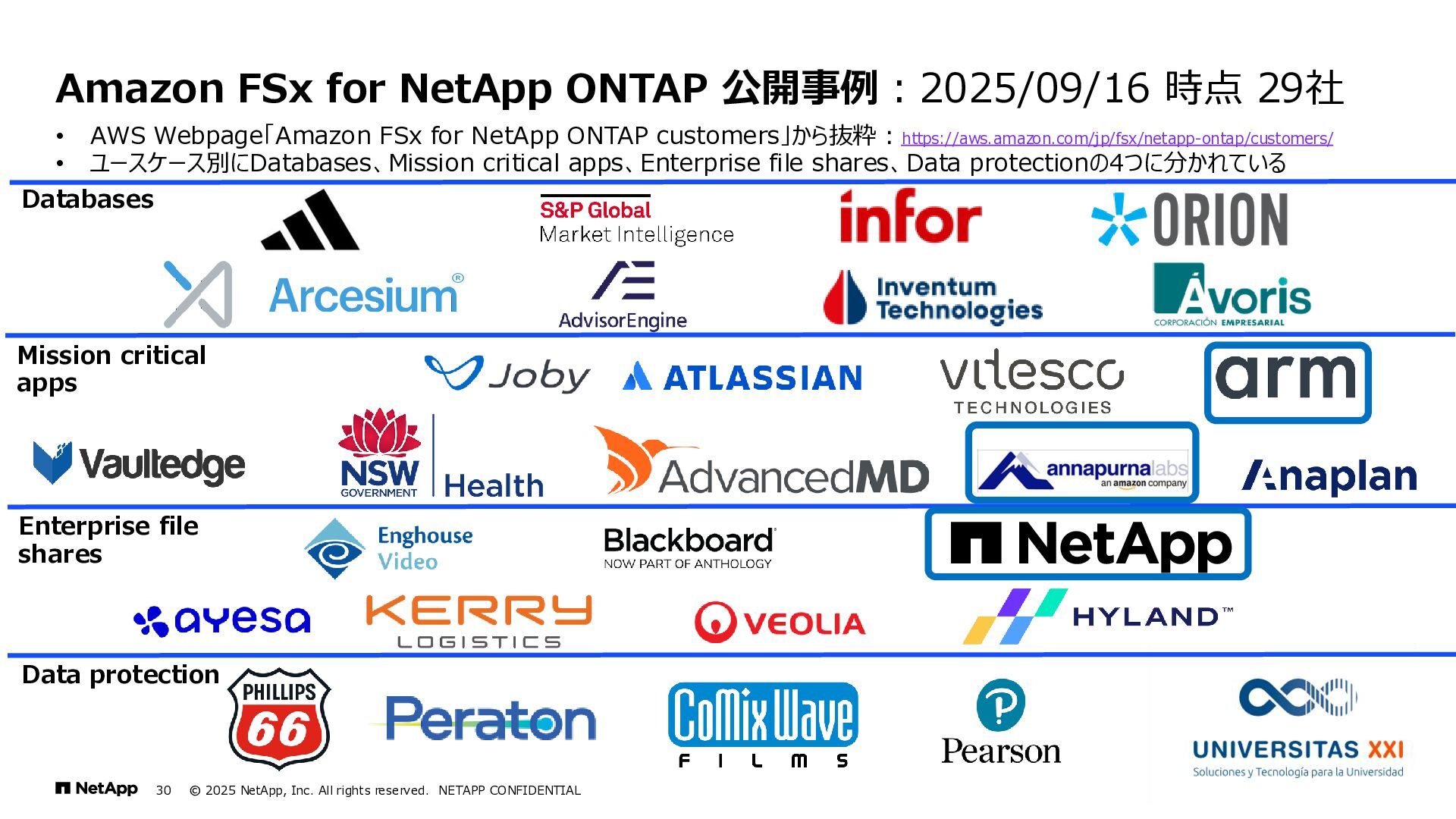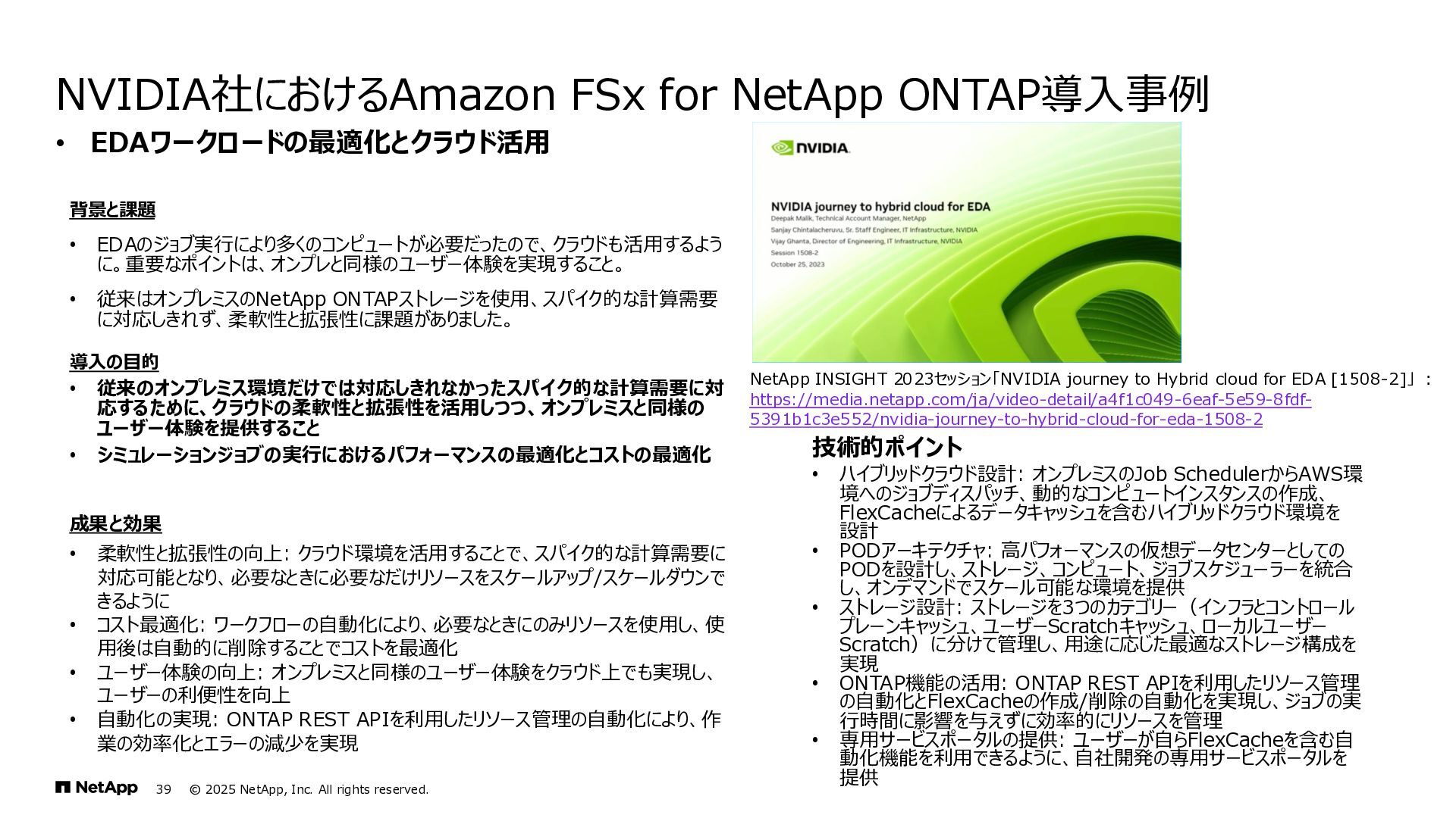 for ONTAPに触れていますが、STG229のセッションは、オン プレのONTAPと他のAWSストレージサービスを利用しているワークロードの詳細が話されています。 AWS re:Invent 2023のArm社関連セッション What’s new with AWS file storage (STG219) https://www.youtube.com/watch?v= yXIeIKlTFV0 ・14:26頃から AWS re:Invent 2023 - HPC on AWS for semiconductors and healthcare life sciences (CMP214) https://www.youtube.com/watch?v= K-2d-pqe5nU ・12:05頃から ・FSx for ONTAPのアイコンが誤ってFSx for Lustreになっています Deep dive on Amazon FSx for NetApp ONTAP scale- out file systems (STG229) https://www.youtube.com/watch?v= FiSjlvn1B8s ・40:03頃から
