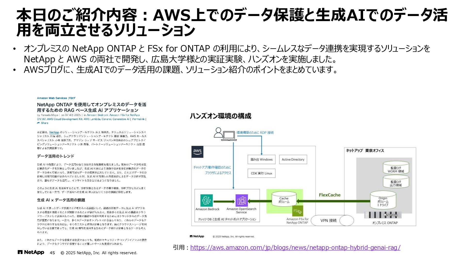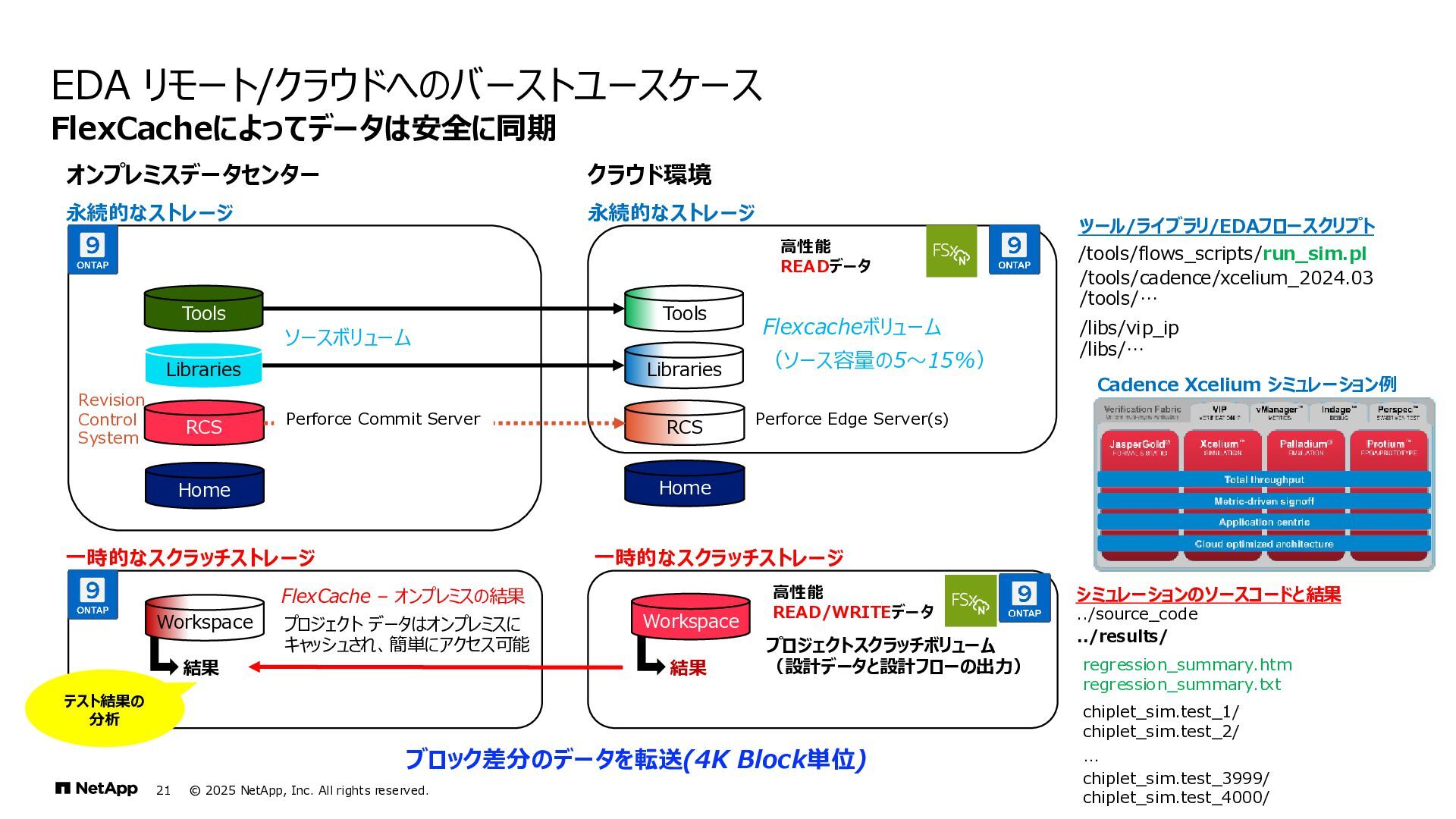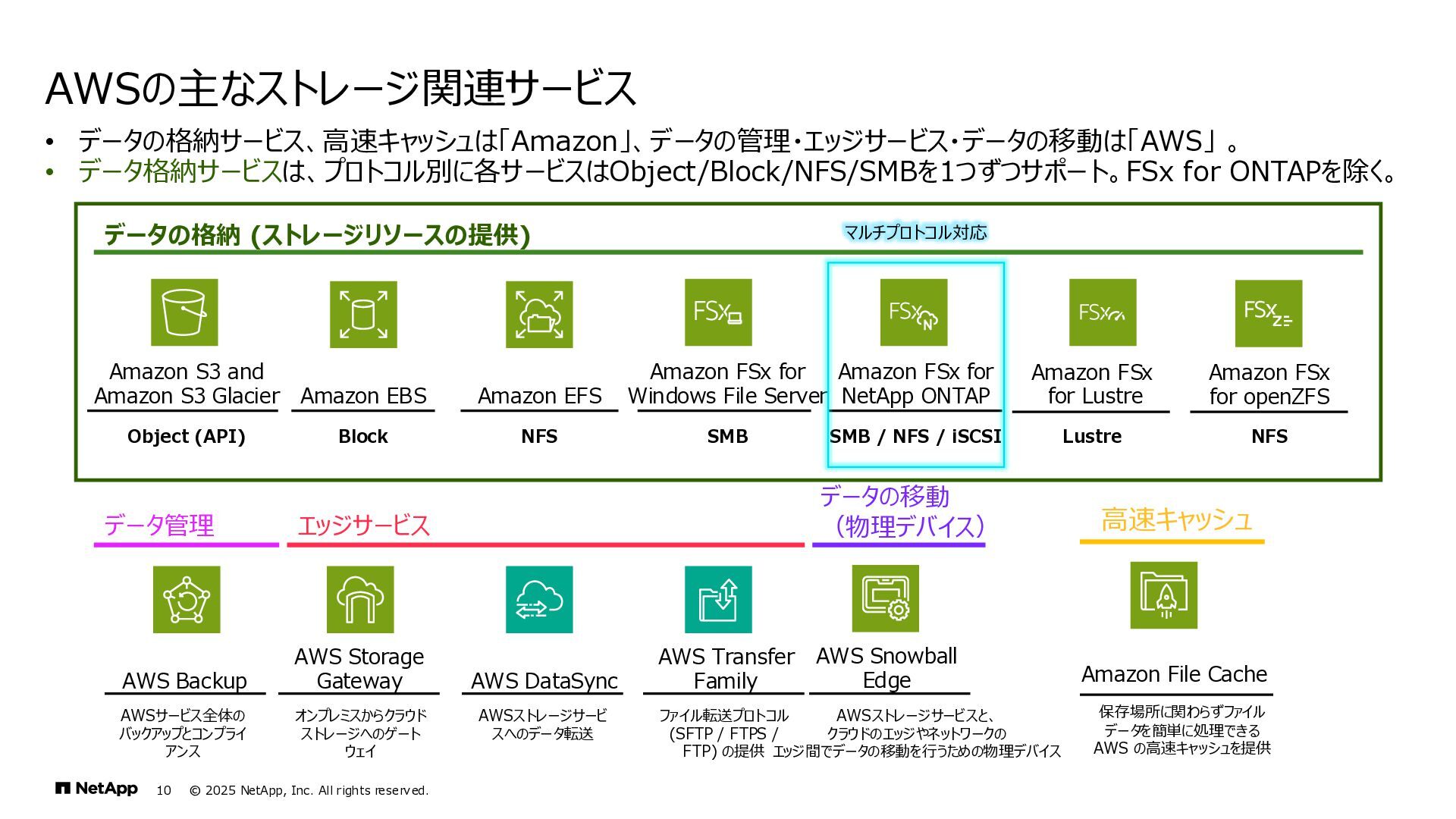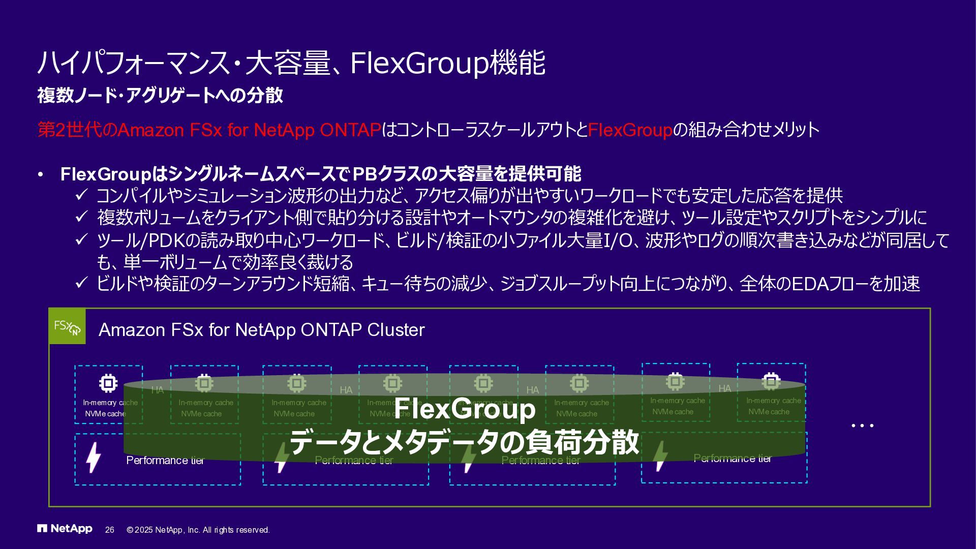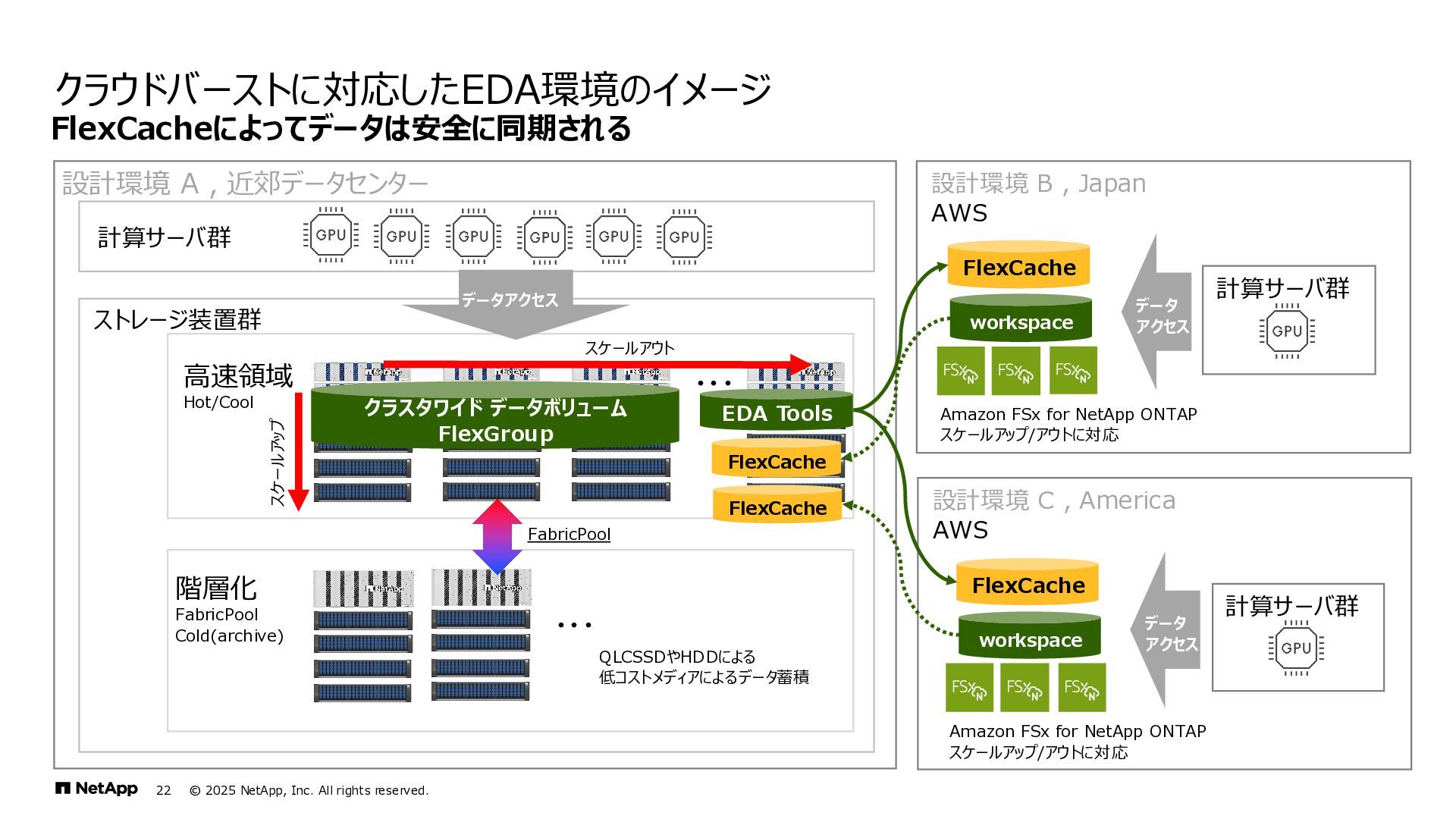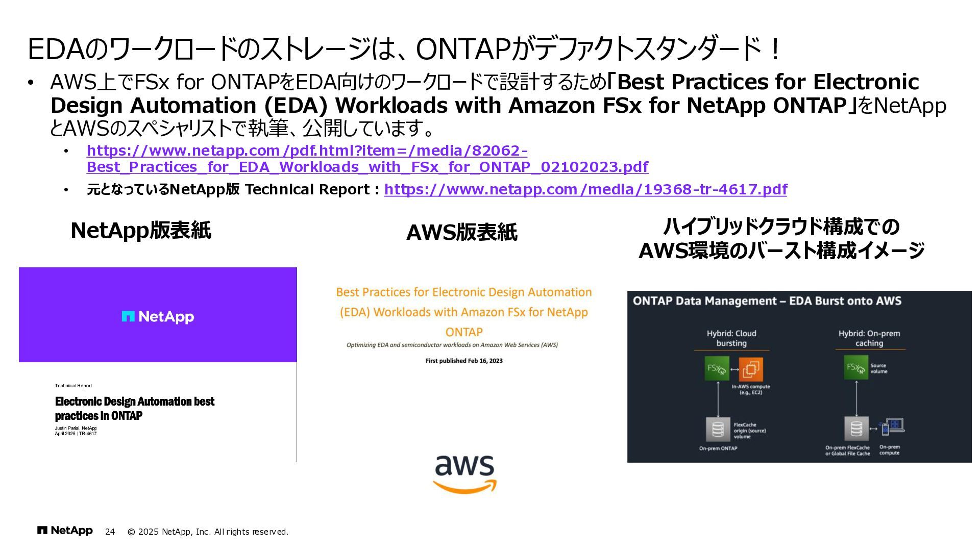 for ONTAPに触れていますが、STG229のセッションは、オン プレのONTAPと他のAWSストレージサービスを利用しているワークロードの詳細が話されています。 AWS re:Invent 2023のArm社関連セッション What’s new with AWS file storage (STG219) https://www.youtube.com/watch?v= yXIeIKlTFV0 ・14:26頃から AWS re:Invent 2023 - HPC on AWS for semiconductors and healthcare life sciences (CMP214) https://www.youtube.com/watch?v= K-2d-pqe5nU ・12:05頃から ・FSx for ONTAPのアイコンが誤ってFSx for Lustreになっています Deep dive on Amazon FSx for NetApp ONTAP scale- out file systems (STG229) https://www.youtube.com/watch?v= FiSjlvn1B8s ・40:03頃から