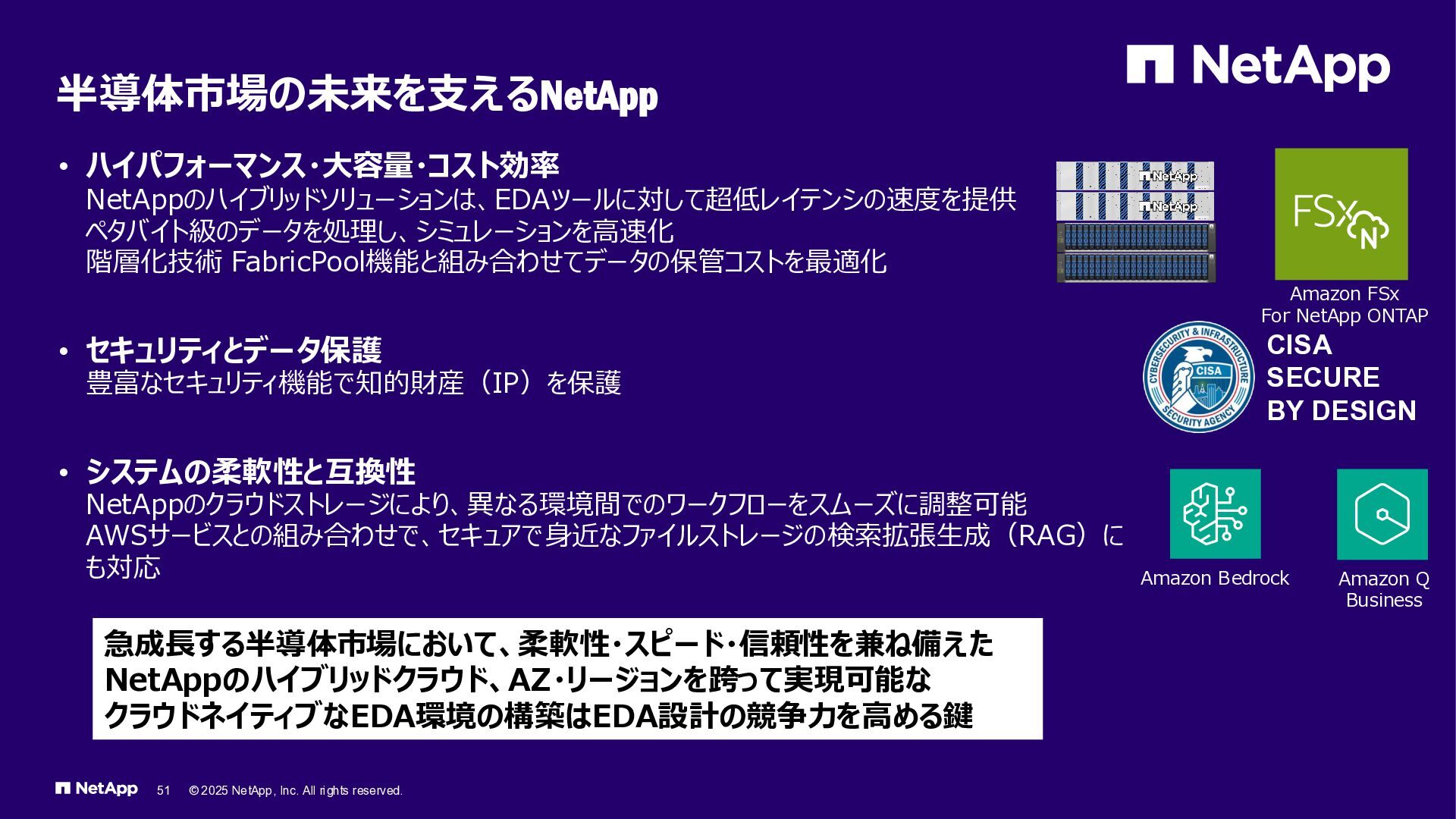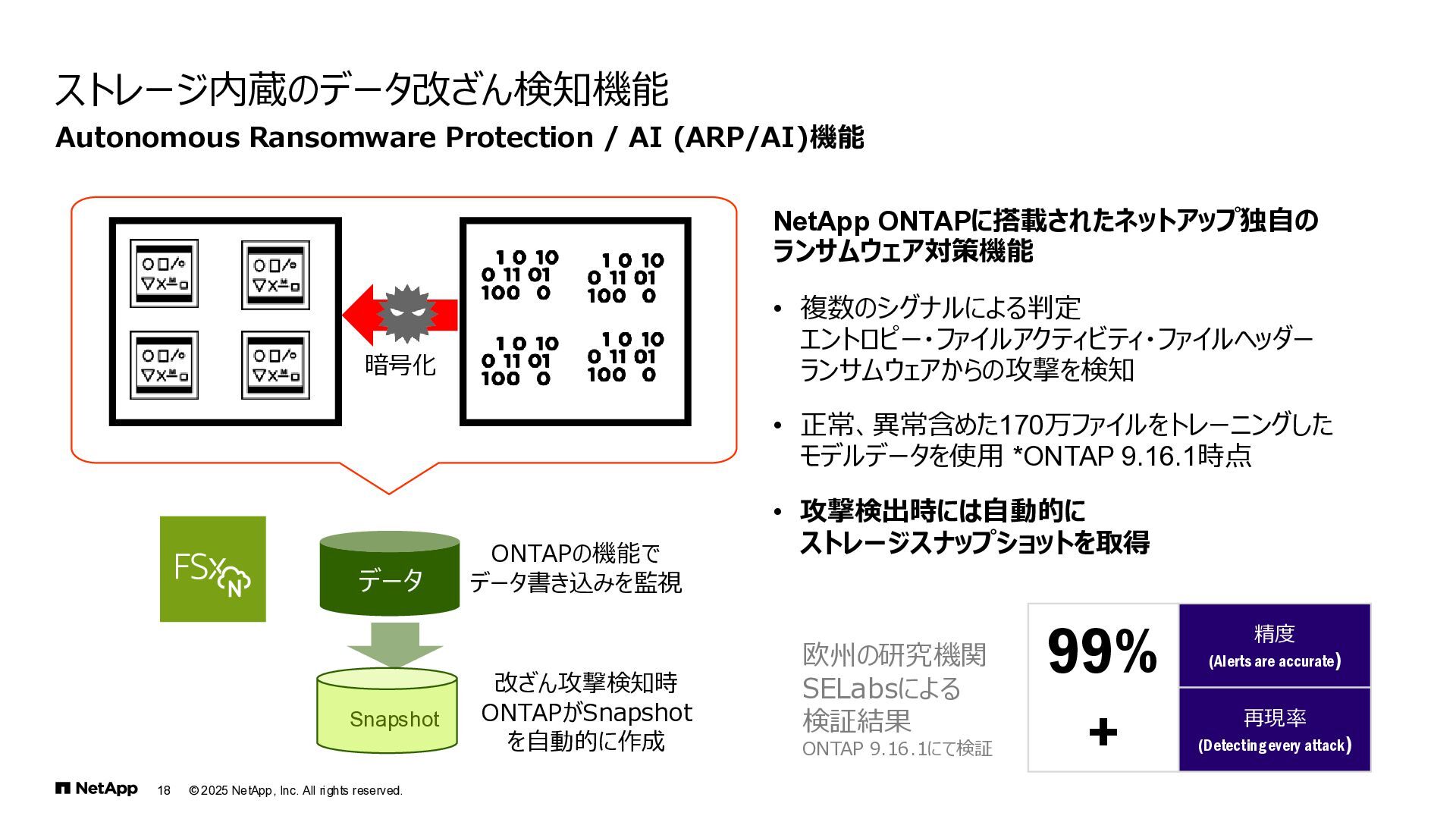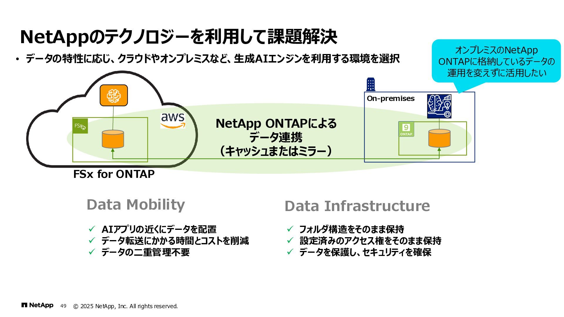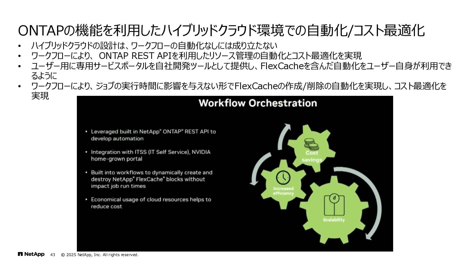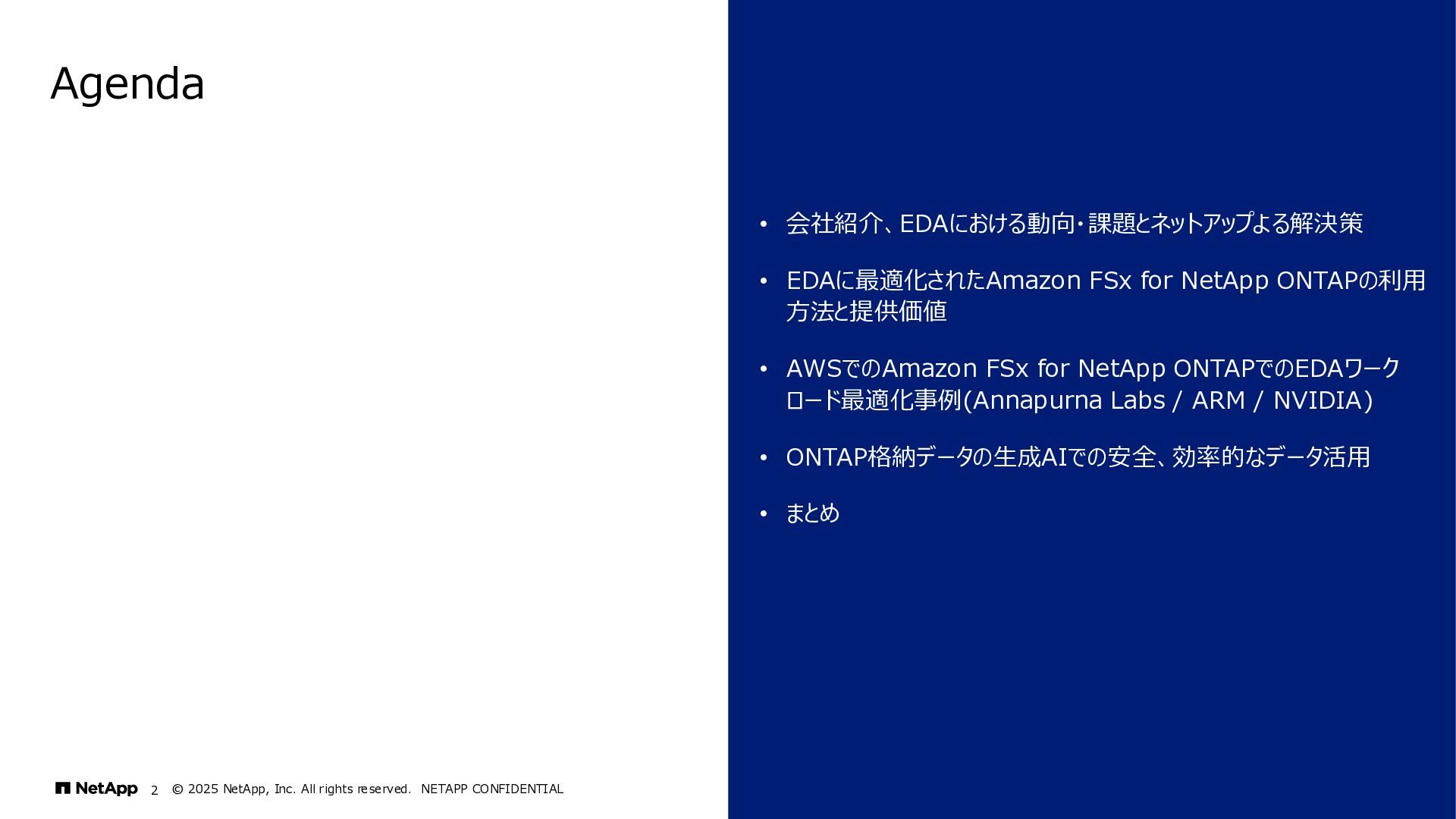 for ONTAPに触れていますが、STG229のセッションは、オン プレのONTAPと他のAWSストレージサービスを利用しているワークロードの詳細が話されています。 AWS re:Invent 2023のArm社関連セッション What’s new with AWS file storage (STG219) https://www.youtube.com/watch?v= yXIeIKlTFV0 ・14:26頃から AWS re:Invent 2023 - HPC on AWS for semiconductors and healthcare life sciences (CMP214) https://www.youtube.com/watch?v= K-2d-pqe5nU ・12:05頃から ・FSx for ONTAPのアイコンが誤ってFSx for Lustreになっています Deep dive on Amazon FSx for NetApp ONTAP scale- out file systems (STG229) https://www.youtube.com/watch?v= FiSjlvn1B8s ・40:03頃から