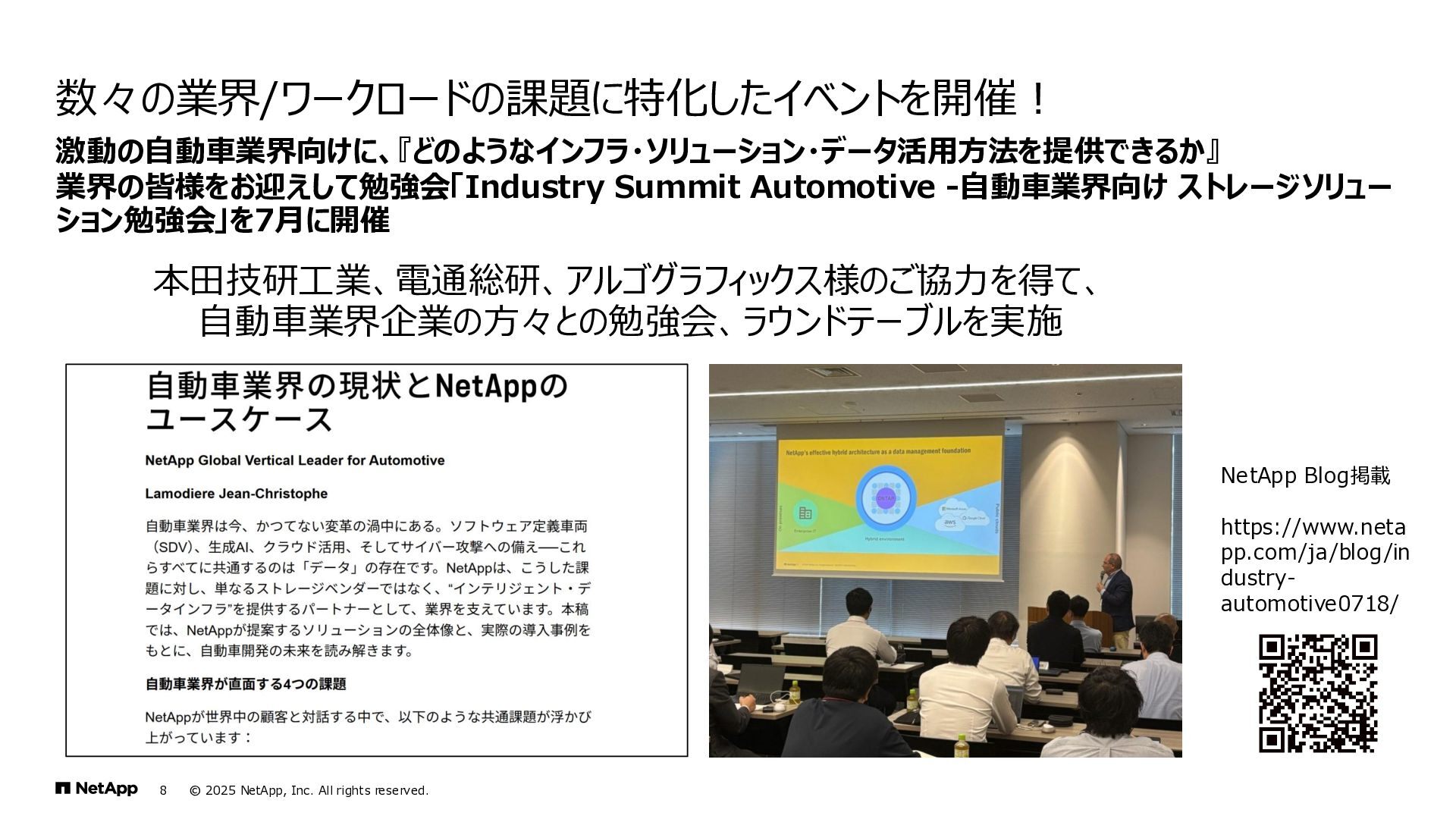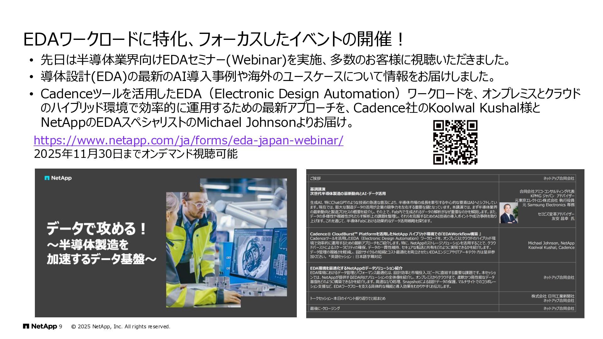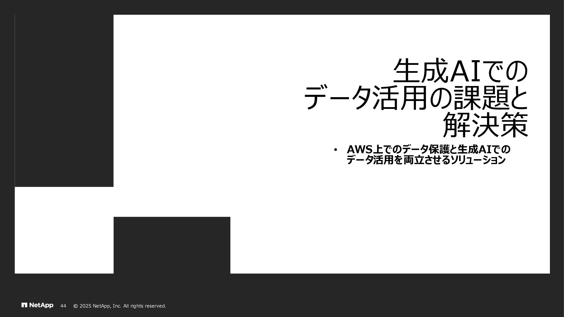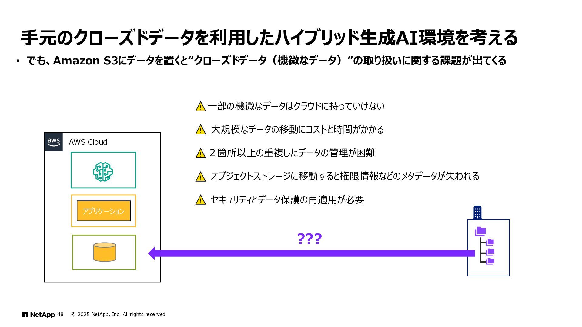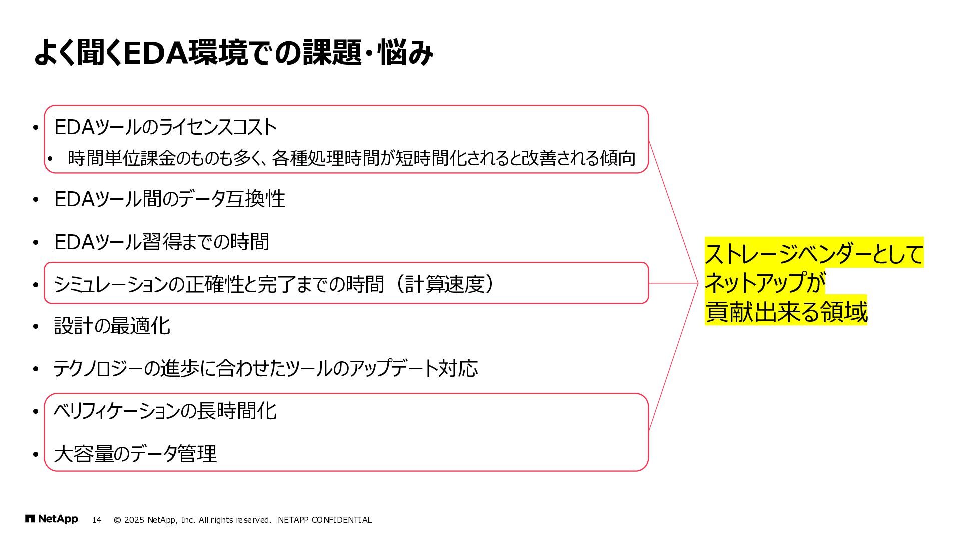 for ONTAPに触れていますが、STG229のセッションは、オン プレのONTAPと他のAWSストレージサービスを利用しているワークロードの詳細が話されています。 AWS re:Invent 2023のArm社関連セッション What’s new with AWS file storage (STG219) https://www.youtube.com/watch?v= yXIeIKlTFV0 ・14:26頃から AWS re:Invent 2023 - HPC on AWS for semiconductors and healthcare life sciences (CMP214) https://www.youtube.com/watch?v= K-2d-pqe5nU ・12:05頃から ・FSx for ONTAPのアイコンが誤ってFSx for Lustreになっています Deep dive on Amazon FSx for NetApp ONTAP scale- out file systems (STG229) https://www.youtube.com/watch?v= FiSjlvn1B8s ・40:03頃から