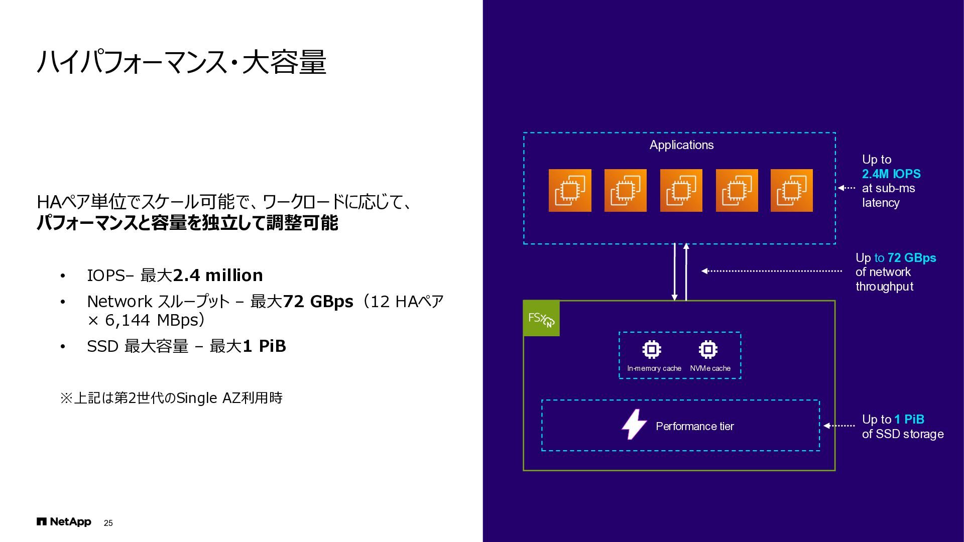 – 最大72 GBps(12 HAペア × 6,144 MBps) • SSD 最大容量 – 最大1 PiB ※上記は第2世代のSingle AZ利用時 ハイパフォーマンス・大容量 Applications Up to 1 PiB of SSD storage Up to 72 GBps of network throughput Up to 2.4M IOPS at sub-ms latency NVMe cache In-memory cache Performance tier