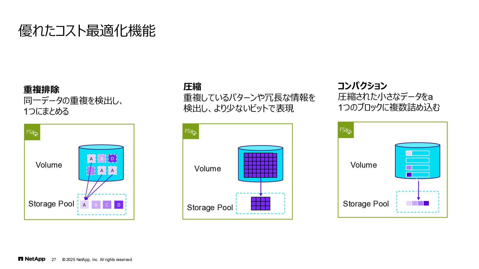 A B A A D Volume Storage pool A B C D Volume Storage Pool Volume Storage Pool Volume Storage Pool 重複排除 同一データの重複を検出し、 1つにまとめる 圧縮 重複しているパターンや冗長な情報を 検出し、より少ないビットで表現 コンパクション 圧縮された小さなデータをa 1つのブロックに複数詰め込む