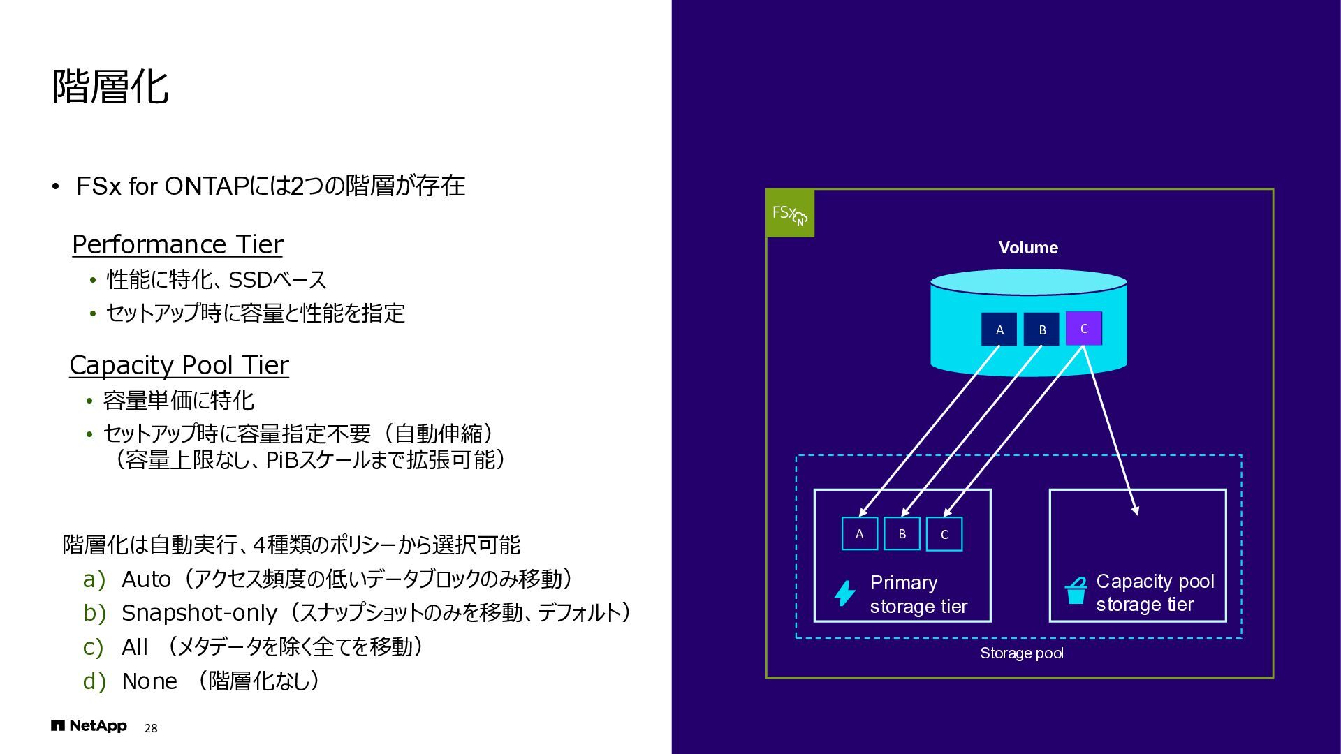 storage tier Capacity pool storage tier Storage pool A B A B C C Performance Tier • 性能に特化、SSDベース • セットアップ時に容量と性能を指定 Capacity Pool Tier • 容量単価に特化 • セットアップ時に容量指定不要(自動伸縮) (容量上限なし、PiBスケールまで拡張可能) 階層化は自動実行、4種類のポリシーから選択可能 a) Auto(アクセス頻度の低いデータブロックのみ移動) b) Snapshot-only(スナップショットのみを移動、デフォルト) c) All (メタデータを除く全てを移動) d) None (階層化なし)