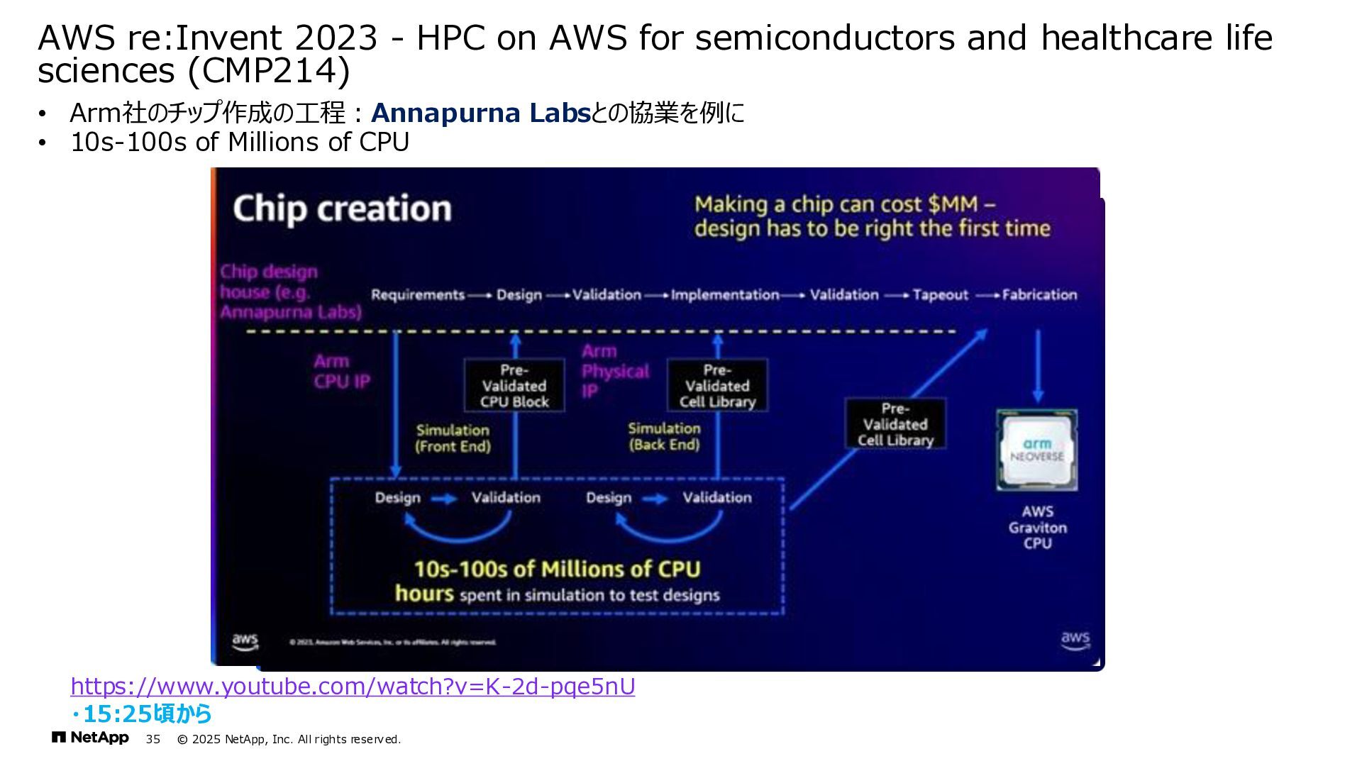 Labsとの協業を例に • 10s-100s of Millions of CPU AWS re:Invent 2023 - HPC on AWS for semiconductors and healthcare life sciences (CMP214) https://www.youtube.com/watch?v=K-2d-pqe5nU ・15:25頃から