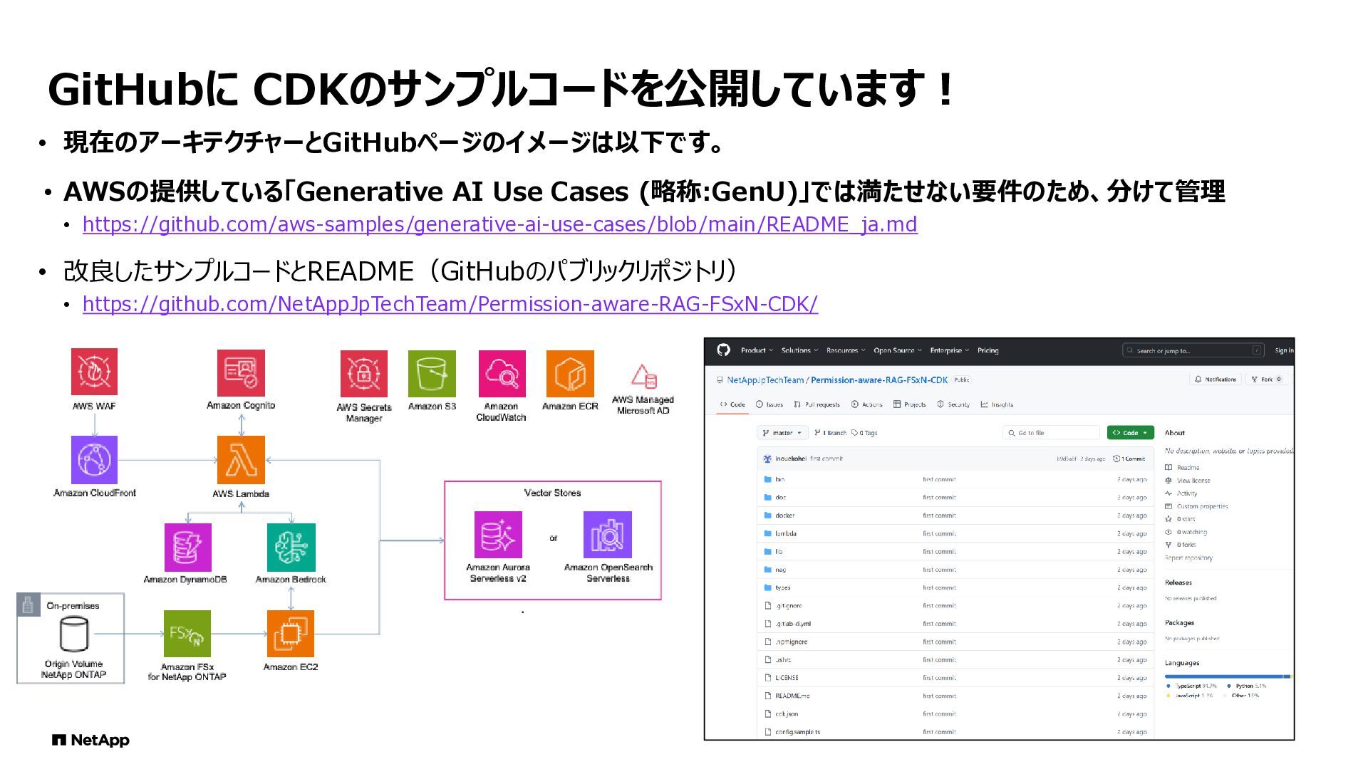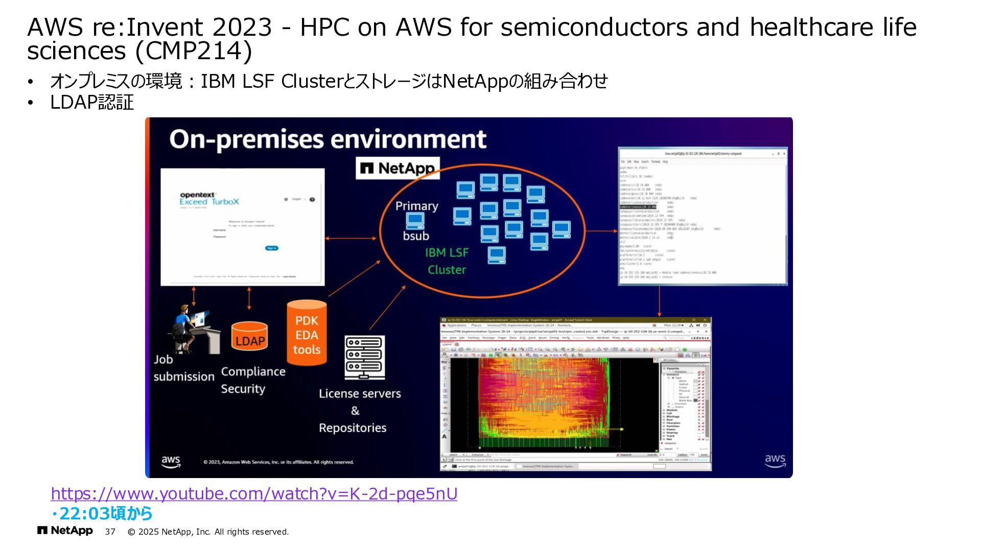 LSF ClusterとストレージはNetAppの組み合わせ • LDAP認証 AWS re:Invent 2023 - HPC on AWS for semiconductors and healthcare life sciences (CMP214) https://www.youtube.com/watch?v=K-2d-pqe5nU ・22:03頃から