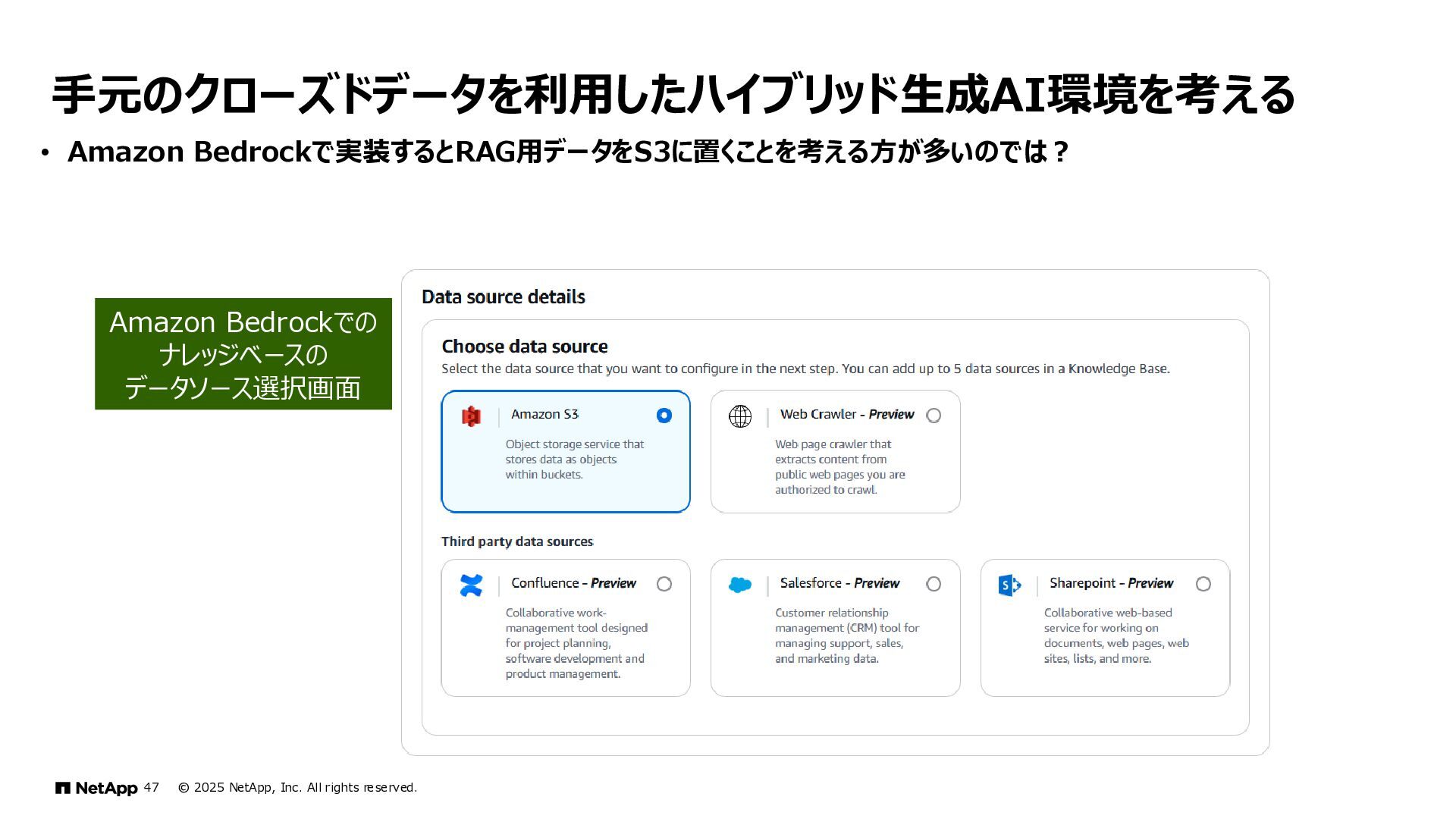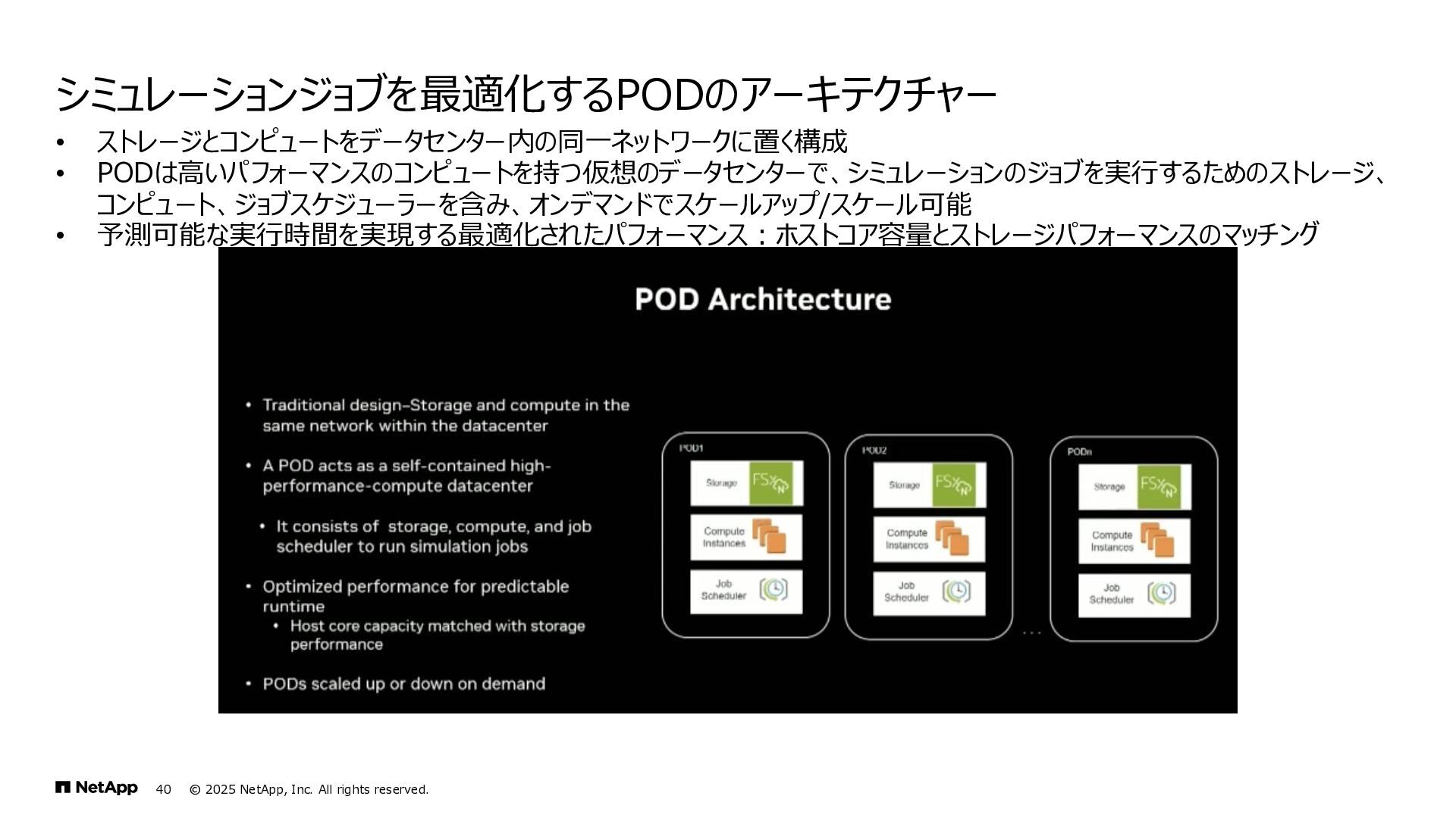 LSF ClusterとストレージはFSx for ONTAPの組み合わせ • IBM LSFライセンスが高価なので、ストレージがボトルネックにならず、スポットインスタンスとライセンスを使い切れるようにデータインポート時間不要で オンプレのデータをシームレスで使えるFSx for ONTAPを利用 • フロントエンドはオンプレミスと同様。HPCワークロードのパフォーマンスの都合上、NFSv3が必須。 AWS re:Invent 2023 - HPC on AWS for semiconductors and healthcare life sciences (CMP214) https://www.youtube.com/watch?v=K-2d-pqe5nU ・22:39頃から ・FSx for ONTAPのアイコンが誤ってFSx for Lustreになっています